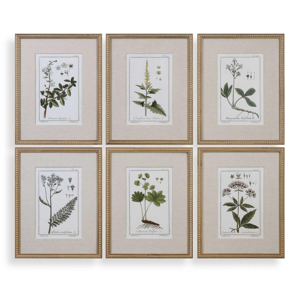 Traditional In Style, These Classic Botanical Prints Bring A Timeless Elegance To A Space. Each Print Is Accented By A Textured, Linen Mat. A Distressed Wooden Frame Finished In Gold Leaf And Accented With Gold Beads Completes Each Piece Of Artwork. Each Print Is Placed Under Protective Glass.