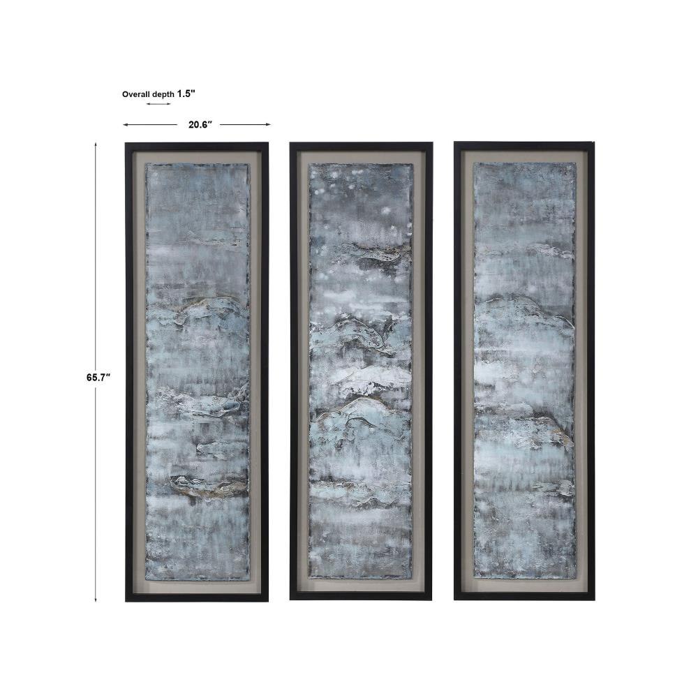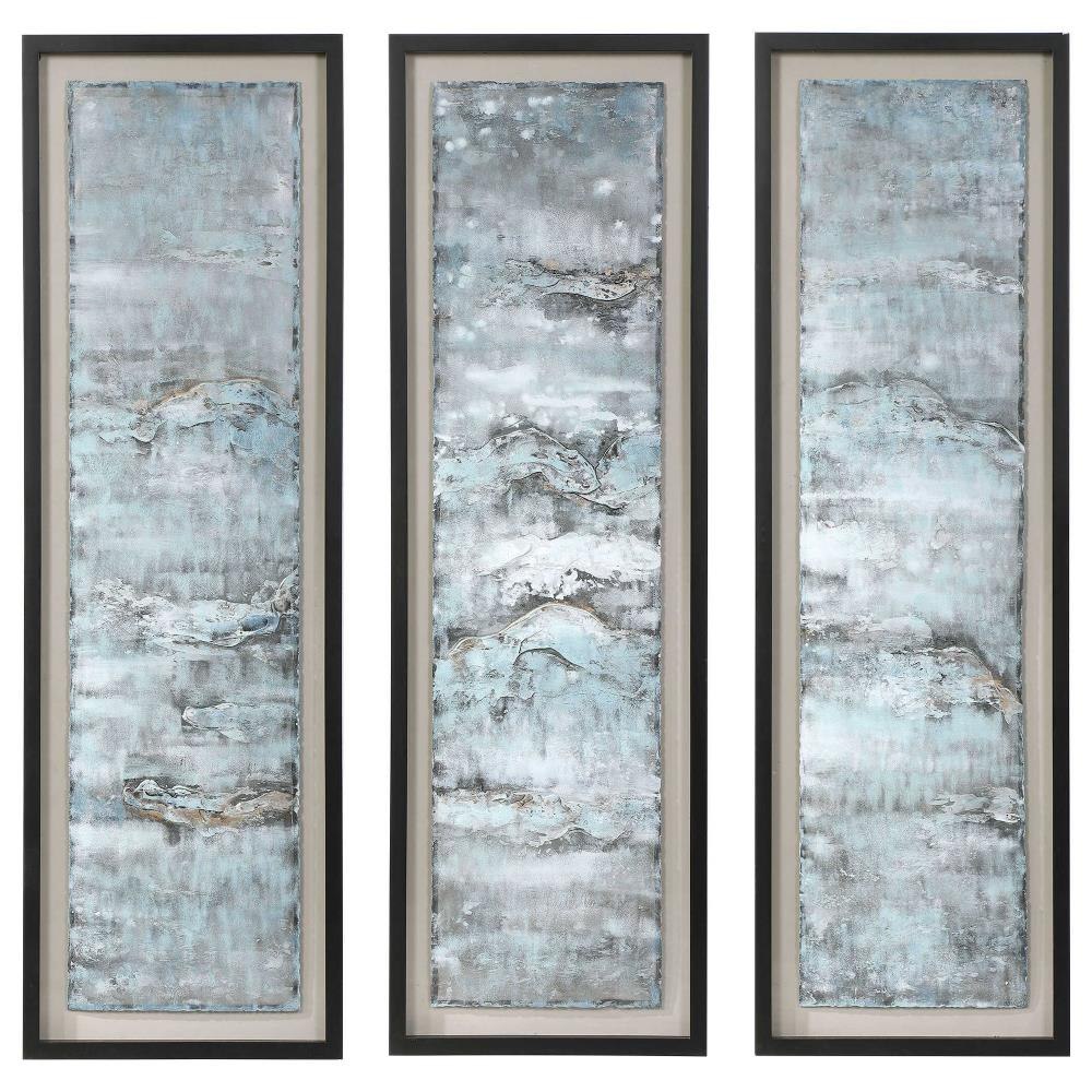 Reminiscent Of Ocean Water, These Metal Sheets Are Hand Painted In Aqua, Gray, Silver And Gold Hues. The Raw Metal Edge Is Softened By Natural Beige Linen Backing And A Matte Black Shadowbox Style Frame Under Glass. Due To The Handcrafted Nature Of This A