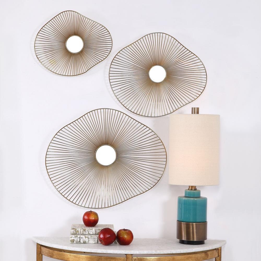 This Contemporary Set Of Three Metal Wall Art Features 3-dimensional Organically Curved Shapes With Radiating Metal Spokes, Finished In A Plated Gold With Mirrored Center Accents. Sizes: Sm-16x13x2, Med-20x18x3, Lg-25x21x3.