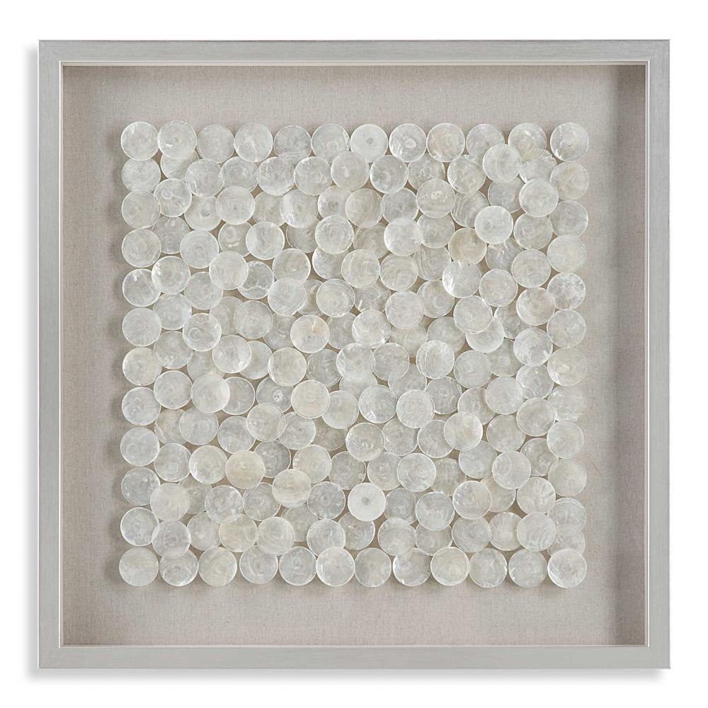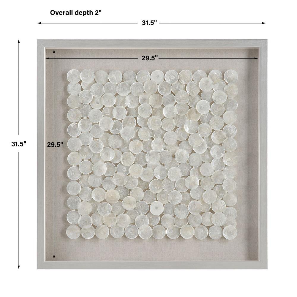 Known As The Windowpane Oyster For It's Transparent Qualities, The Natural Layered Capiz Shells Shimmer In This Shadow Box Style Wall Piece. Placed Over A Flax Toned Linen Backing In A Pine Wood Frame Finished In Brushed Silver.