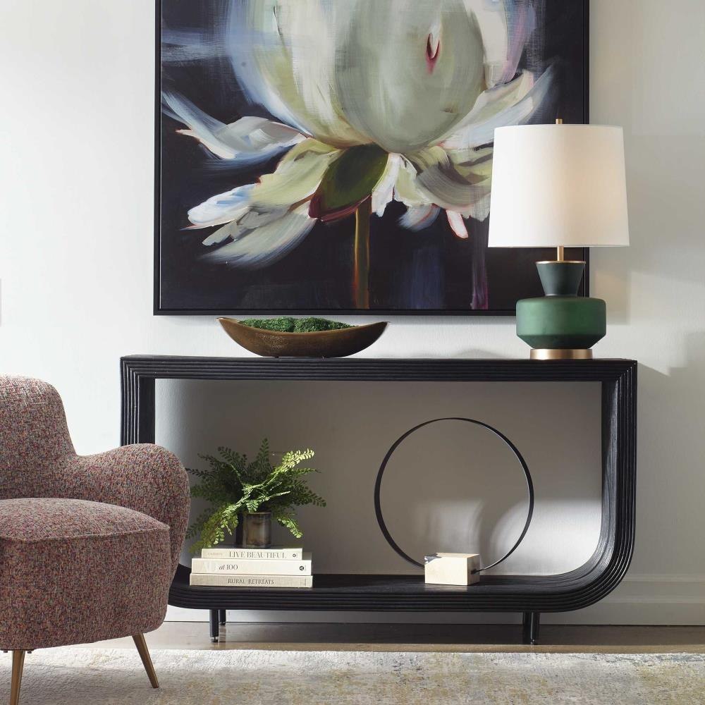 This Console Table Seamlessly Blends Modern Design With Natural Elements. The Console Features Sleek Natural Rattan In A Black Finish That Adds A Contemporary Touch To Any Room.
