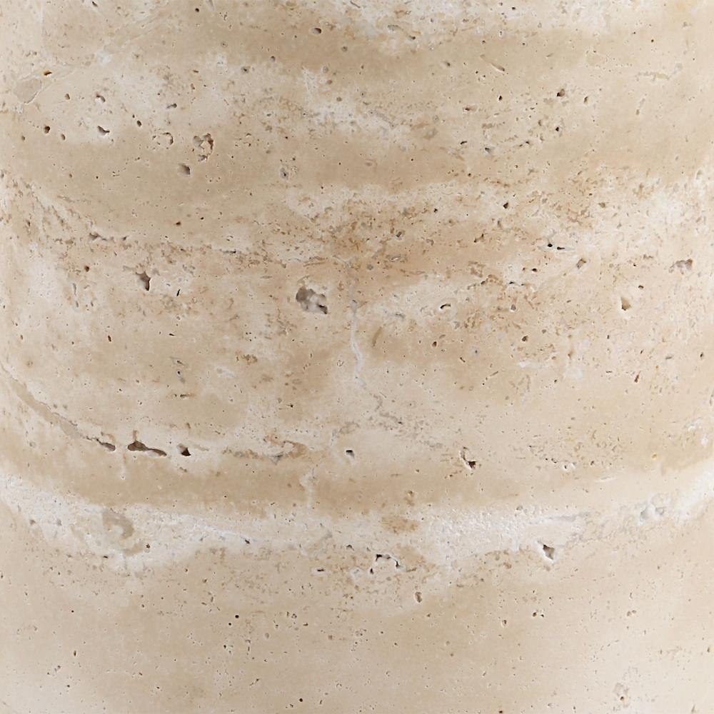 This Accent Table Features A Travertine Top And Base Supported By A Metal Stem In A Rich Brass Finish. The Combination Of These Elements Creates An Organic And Sophisticated Aesthetic, Perfect For Enhancing Any Room.