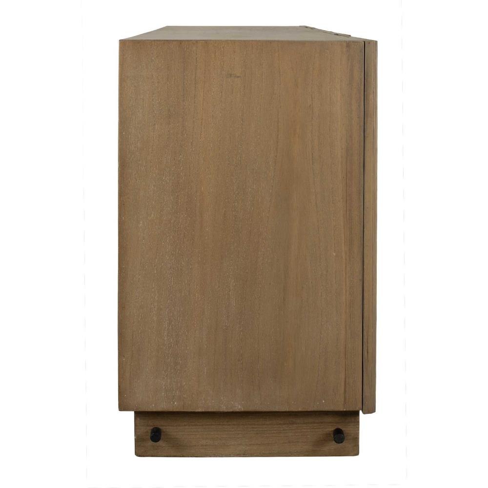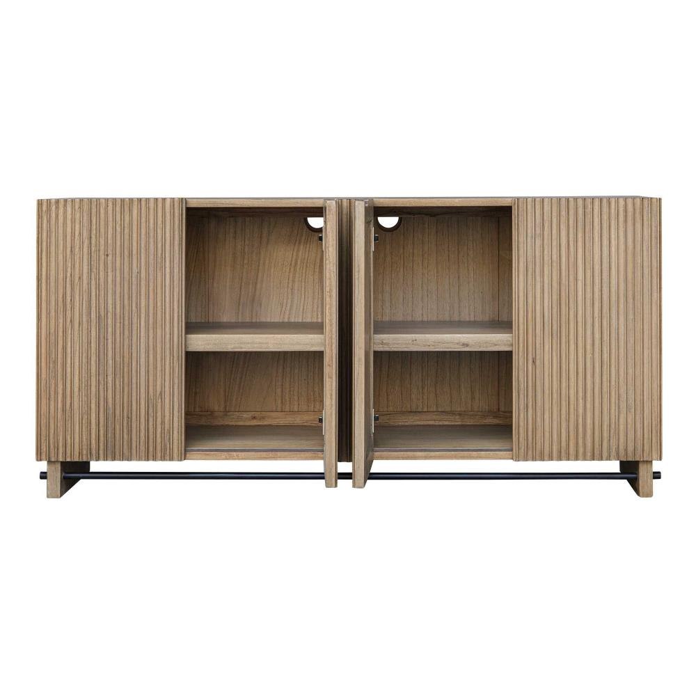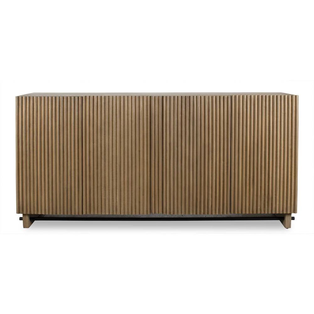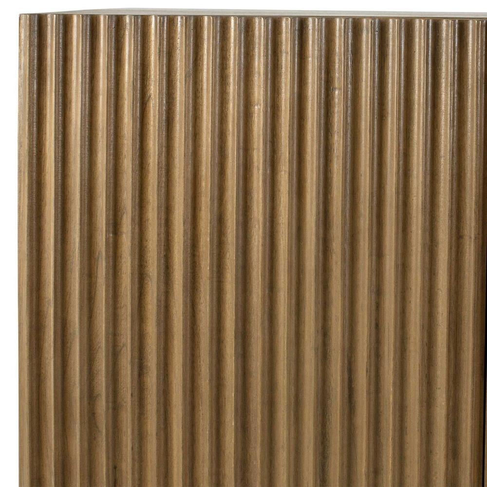 This Mindi Veneer Cabinet Boasts A Warm, Natural Wood Finish, Highlighted By A Captivating Fluted Texture On The Doors, Adding Depth And Character To Its Design. It Is Complemented By An Accent Stretcher Finished In Matte Black.