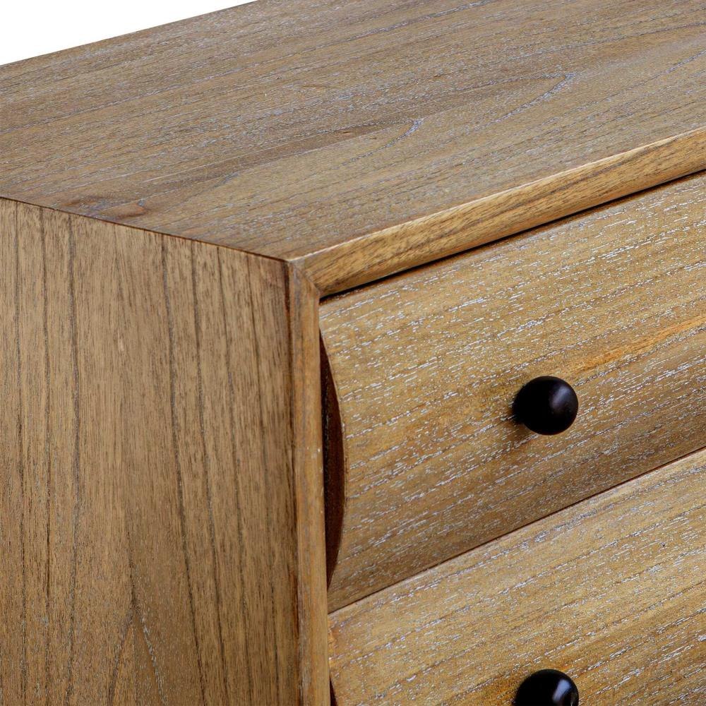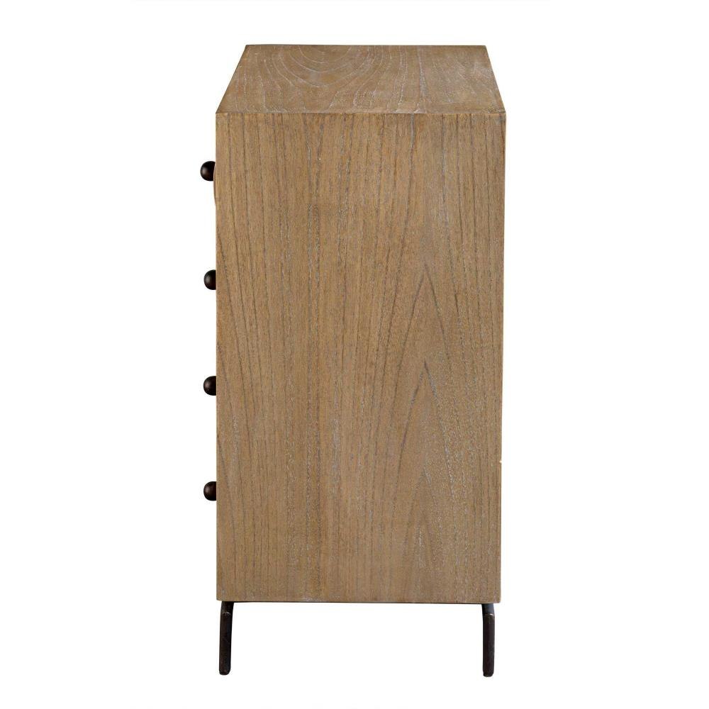 Featuring Mindi Wood In A Warm Natural Finish, Four Curved Drawer Fronts, And Complementary Bronze Hardware, This Accent Chest Effortlessly Combines Natural Elements With Industrial Undertones, Making It A Stylish And Functional Addition To Any Space.