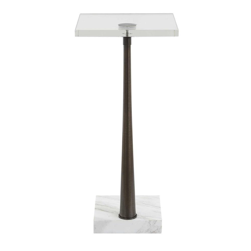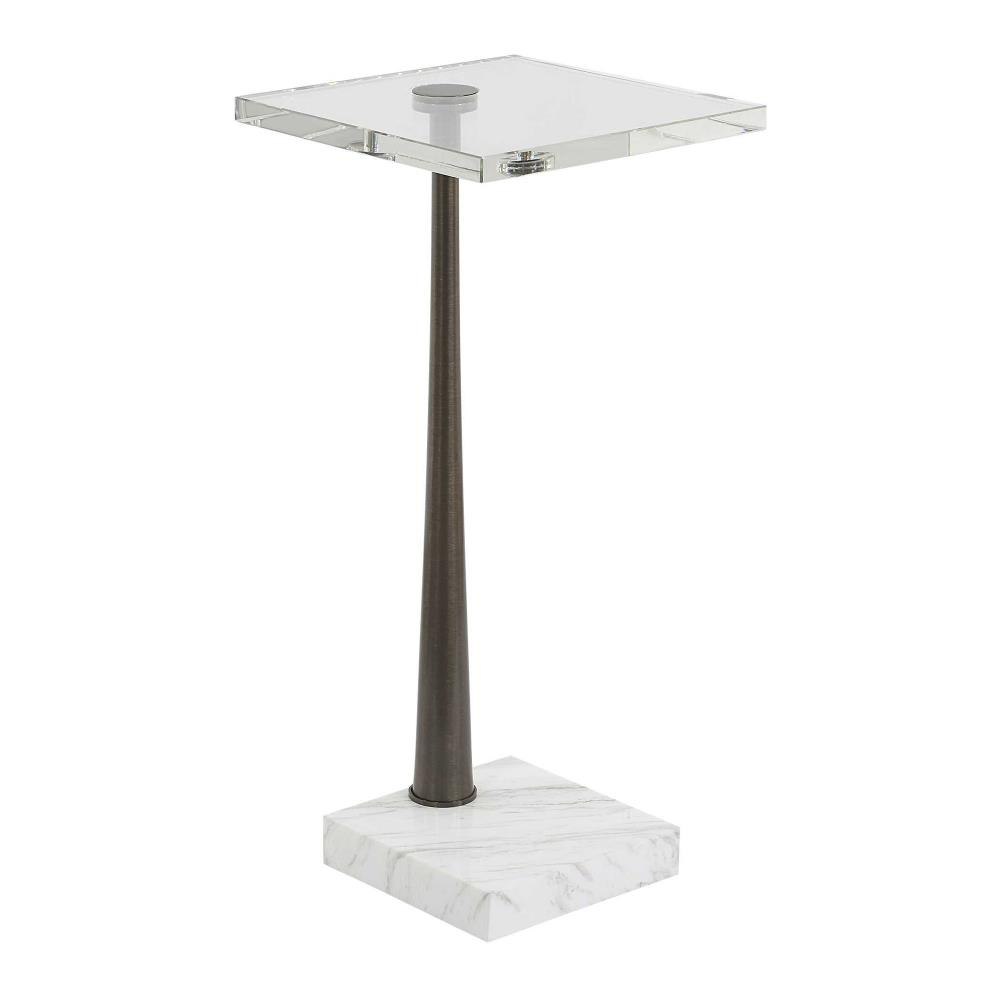 This Drink Table Is A Testament To Refined Craftsmanship, Blending Natural Materials Like Marble And Metal To Create An Eye-catching Piece. Its White Marble Foot With Subtle Gray Veining Is Paired With A Thick Crystal Table Top, All Connected By A Tapered Metal Base In Black. True To The Nature Of Natural Materials, Each Piece Will Have Unique Marbling And Veining Throughout.