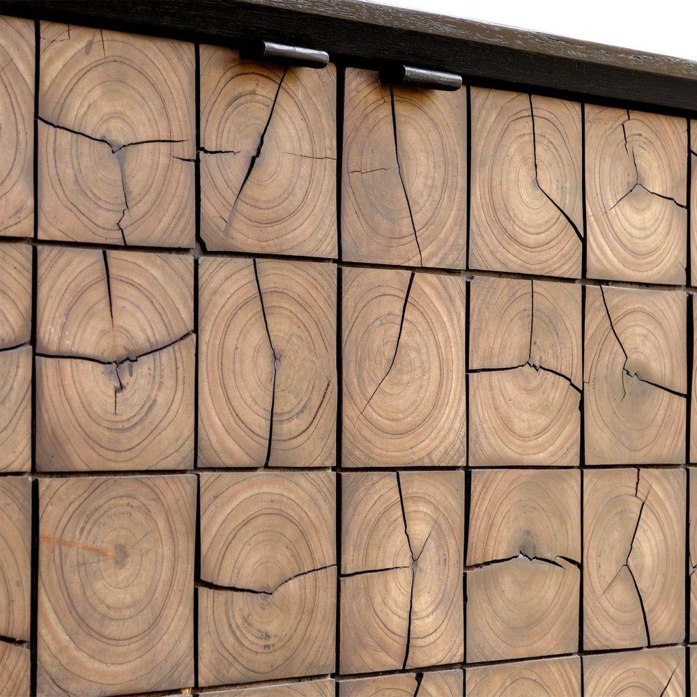 This Two Door Cabinet Is Crafted From Mindi Wood With A Sleek Black Finish. The Cabinet Fronts Feature A Grid Pattern, Highlighting A Worn, Natural Wood Grain That Adds Character And Texture To The Design.