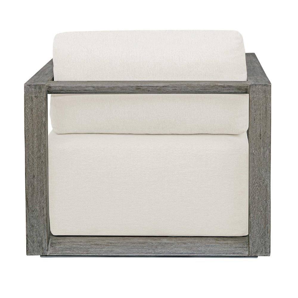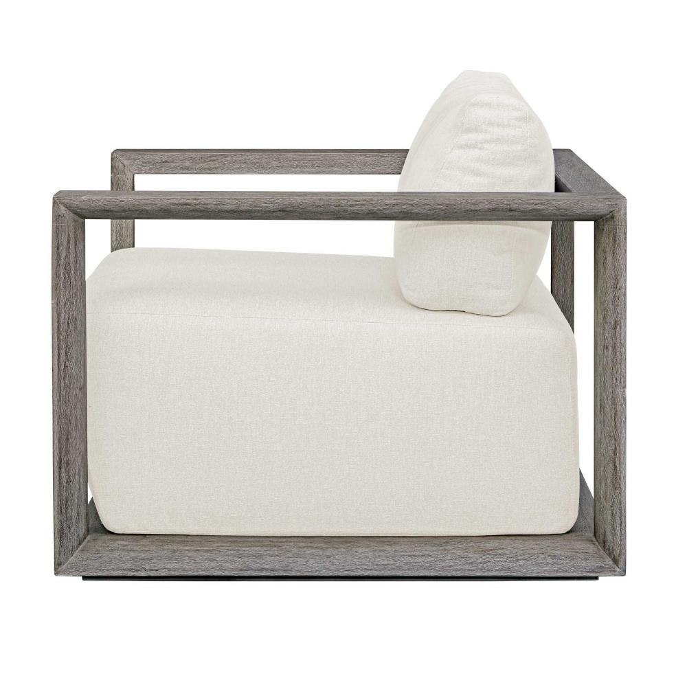 The Remsen Outdoor Lounge Chair Features A Striking Architectural Frame With Smooth Interior Curves That Give A Sculptural Presence. Constructed Of Solid Mahogany Wood In A Weathered Gray Finish With Wire-brushed Details. Its Generously Cushioned Floating Seat, Upholstered In An Oyster White Solution Dyed Acrylic Fabric, Is Designed To Withstand The Moisture And Dirt That Comes With Outdoor Use. Solid Wood Will Continue To Move With Temperature And Humidity Changes, Which Can Result In Cracks And Uneven Surfaces, Adding To Its Authenticity And Character.