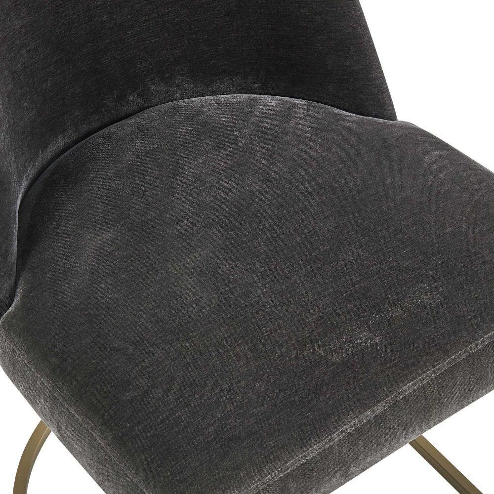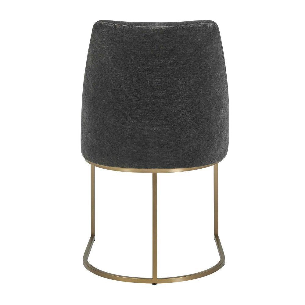 The Hanni Dining Chair Features A Sleek, Curved Steel Frame In A Brass Plated Finish. Upholstered In A Charcoal Polyester Velvet.
