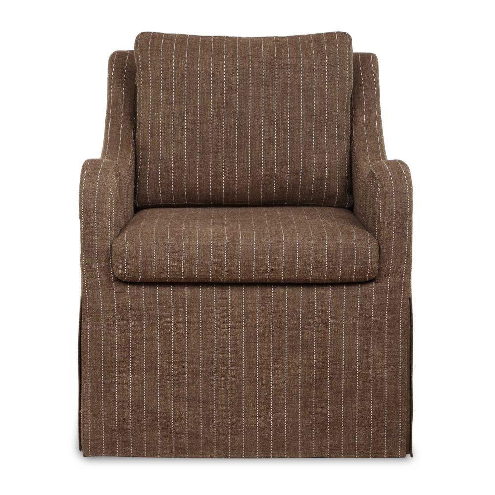 A Fresh Take On A Timeless Classic, This Chair Offers A Perfect Blend Of Style And Function. Featuring A Relaxed Scooped Arm Design And A Convenient Swivel Base, It Is Tailored In A Linen Blend Pinstripe In Cozy Teak Brown.
