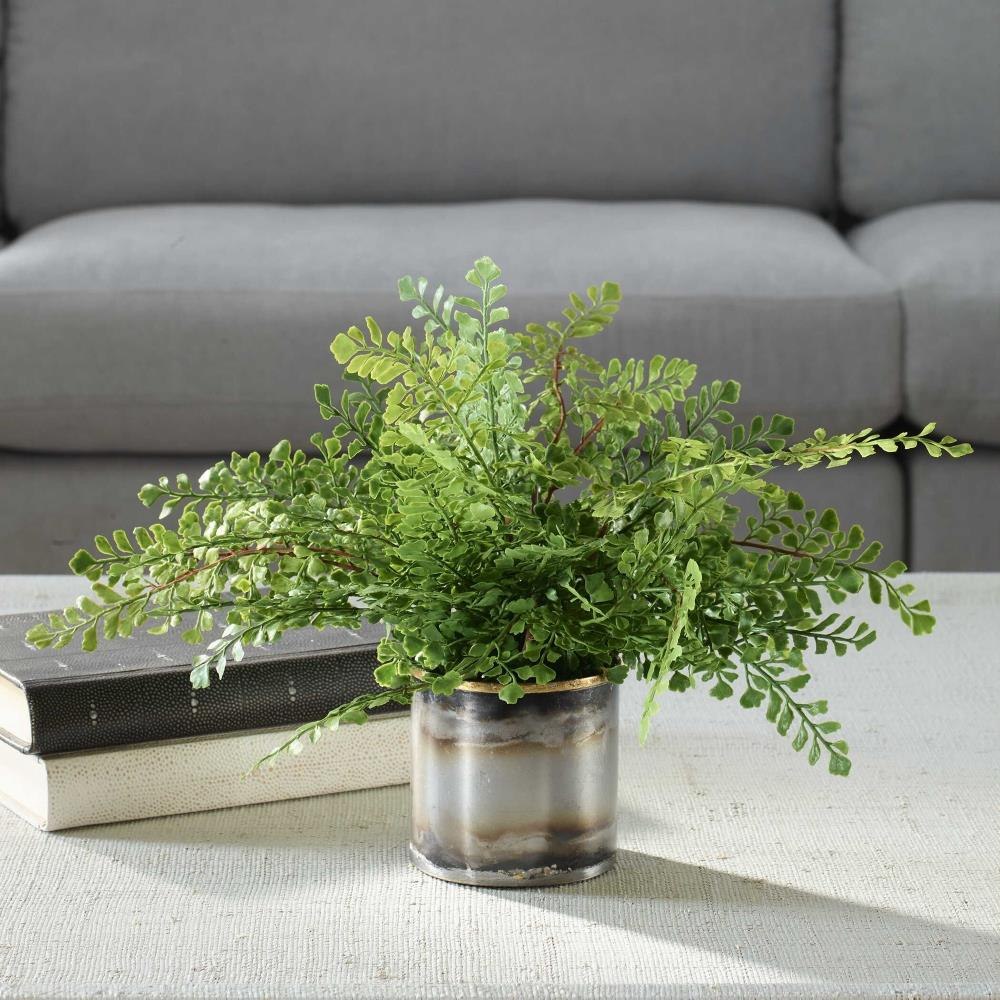 Lush Maidenhair Ferns Add A Touch Of Refreshing And Vibrant Greenery To Any Space, In An Oxidized Metal Container With Gold Accents.