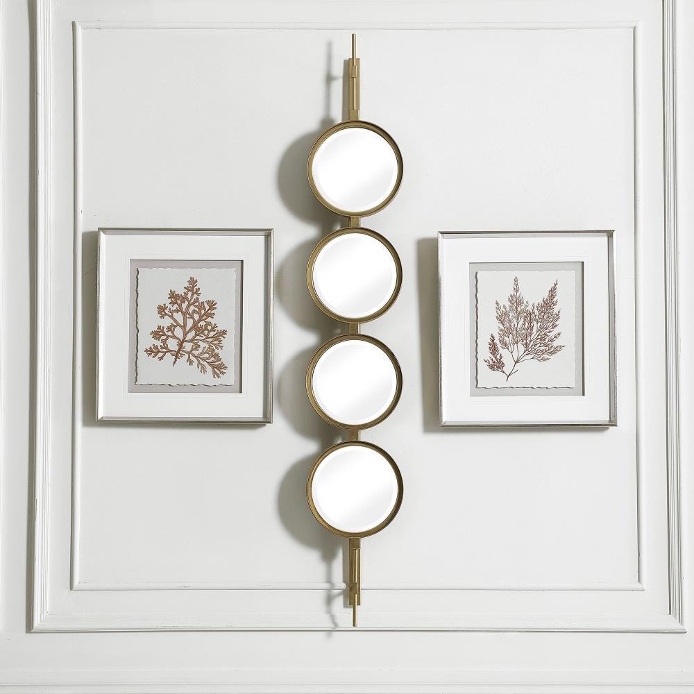 Contemporary In Style, This Mirror Features A Sleek Iron Base With Linear Metal Accents. The Piece Is Finished In Gold Leaf With Four Round Beveled Mirrors. Group Multiple Pieces Together And Hang Horizontal Or Vertical To Create A Truly Unique Wall Feature.