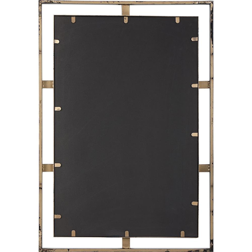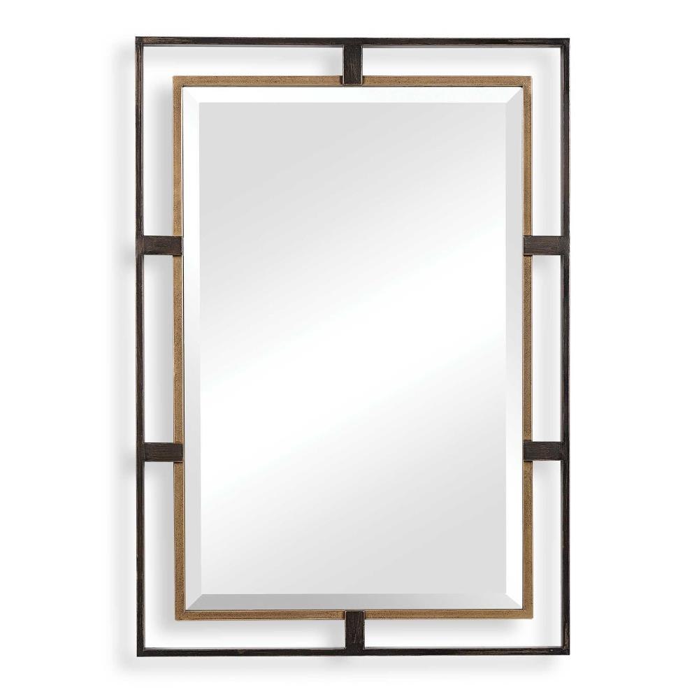 This Iron Frame Features A 3-dimensional Design With An Outer Overlapping Frame Finished In A Distressed Rustic Bronze, Accented With A Lightly Antiqued Gold Center. This Mirror Is Complemented By A 1 Inch Bevel And May Be Hung Horizontal Or Vertical.