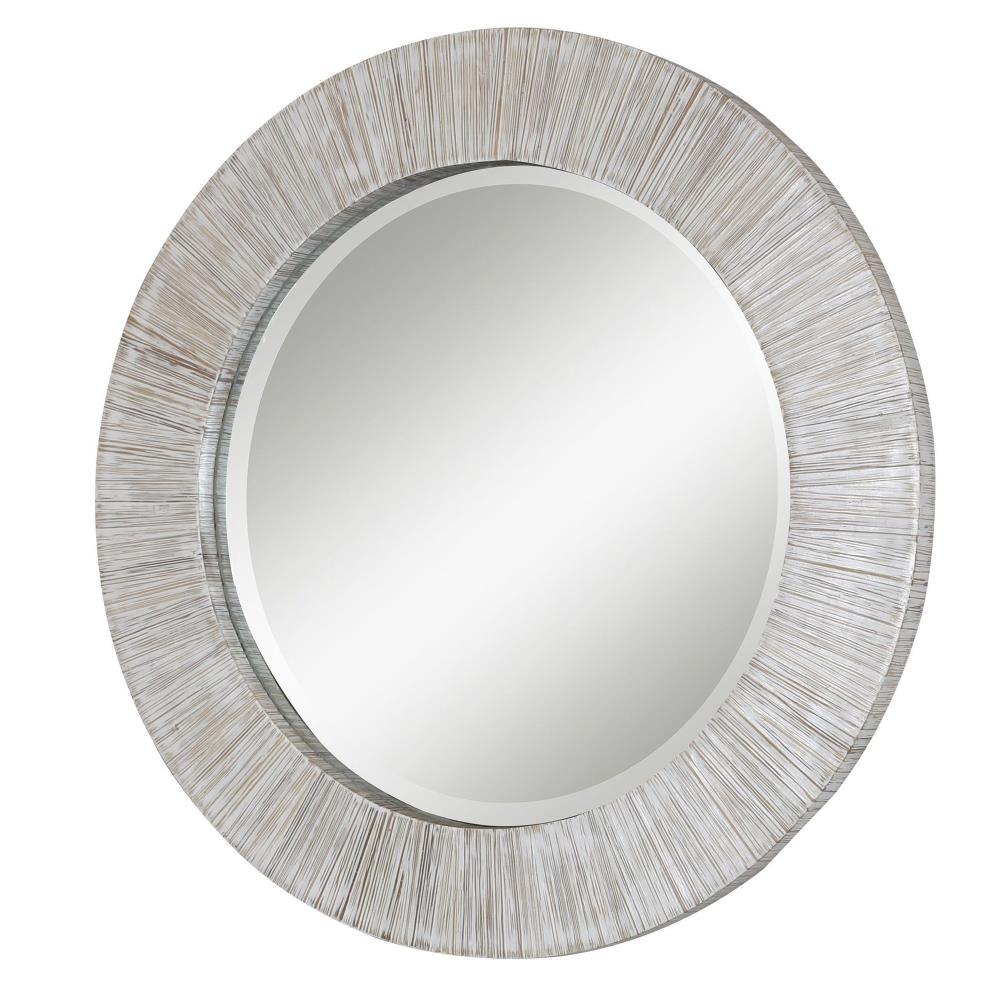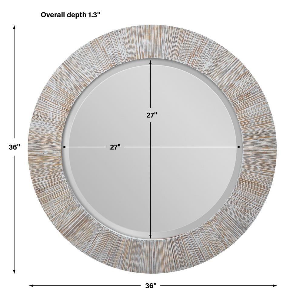 Relaxed Yet Refined, This Round Mirror Sports A Natural Bamboo Frame Accentuated By A Heavily Rubbed Whitewash Finish. The Mirror Features A Large 1 1/2" Bevel.