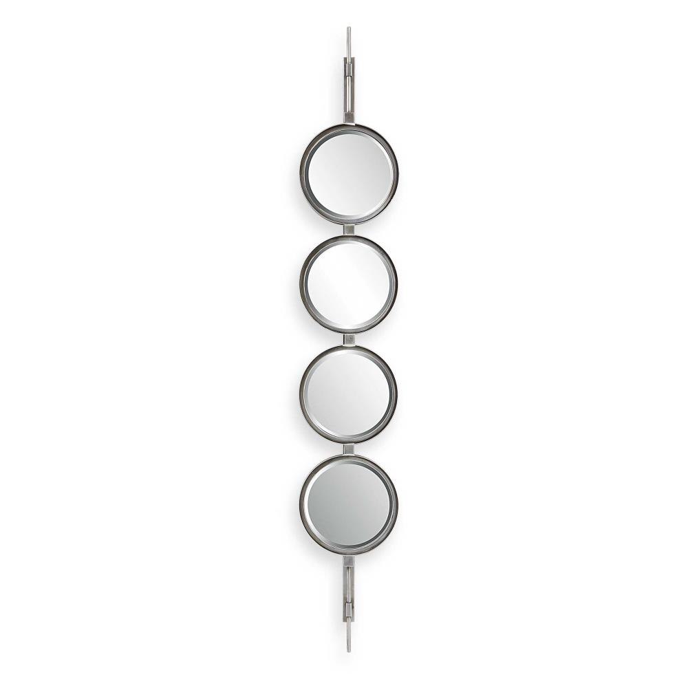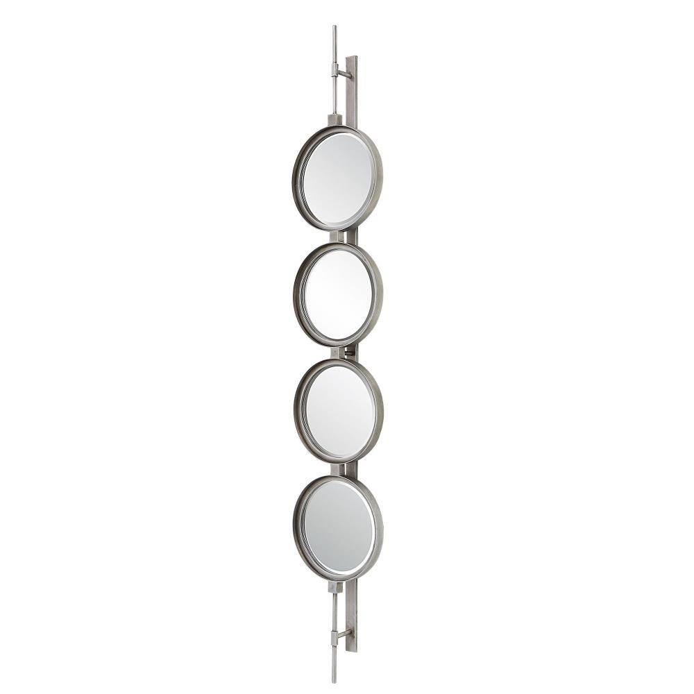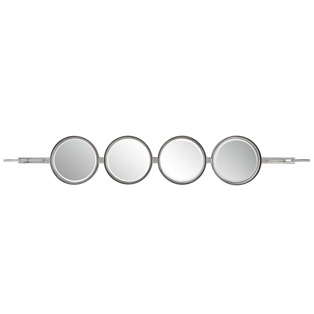Contemporary In Style, This Mirror Features A Sleek Iron Base With Linear Metal Accents. The Piece Is Finished In Silver Leaf With Four Round Beveled Mirrors. Group Multiple Pieces Together And Hang Horizontal Or Vertical To Create A Truly Unique Wall Feature.