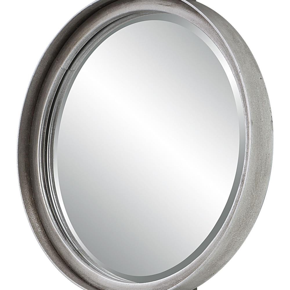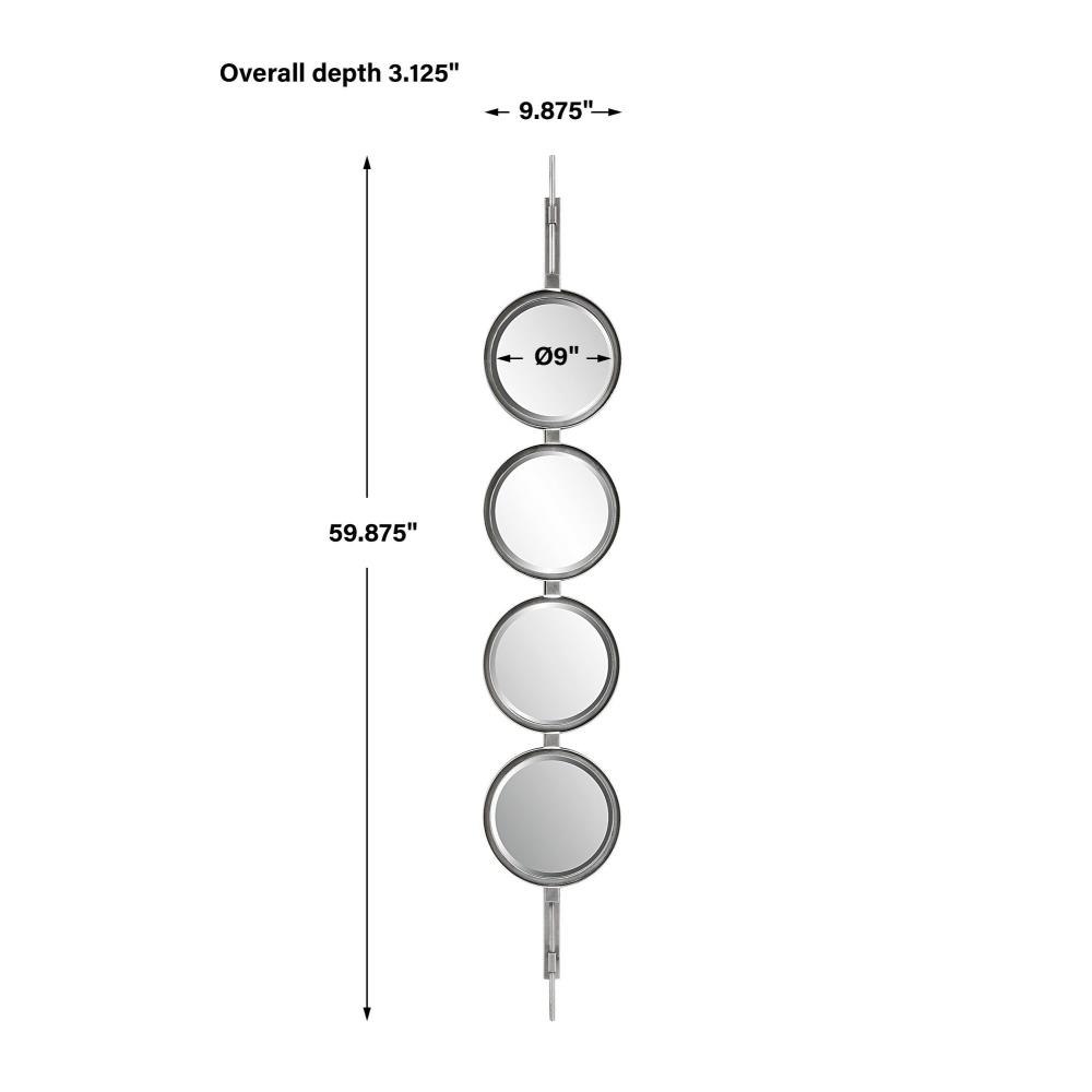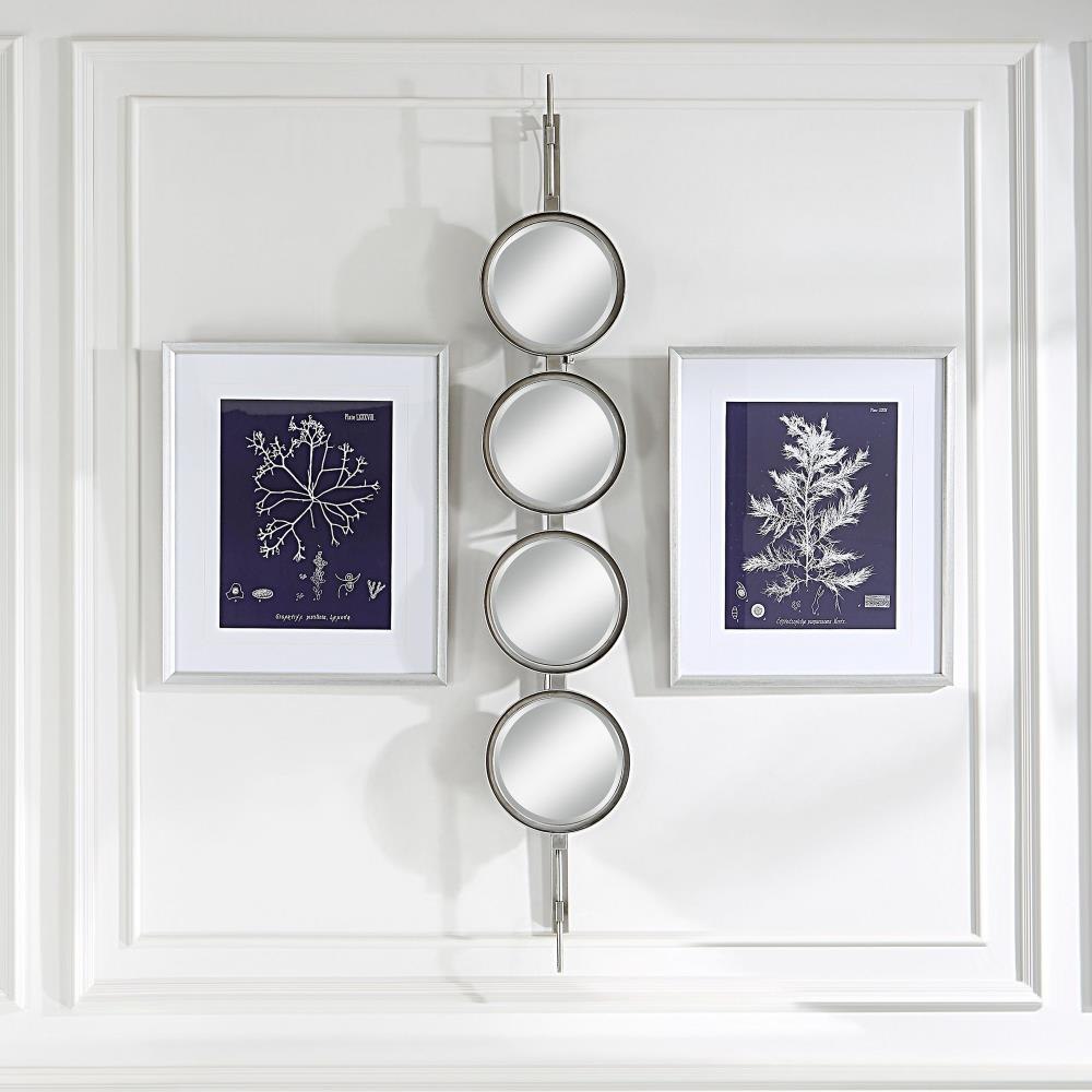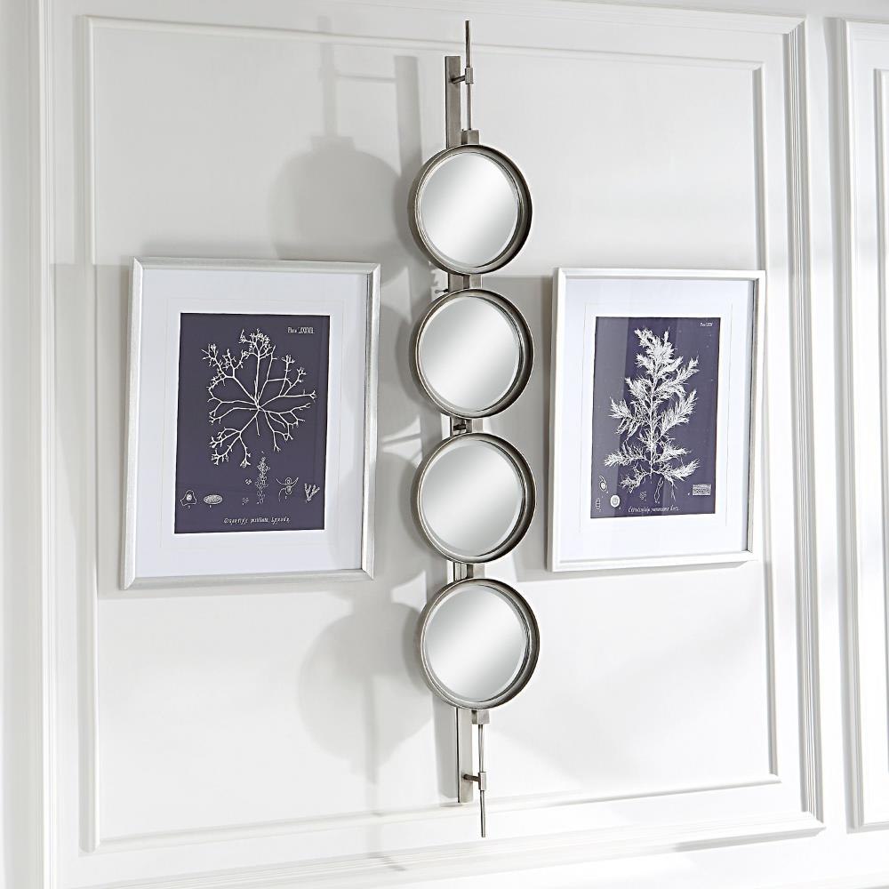 Contemporary In Style, This Mirror Features A Sleek Iron Base With Linear Metal Accents. The Piece Is Finished In Silver Leaf With Four Round Beveled Mirrors. Group Multiple Pieces Together And Hang Horizontal Or Vertical To Create A Truly Unique Wall Feature.