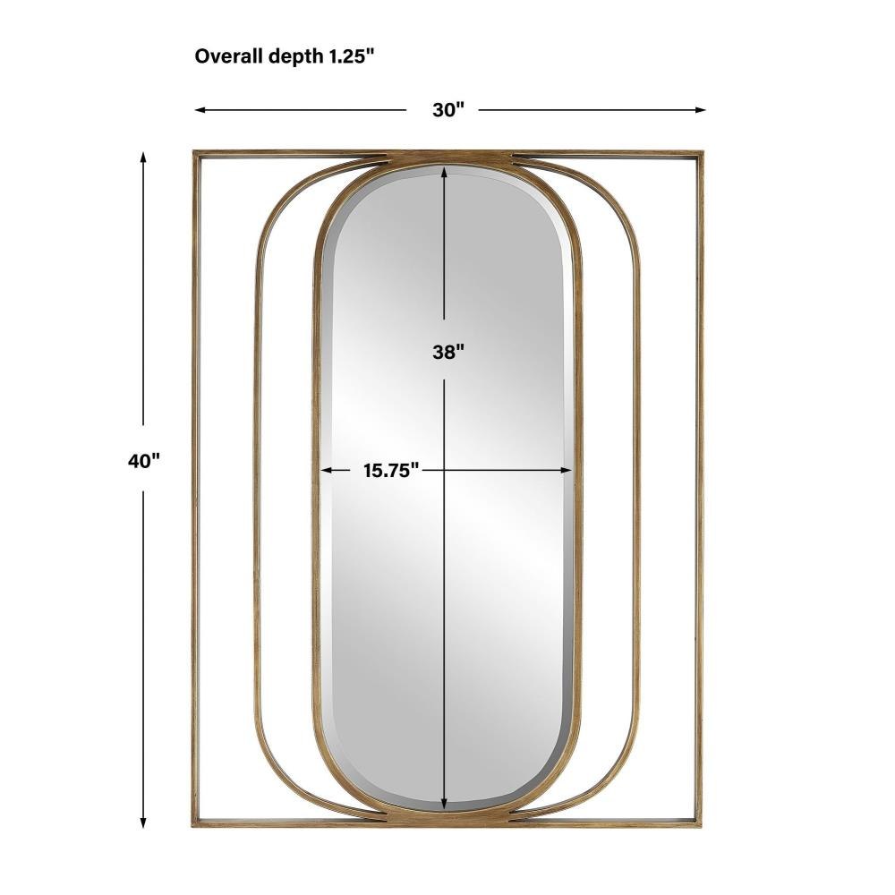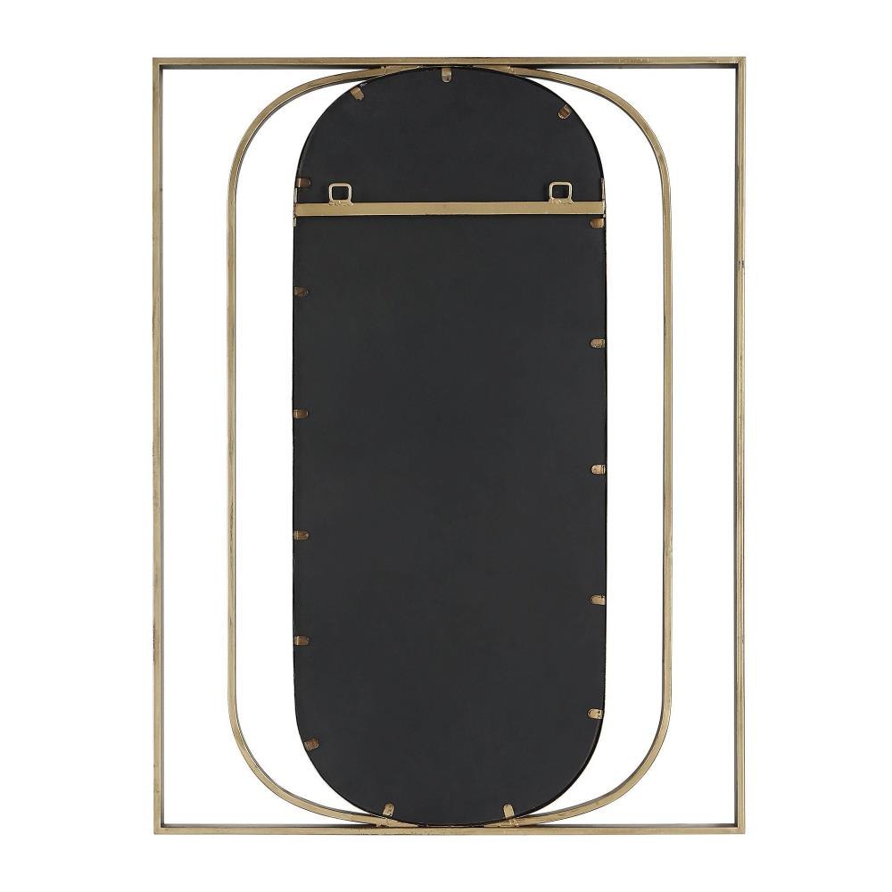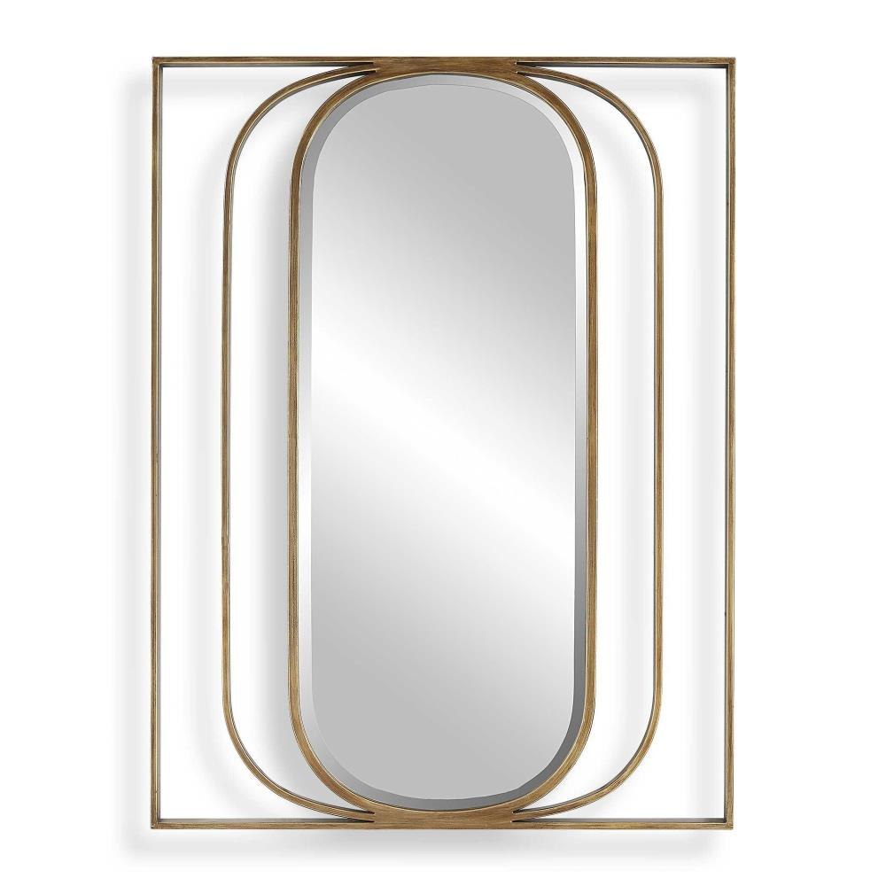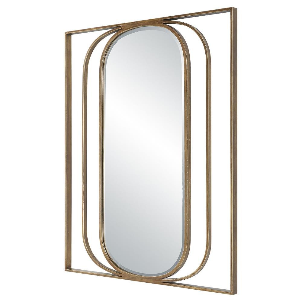 Contemporary Style Mirror Displays A Beveled Oval Interior With An Angular Metal Framework Finished In A Heavily Antiqued Gold. May Be Hung Horizontal Or Vertical.