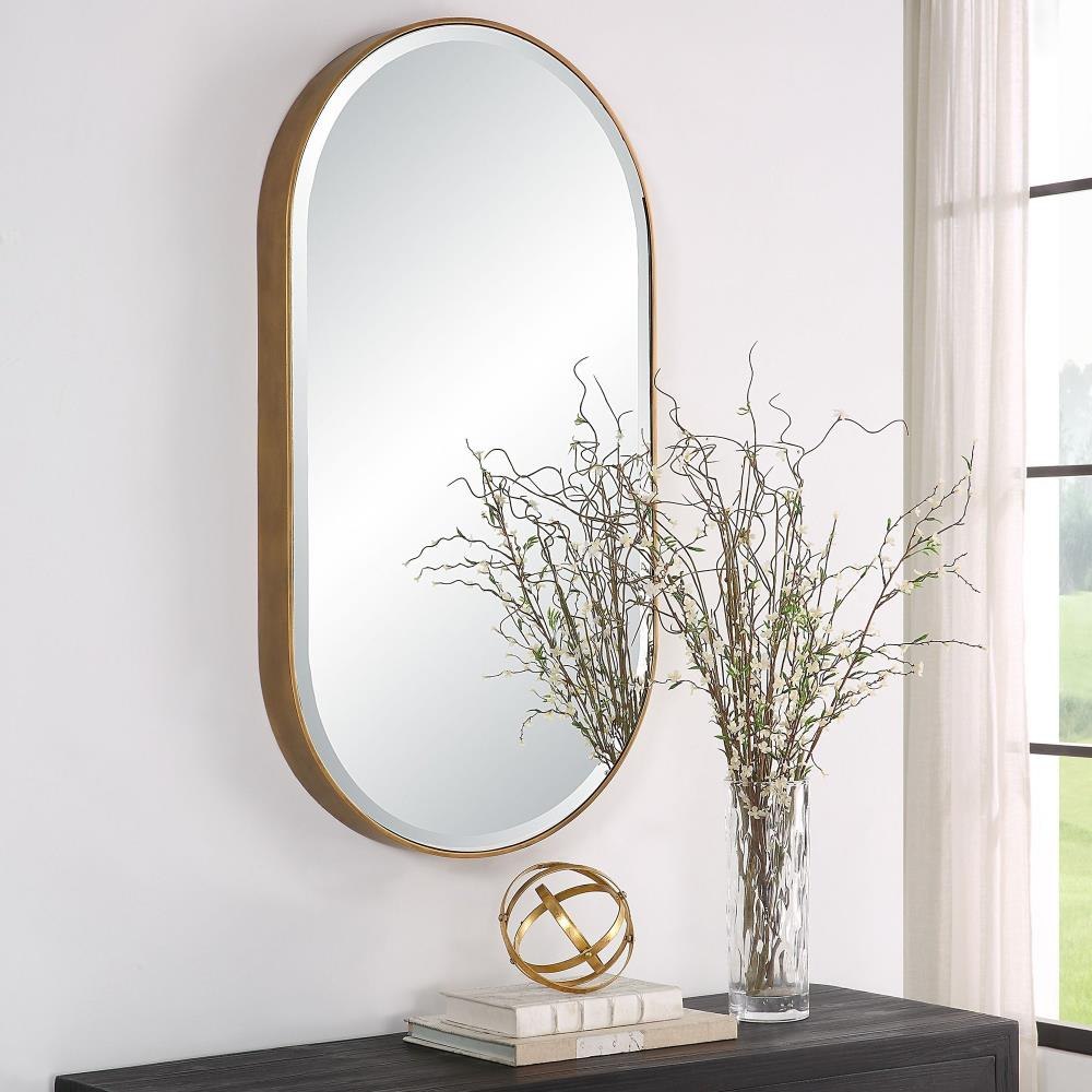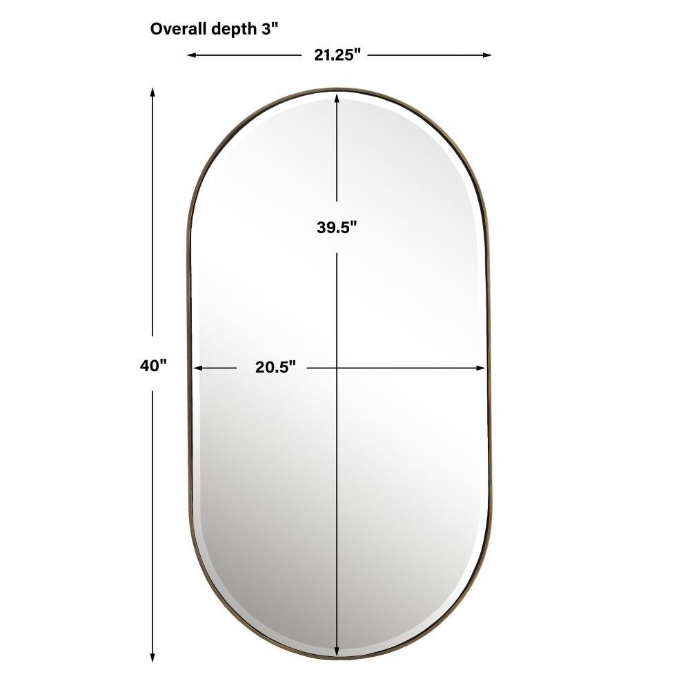 The Lago Oval Features A Petite Iron Frame Surrounding The Bevel Mirror With A Deep Edge That Shows Off The Antiqued Golden Bronze Finish. Mirror Has A Generous 1" Bevel.