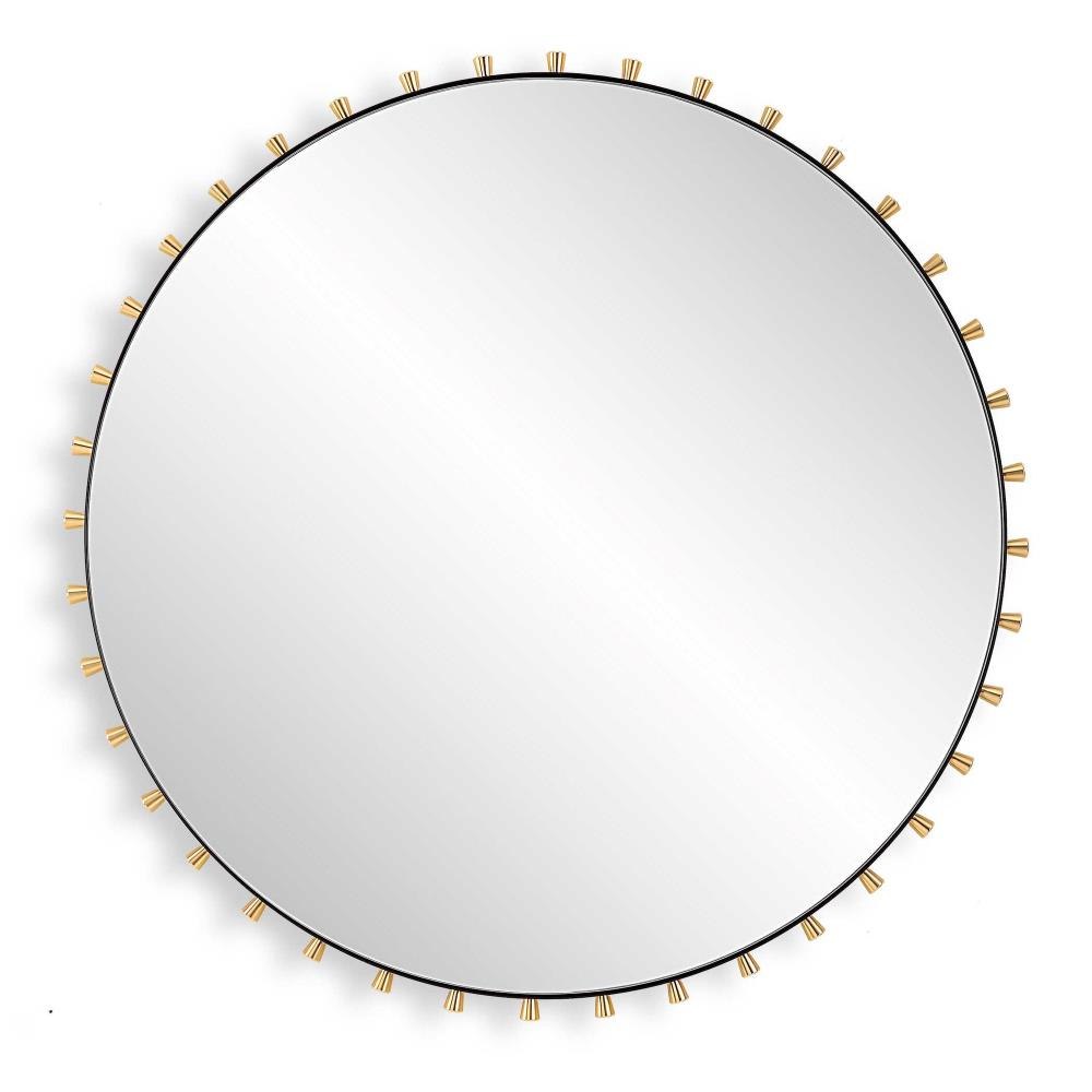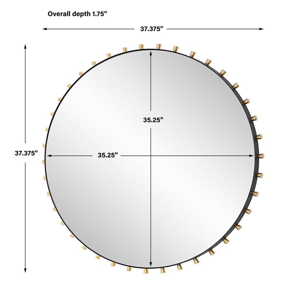 This Modern Round Mirror Features A Iron Frame Finished In Matte Black, Adorned With Brass Plated Tapered Round Pegs Surrounding A Floating Polished Edged Mirror.