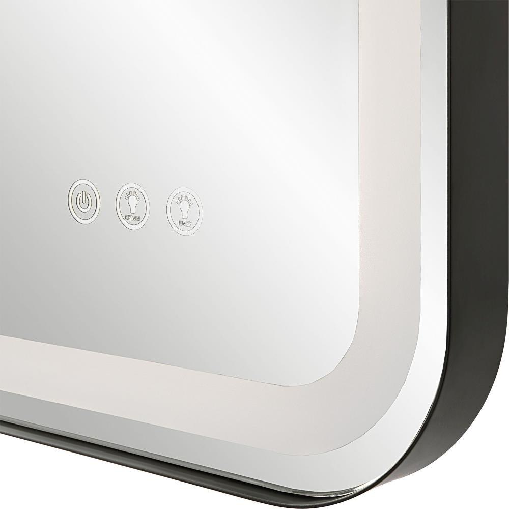 Versatile In Design, This Mirror Has Integrated LED Lighting That Illuminates Through The Frosted Strip In The Polished Edged Mirror. The Metal Frame Is Finished In A Satin Black And Is Off Set From The Wall To Allow Ambient Lighting From The Back. Easy To Use Touch Buttons Are Featured On The Bottom Right Of The Mirror With An On Off Function, Touch And Hold Kelvin Control From 2700k To 4000k, And Touch And Hold Brightness Control. LED Lights Rated At 40,000 Hours. Ships With Plug, But Can Be Hardwired Professionally. Touch Screen Icons Continue To Illuminate When Powered Off For Easy Navigation In Dark Settings.