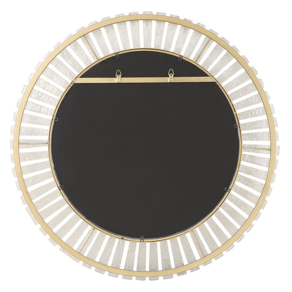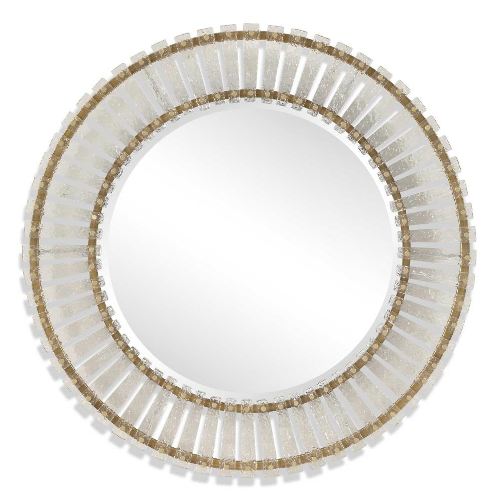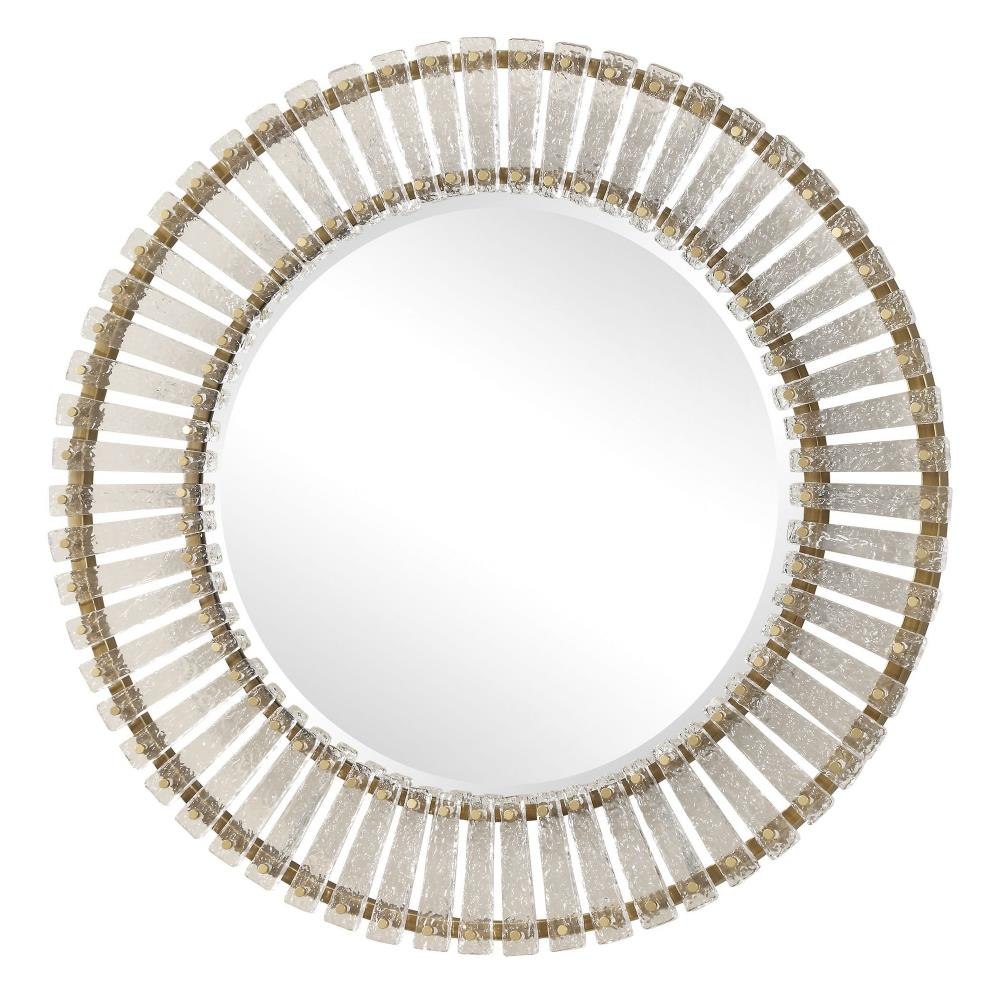 The Denali Round Mirror Features Textured Glass Keys Suspended Around Brushed Gold Iron Frames. Mirror Has A Generous 1" Bevel.