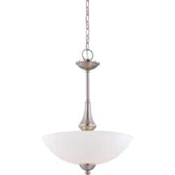 The classically inspired Patton three-light pendant from Nuvo is both beautiful and versatile. A soft, brushed nickel and frosted glass finish makes this piece the perfect elegant addition to any setting.