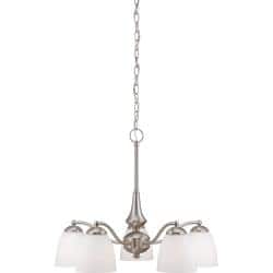 The classically inspired Patton five-light chandelier from Nuvo is both beautiful and versatile. A soft, brushed nickel and frosted glass finish makes this the perfect, elegant addition to any setting.