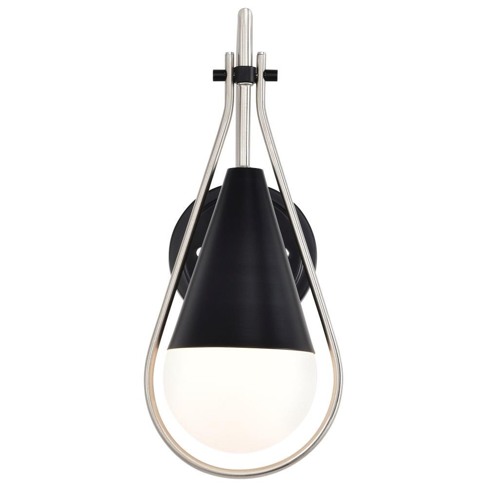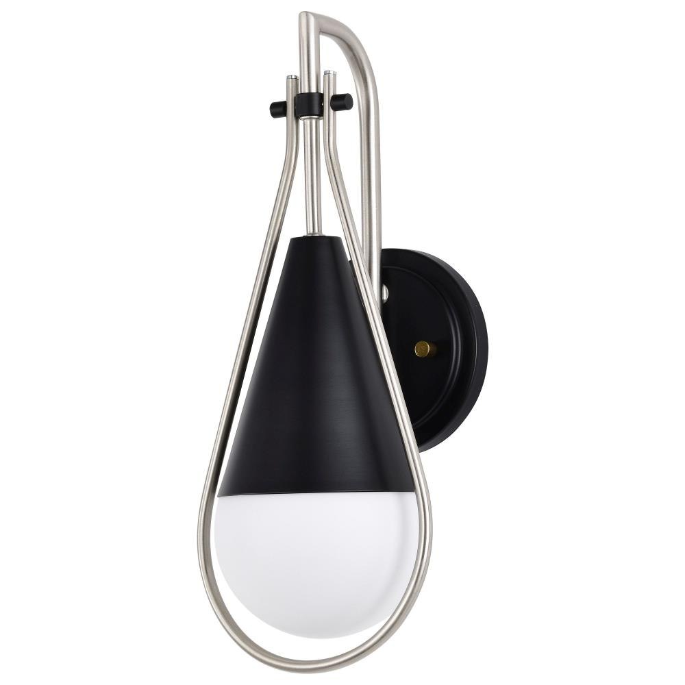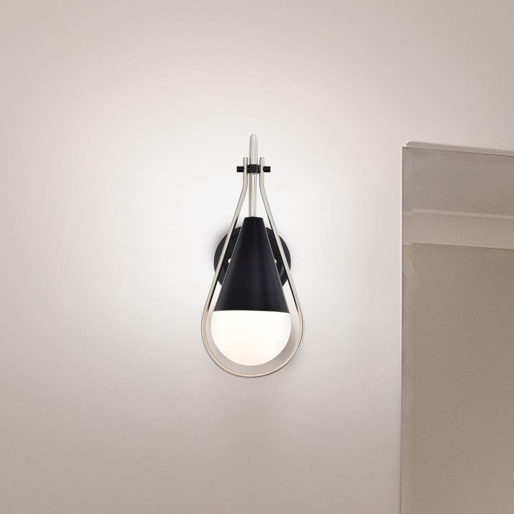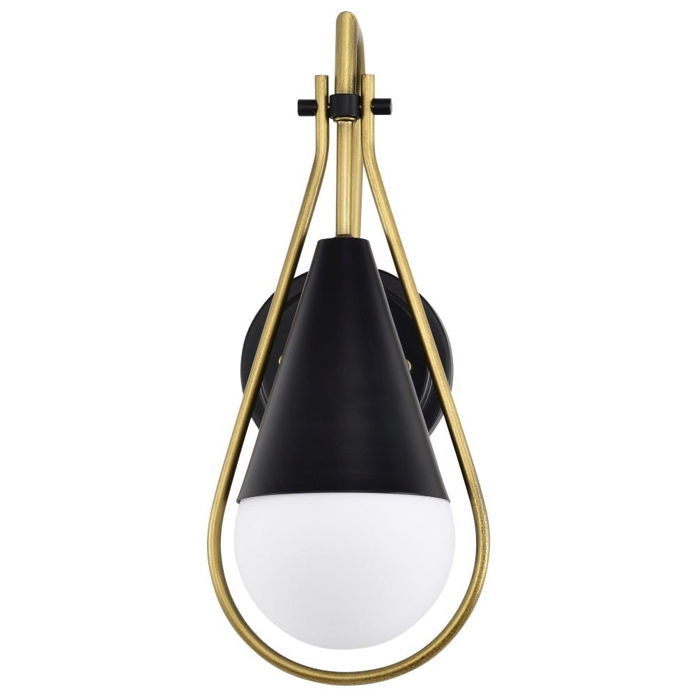 A modern collection with a twist, the Admiral 60-7901 one light wall sconce features a dual finish, unique design, and a fashionable statement for home luminaires. A suspended tear-dropped shape is comprised of matte black with natural brass elements encompassing the fixture. The white opal glass orb shields the light source for smooth, even lighting to bring a warm glow to any space. A beautiful design that is versatile and will compliment a variety of home decors.