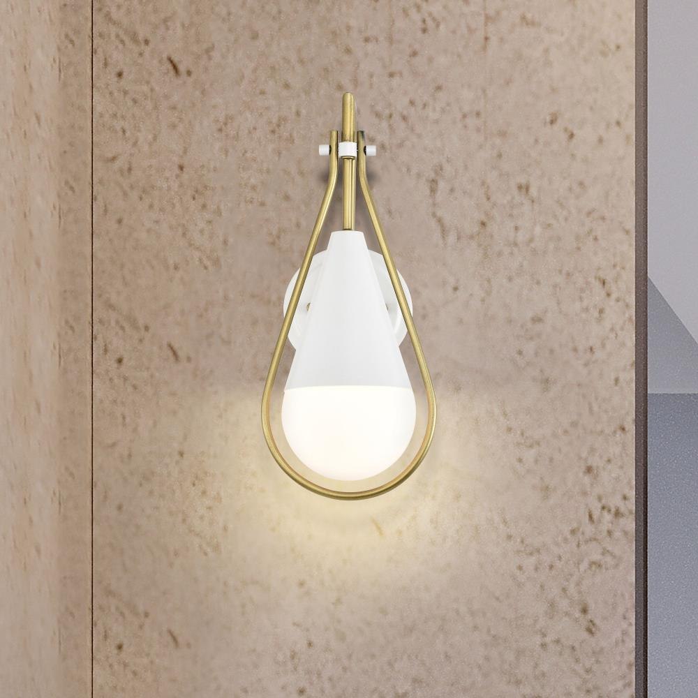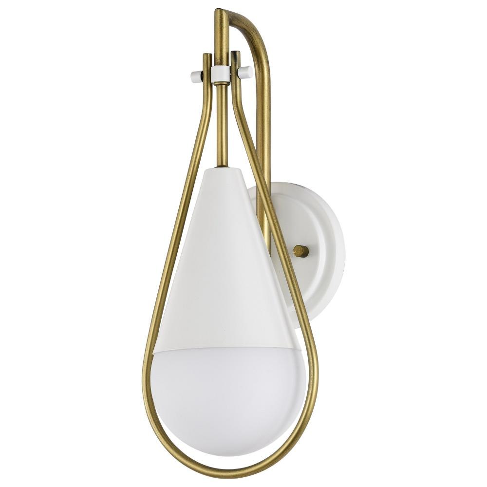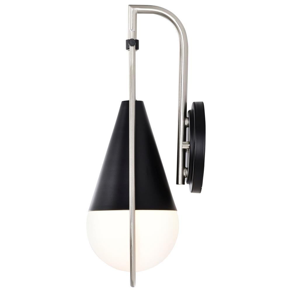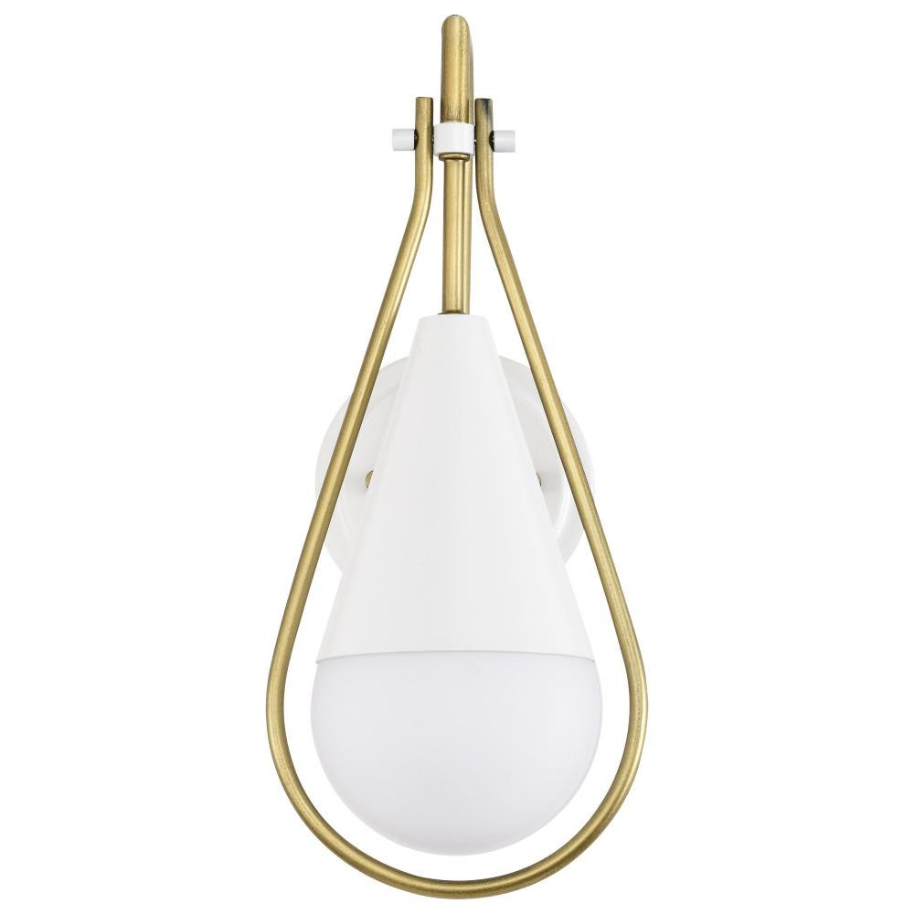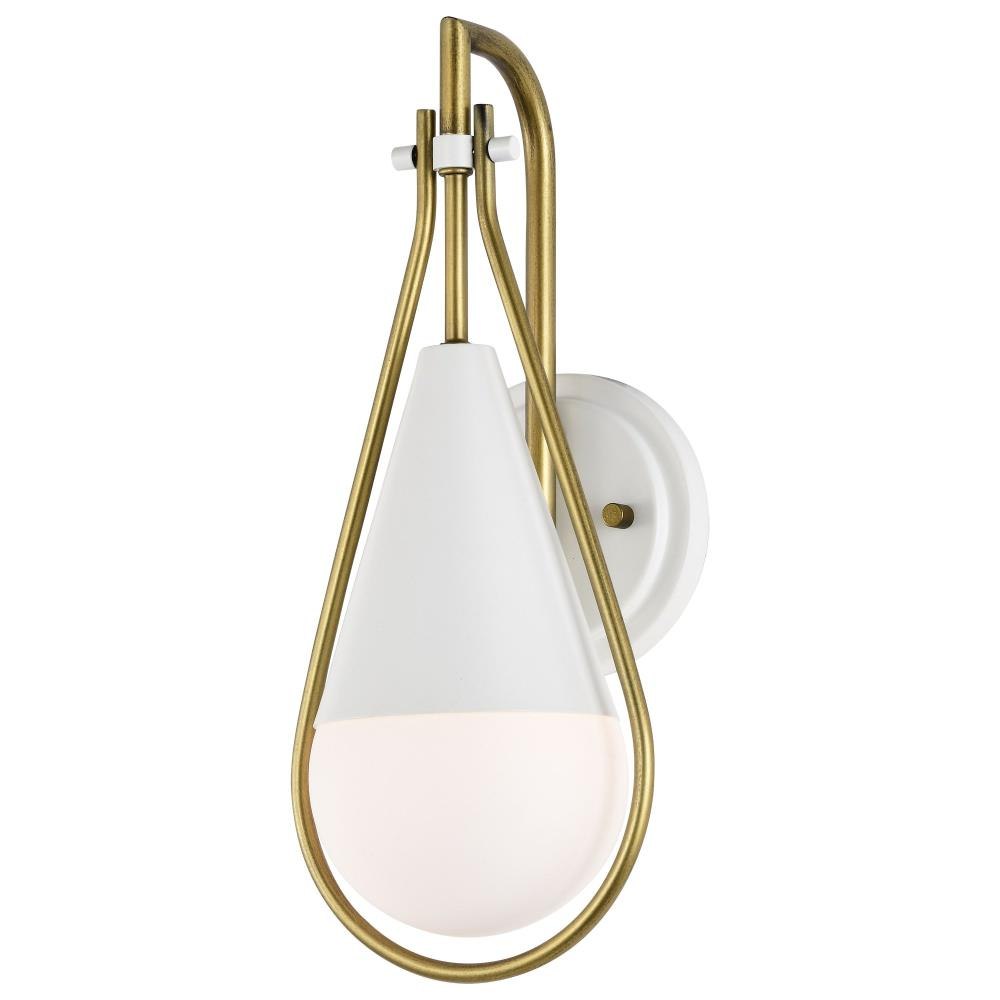 A modern collection with a twist, the Admiral 60-7901 one light wall sconce features a dual finish, unique design, and a fashionable statement for home luminaires. A suspended tear-dropped shape is comprised of matte black with natural brass elements encompassing the fixture. The white opal glass orb shields the light source for smooth, even lighting to bring a warm glow to any space. A beautiful design that is versatile and will compliment a variety of home decors.