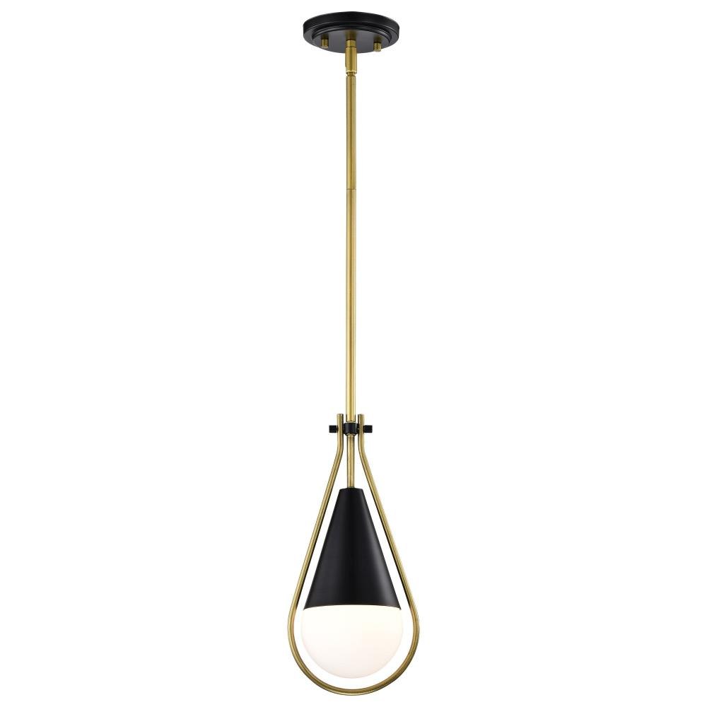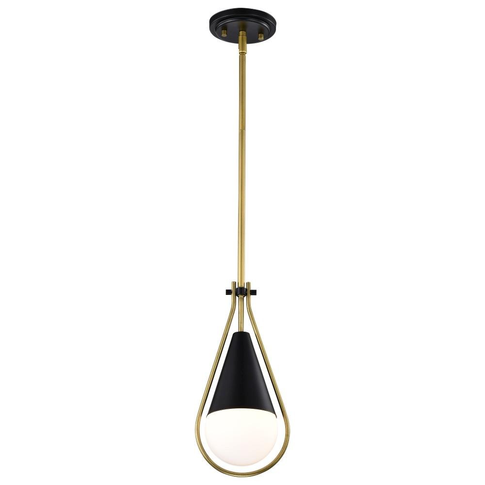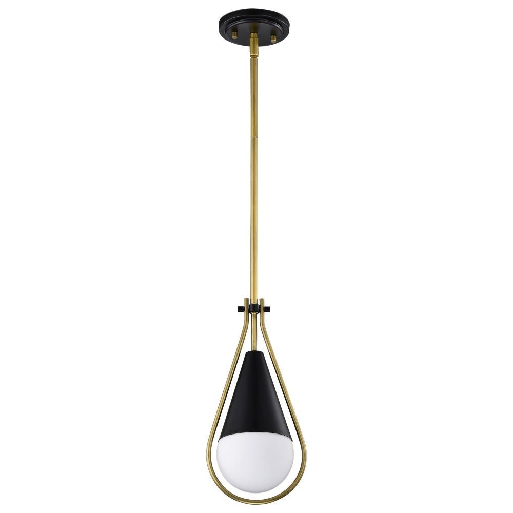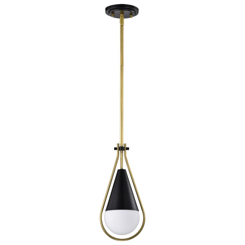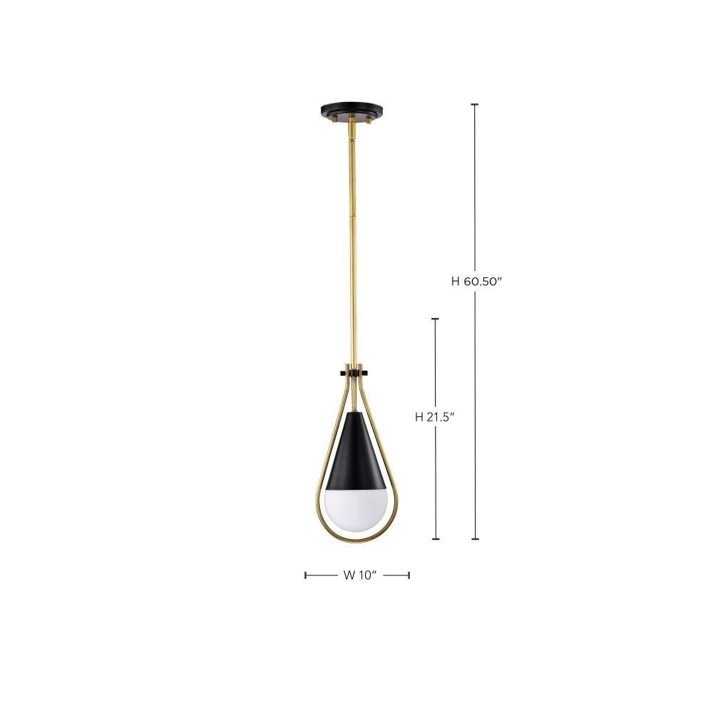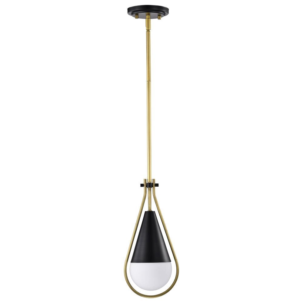 A modern collection with a twist, the Admiral 60-7903 medium pendant features a dual finish, unique design, and a fashionable statement for home luminaires. A suspended tear-dropped shape is comprised of matte black with natural brass elements encompassing the fixture. The white opal glass orb shields the light source for smooth, even lighting to bring a warm glow to any space. A beautiful design that is versatile and will compliment a variety of home decors.