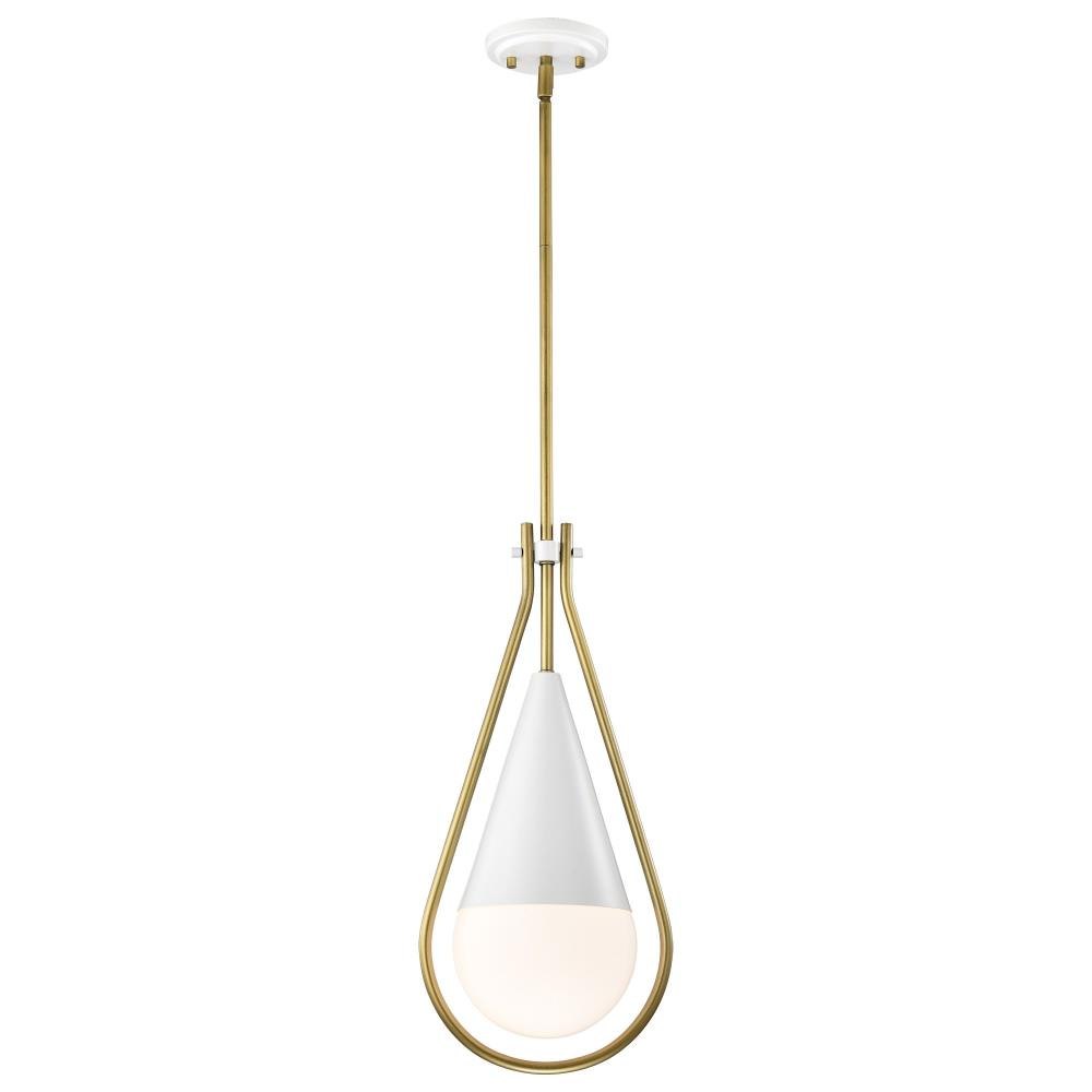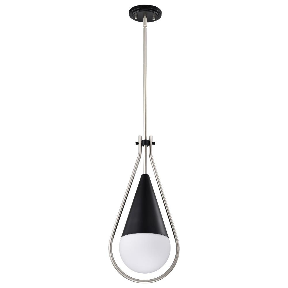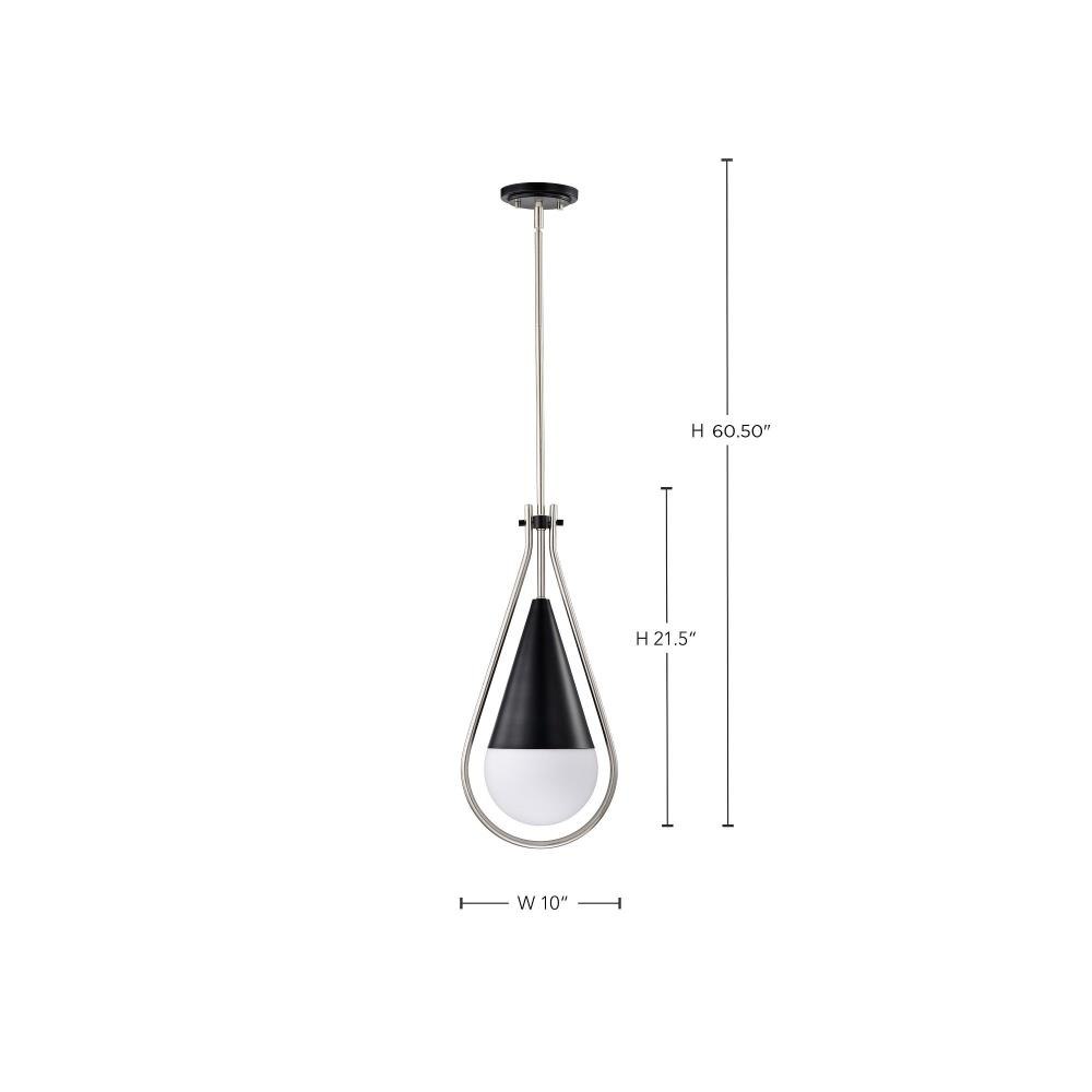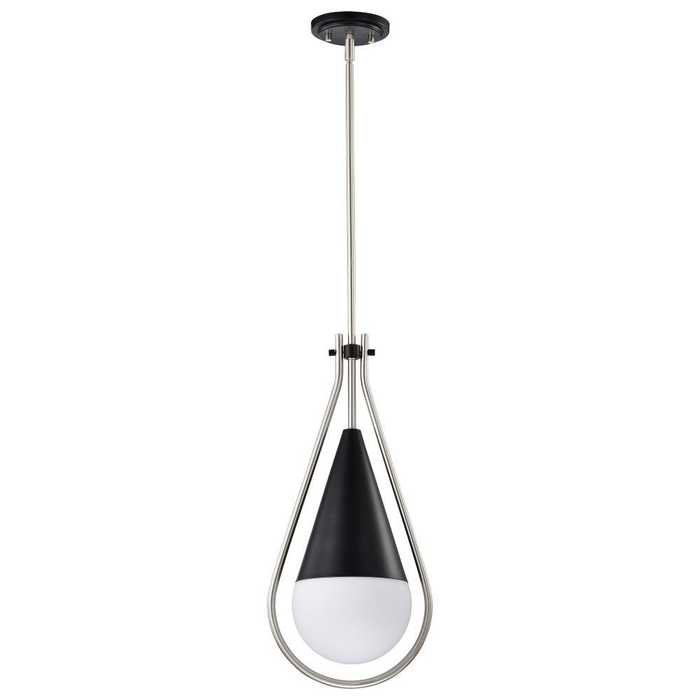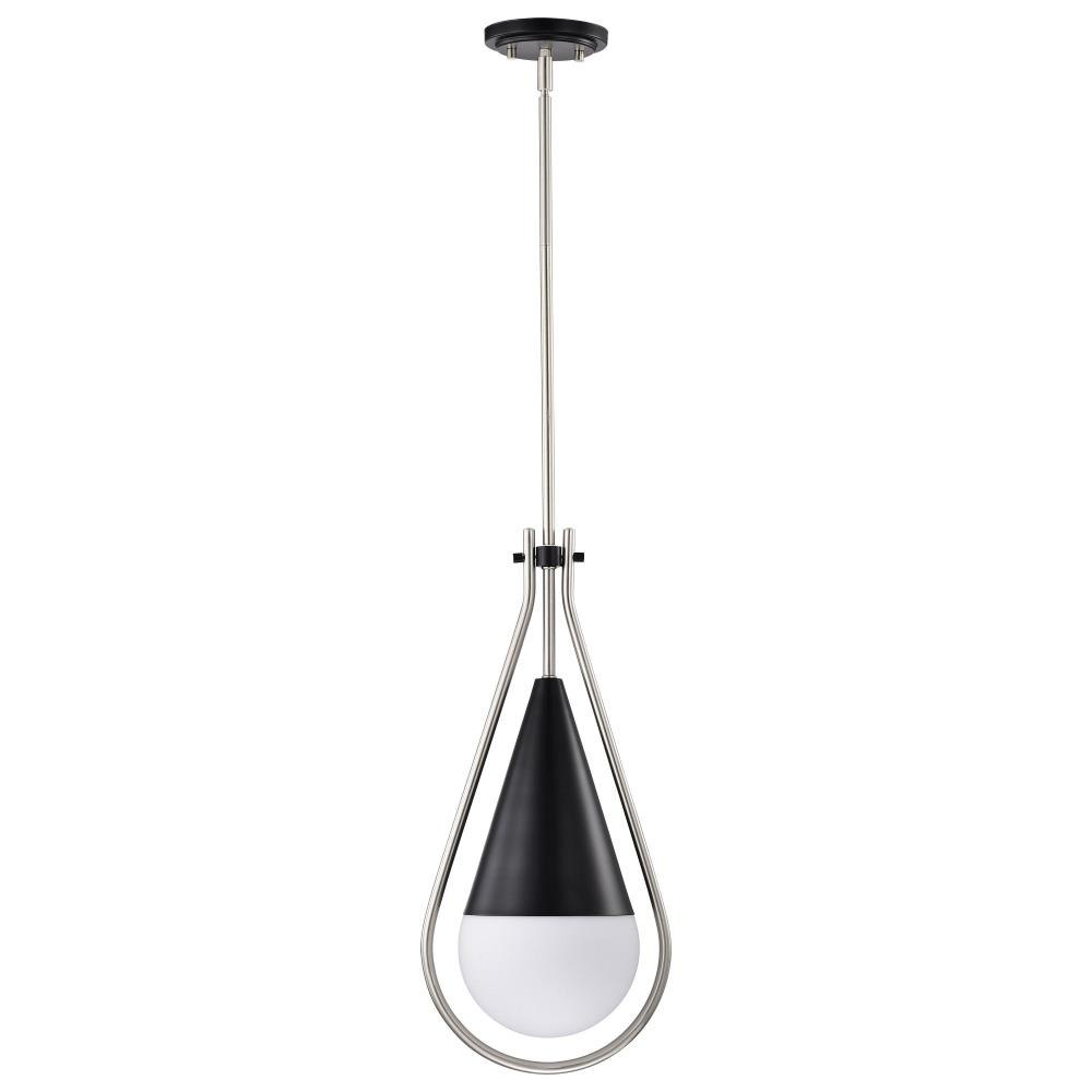A modern collection with a twist, the Admiral 60-7903 medium pendant features a dual finish, unique design, and a fashionable statement for home luminaires. A suspended tear-dropped shape is comprised of matte black with natural brass elements encompassing the fixture. The white opal glass orb shields the light source for smooth, even lighting to bring a warm glow to any space. A beautiful design that is versatile and will compliment a variety of home decors.