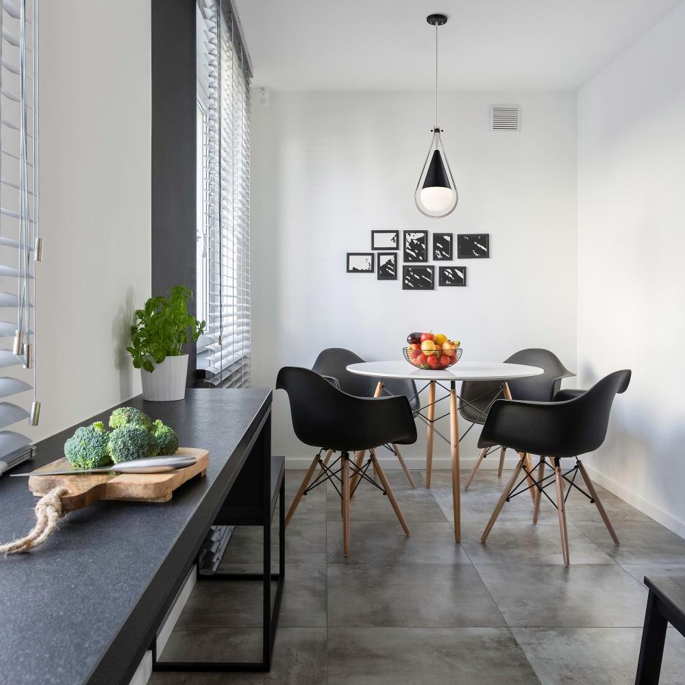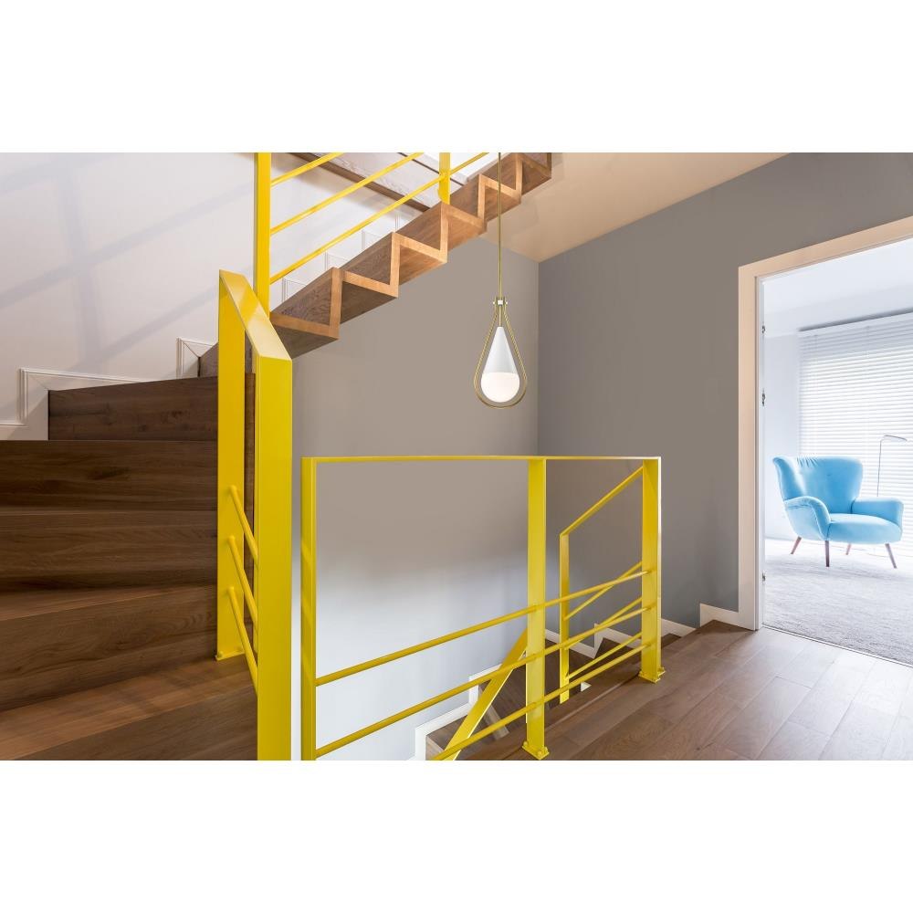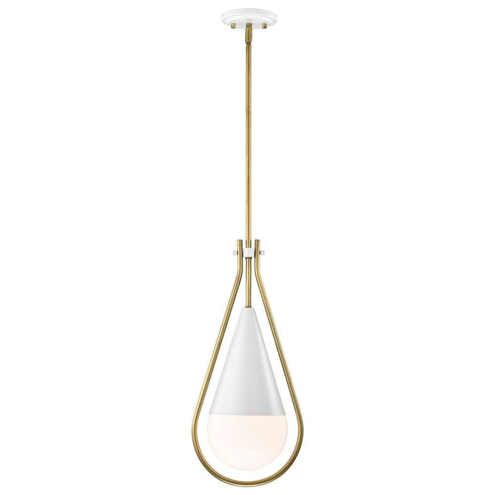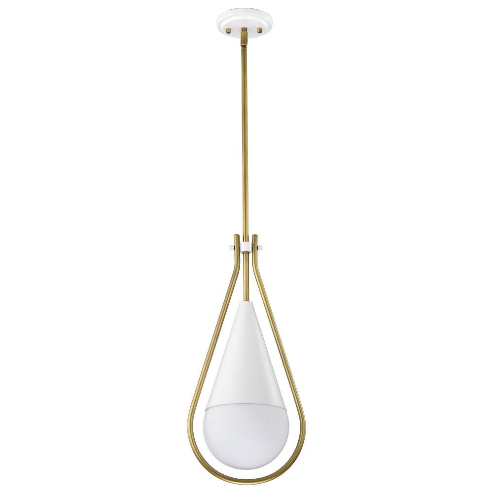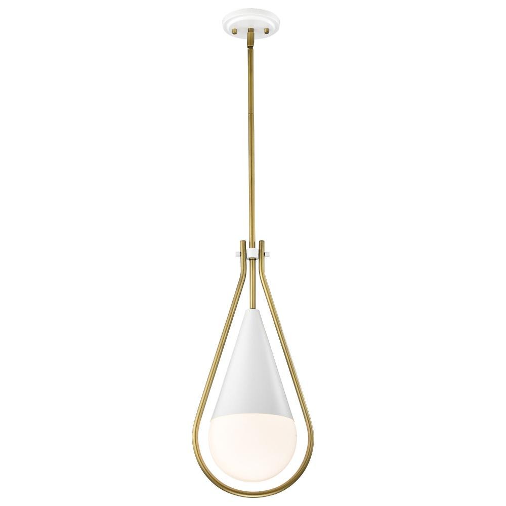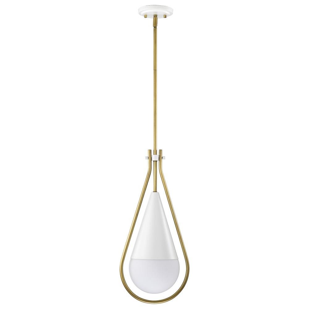 A modern collection with a twist, the Admiral 60-7903 medium pendant features a dual finish, unique design, and a fashionable statement for home luminaires. A suspended tear-dropped shape is comprised of matte black with natural brass elements encompassing the fixture. The white opal glass orb shields the light source for smooth, even lighting to bring a warm glow to any space. A beautiful design that is versatile and will compliment a variety of home decors.