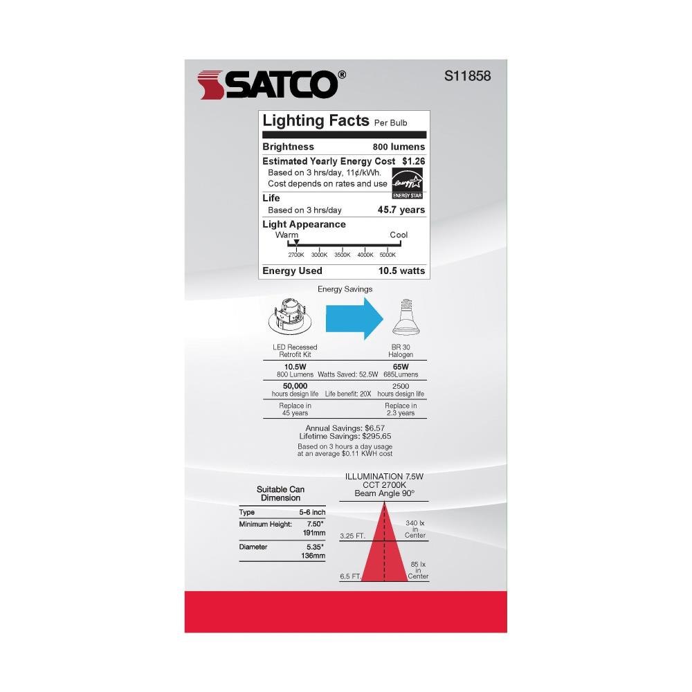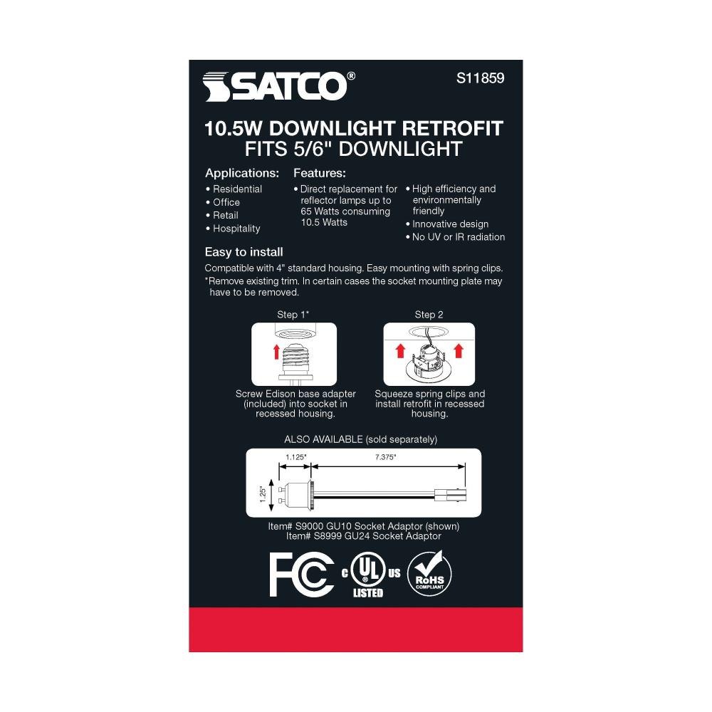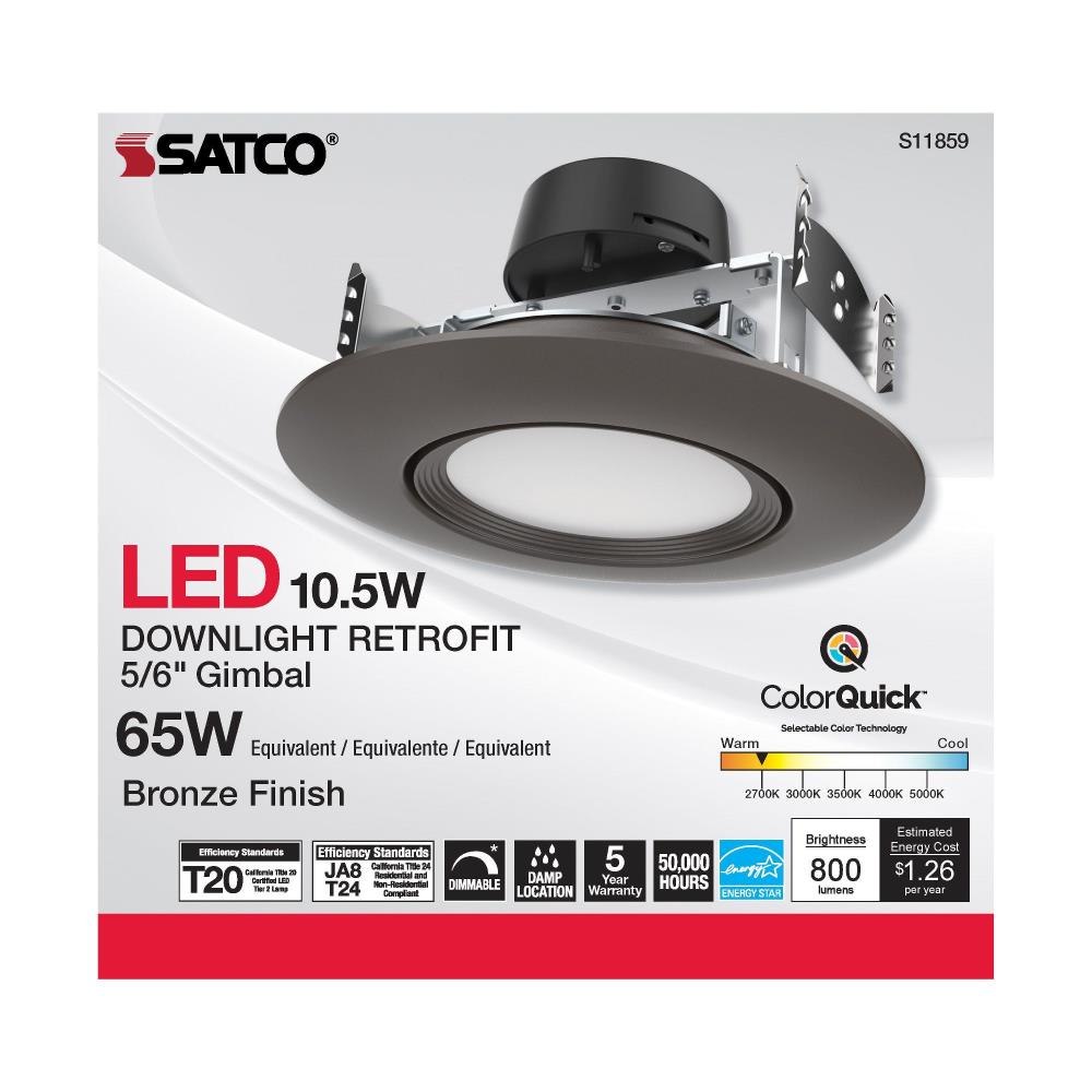 Satco's S11857 10.5 watt gimbaled LED downlight is a sleek lighting solution for residential and commercial applications. Illuminate kitchens, dining rooms, and office spaces with this CCT selectable fixture. Versatile and functional, this black trimmed fixture delivers 50,000 hours of illumination.