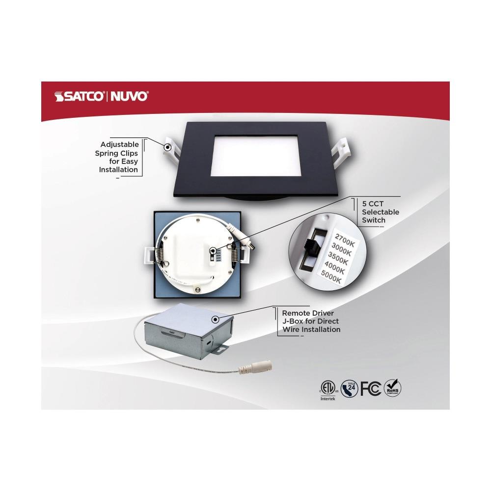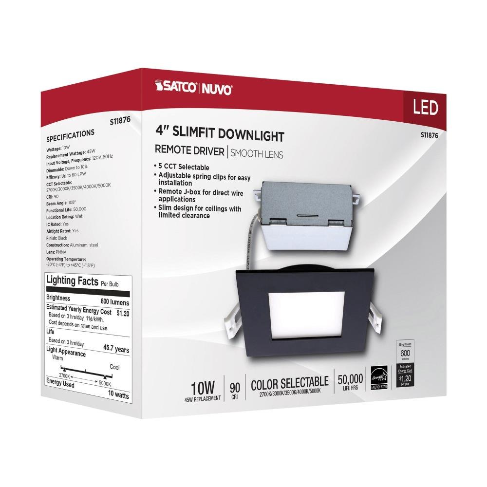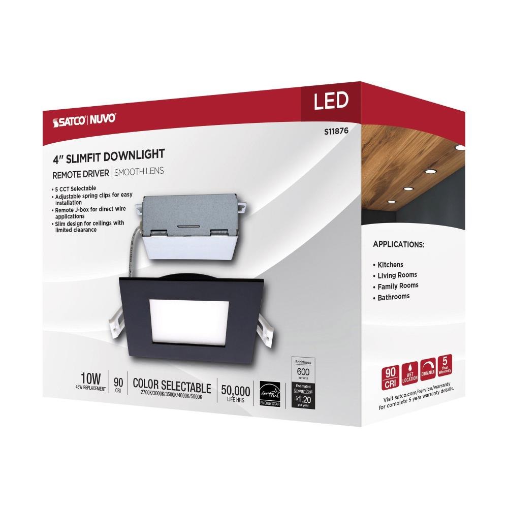 SATCO|NUVO’s S11876 LED Slimfit Downlight is among the most versatile lighting fixtures on the market. CCT Selectable at installation to personalize any space from kitchens, dens and offices to theater rooms and hotels with warm to cool dimmable light. This 4-inch square trim with black finish offers an easy way to incorporate upgraded LED lighting into any environment.