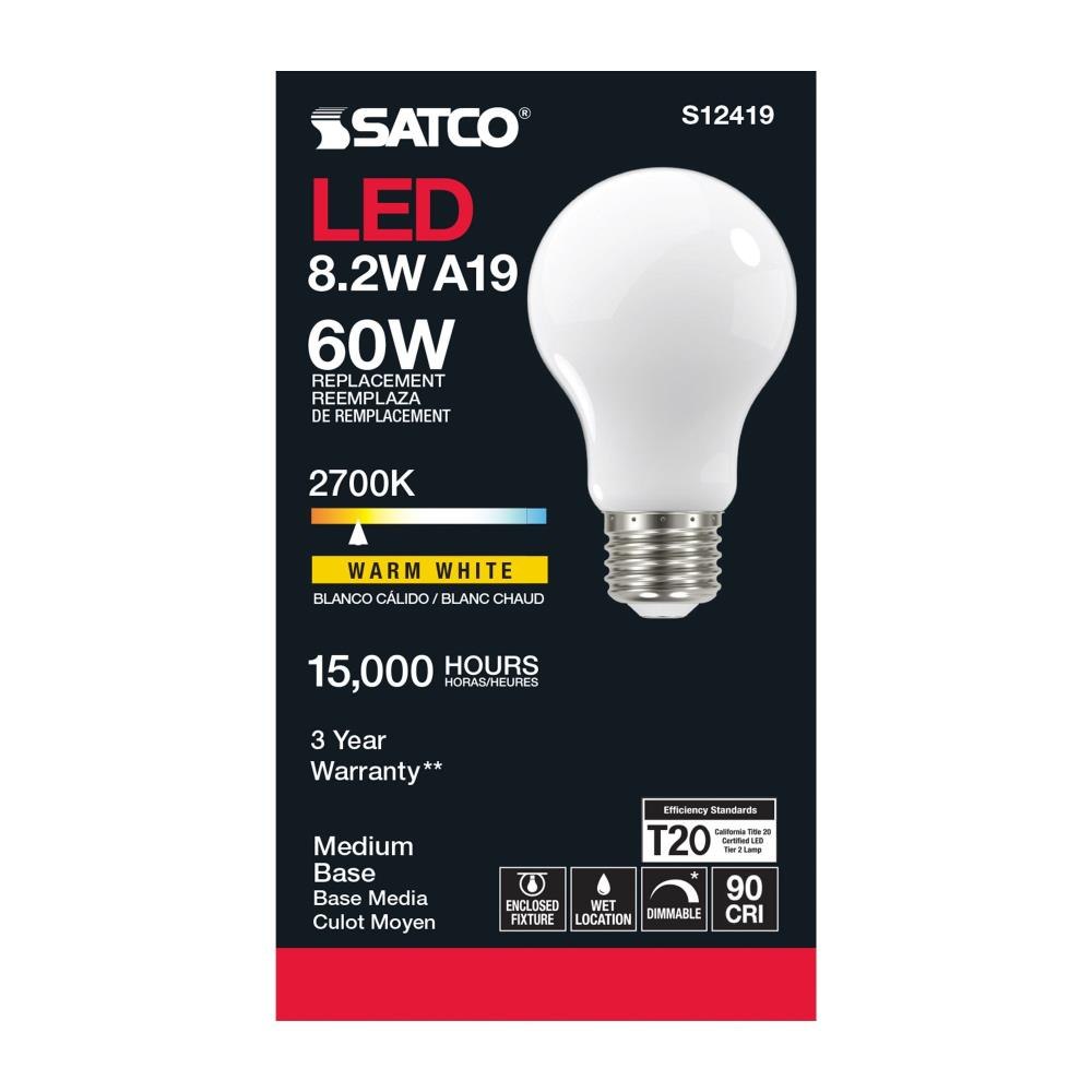 For every generation, Satco's LED replacements surpass their predecessors. We offer lighting solutions for commercial, industrial, and residential consumers with a wide range of bases, wattages, and lumens. We provide a bulb for many applications and environments. The frosted finish ensures a uniform color. The sizable beam spread will perfectly illuminate your space.Satco S12419 Frosted LED A19 medium base bulb uses 8.2 watts with 90 CRI, 2700K, and is dimmableIlluminate your home with 800 lumens and a warm white color temperatureLED lighting provided adds up to significant savings on energy costs, and is rated for up to 15,000 hours with average useWattage is incandescent equivalent to 60 watts, and features a 320 degree beam spreadA three year limited warranty with 4 hour per day usage brings peace of mind with your purchaseRated for indoor and outdoor use including wet locationsBulb for use with standard 120V fixturesSafety listed cULus and ROHS compliantThe most common, useful lamps on the market are now suitable for use nationwide with their 90 CRI T20 CEC rating. Our LED A15 and A19 LED filament lamps incorporate all the latest LED technologies for superior lumen output, efficiency and long life wherever they're used!.