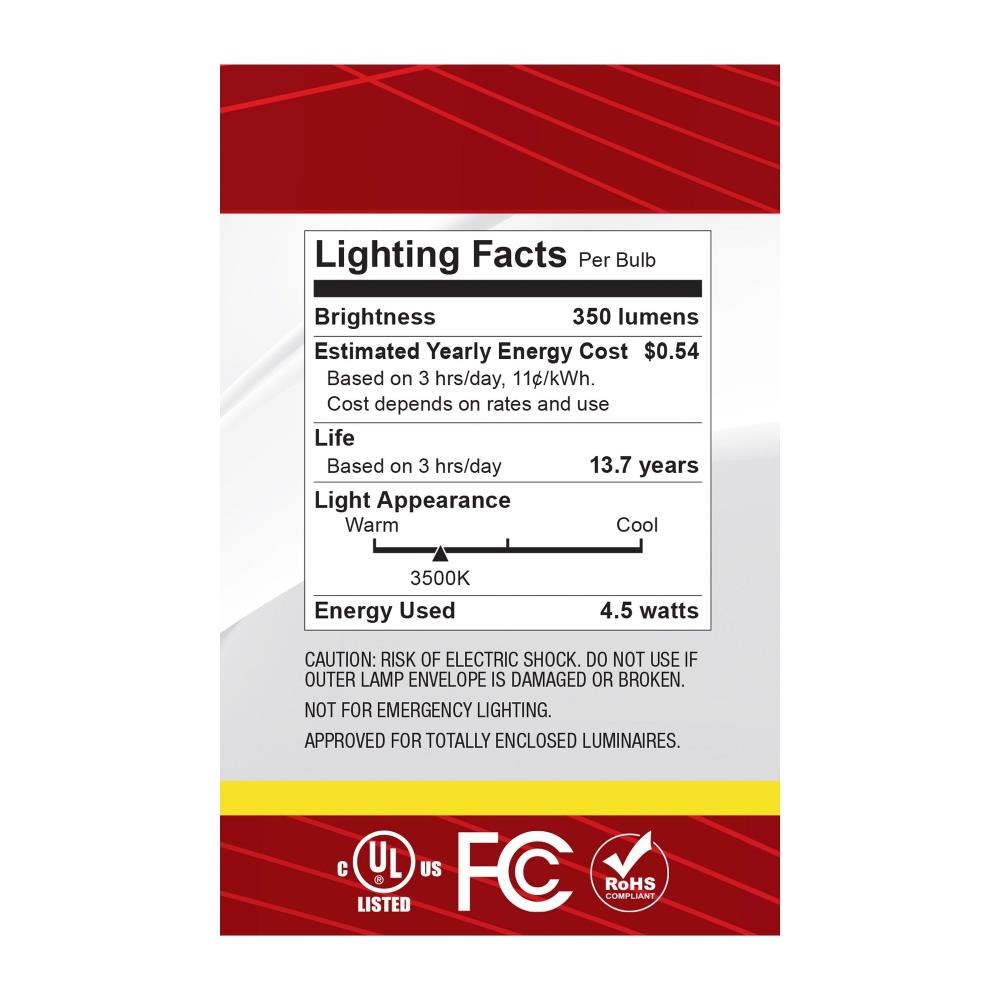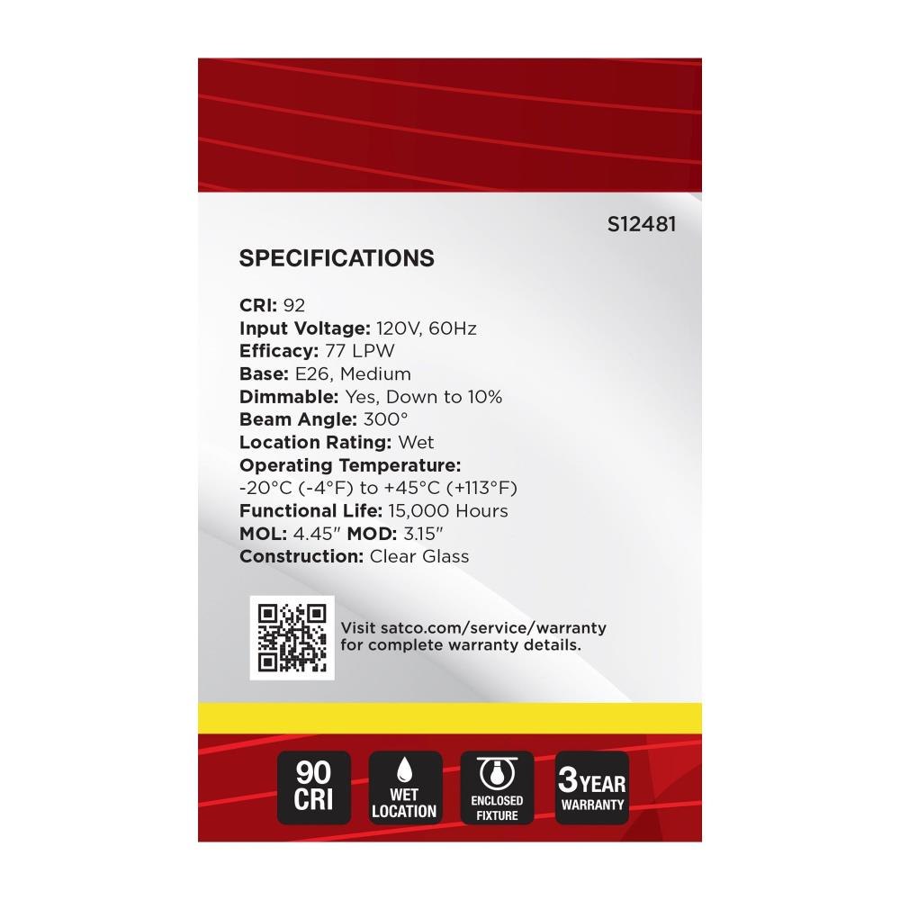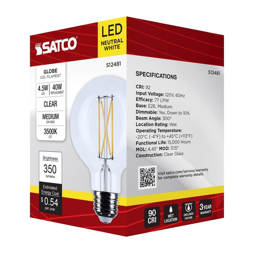 Satco's S12481 4.5-watt LED lamp is traditional, yet contemporary with its vintage style and energy saving LED technology. Elegantly illuminate any room in the house with this dimmable, globe shaped bulb. Sophisticated and modern, this lamp delivers 15,000 hours of neutral white light.