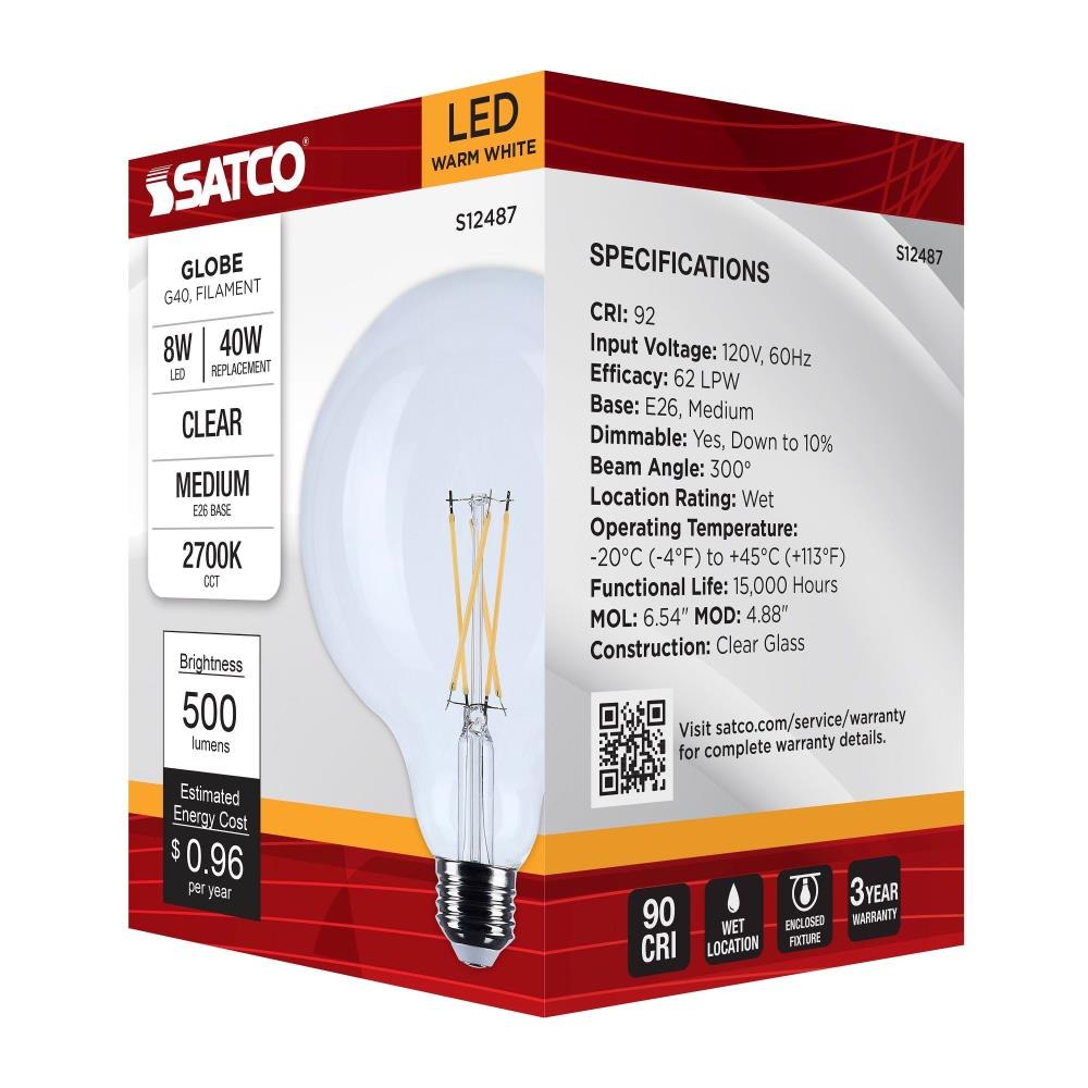 Satco's S12487 8-watt LED lamp is traditional, yet contemporary with its vintage style and energy saving LED technology. Elegantly illuminate any room in the house with this dimmable, globe shaped bulb. Sophisticated and modern, this lamp delivers 15,000 hours of warm white light.