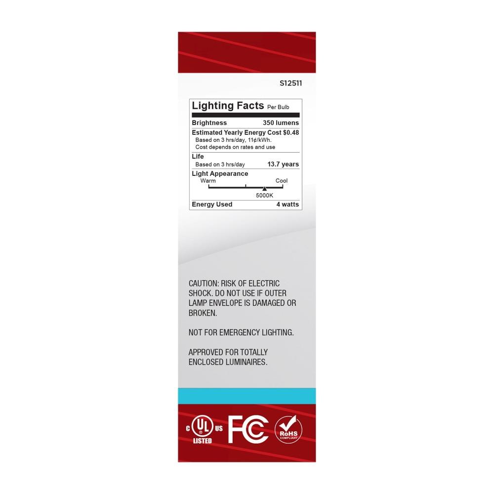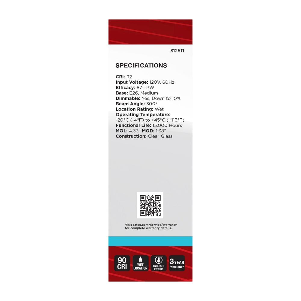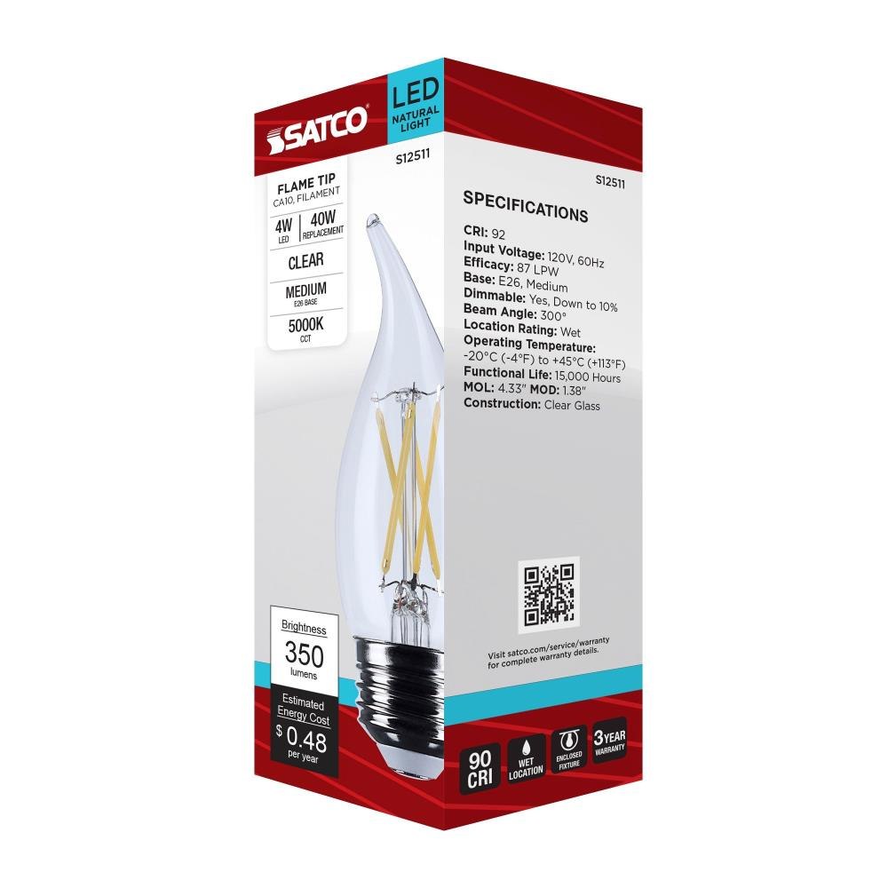 Satco's S12511 4-watt LED lamp is traditional, yet contemporary with its vintage style and energy saving LED technology. Elegantly illuminate any room in the house with this dimmable, clear bulb. Sophisticated and modern, this lamp delivers 15,000 hours of natural light.