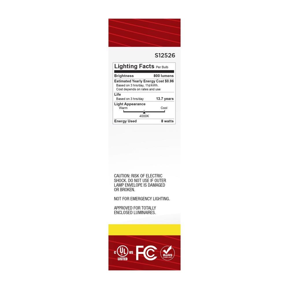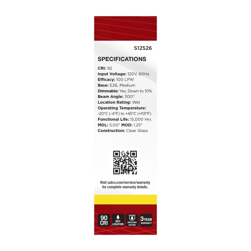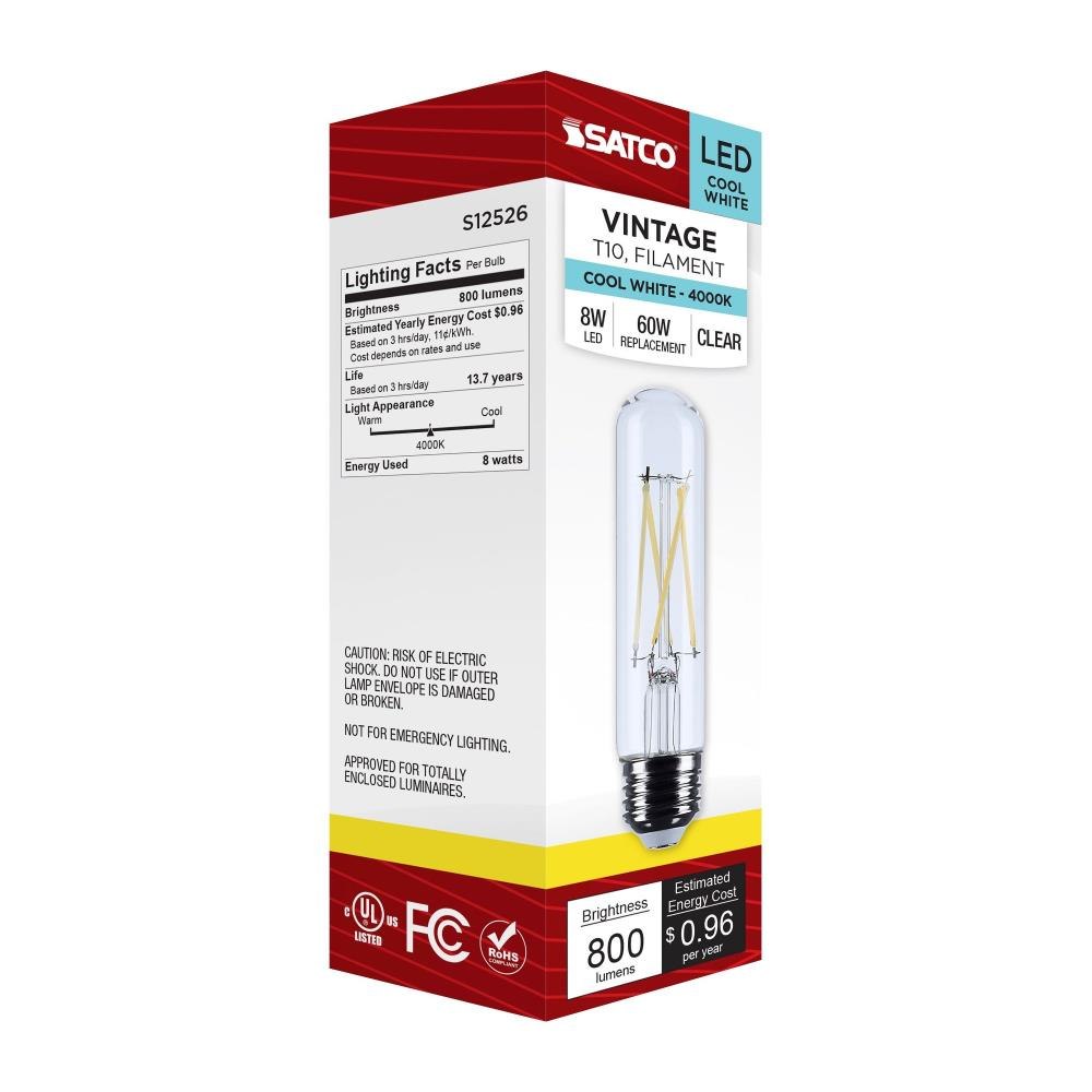 Satco's S12526 8-watt, LED lamp is traditional, yet contemporary with its vintage style and energy saving LED technology. Elegantly illuminate any room in the house with this dimmable, clear bulb. Sophisticated and modern, this lamp delivers 15,000 hours of cool white light.