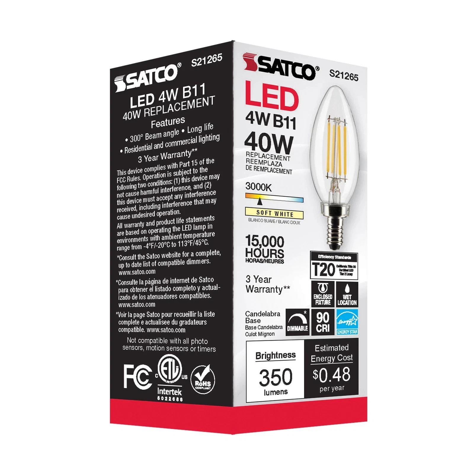 LED Chandelier Filament 120V 4W B11 Candelabra E12 3000K S21265 Light Bulb