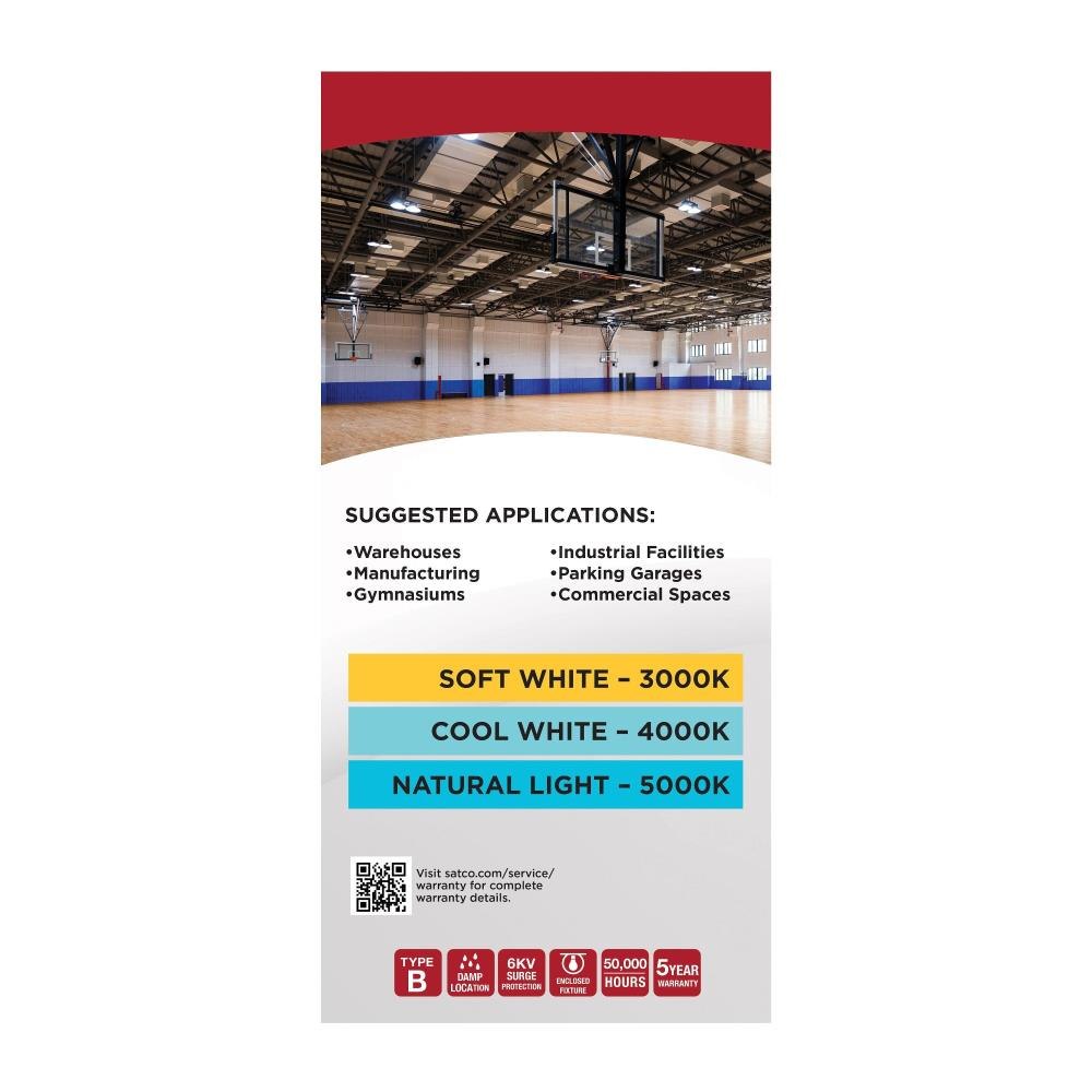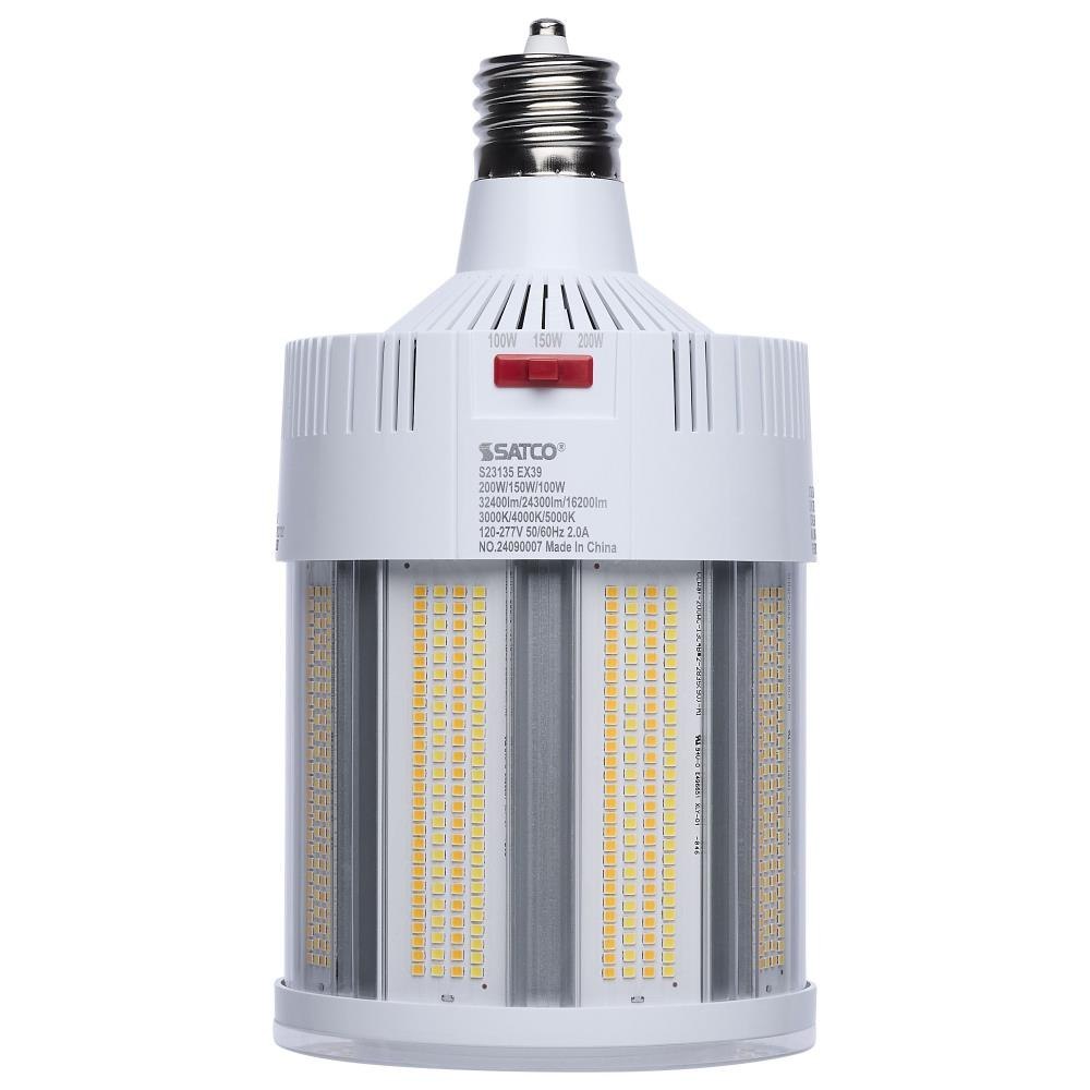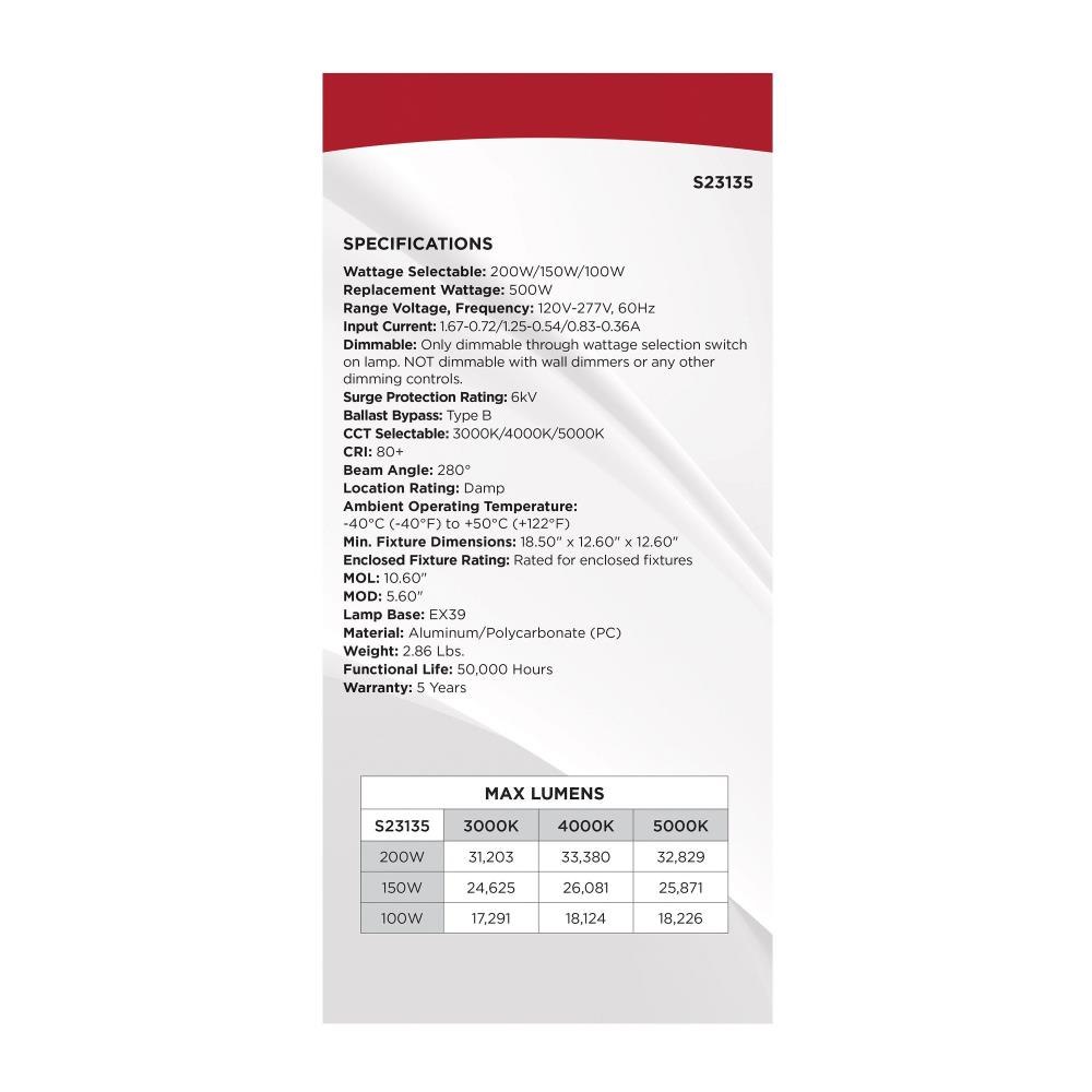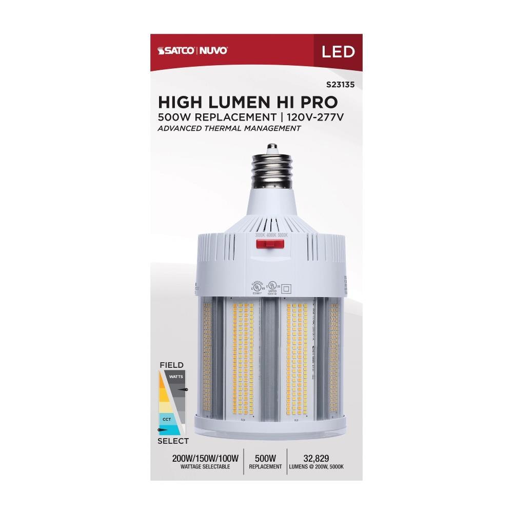 SATCO|NUVO's S23135 Hi-Lumen Hi-Pro lamp delivers over 33,000 lumens, replacing metal halide lamps up to 500W with energy-efficient LED performance. Field-selectable wattage and CCT provide versatility, while the extended mogul EX39 base and enclosed fixture rating suit industrial and commercial spaces like warehouses and gymnasiums. A support bracket and safety cable add extra security during installation. The Type B ballast bypass design allows direct operation on 120-277V systems. A universal operating position, active cooling fan, and 6kV surge protection enhance reliability. With a 50,000-hour lifespan and a 5-year warranty, this lamp ensures long-lasting, high-lumen output.