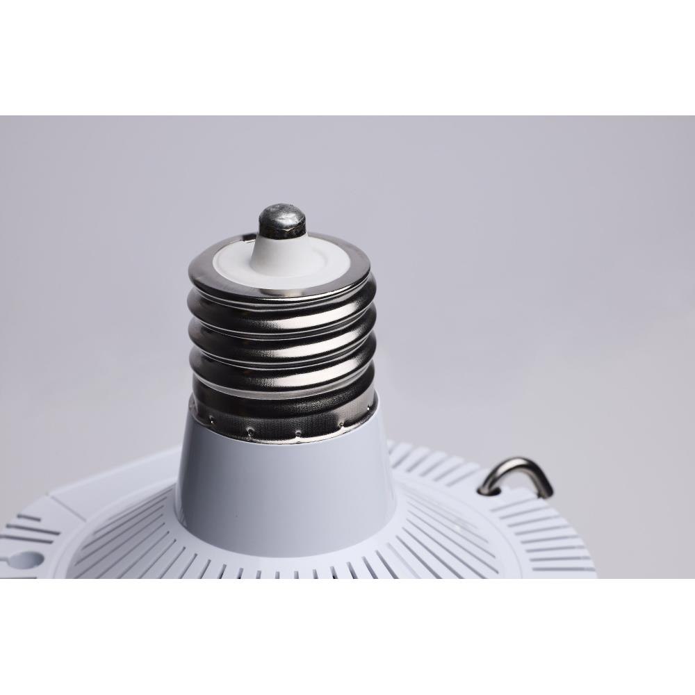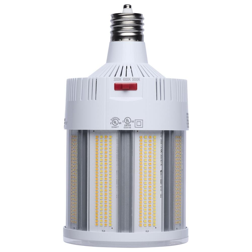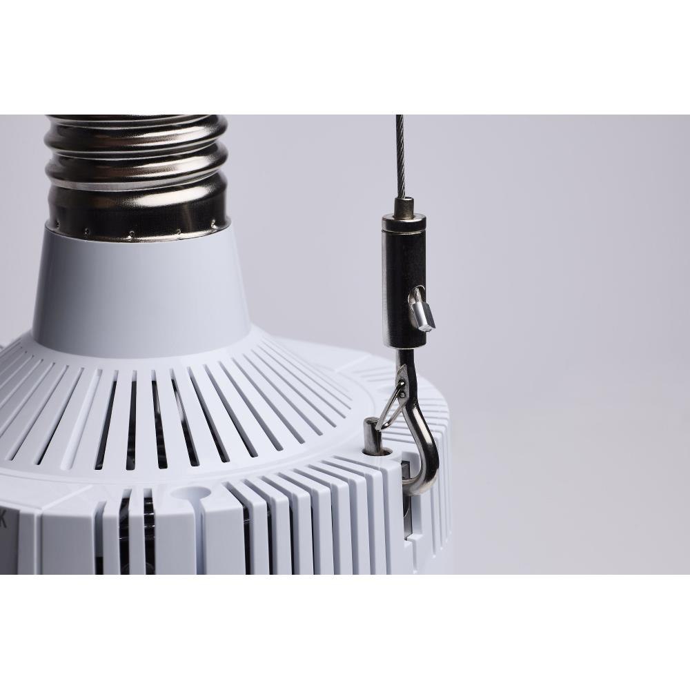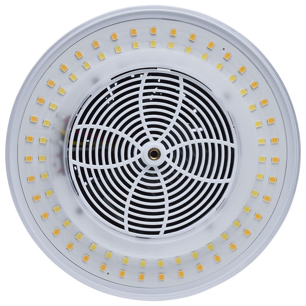 SATCO|NUVO's S23135 Hi-Lumen Hi-Pro lamp delivers over 33,000 lumens, replacing metal halide lamps up to 500W with energy-efficient LED performance. Field-selectable wattage and CCT provide versatility, while the extended mogul EX39 base and enclosed fixture rating suit industrial and commercial spaces like warehouses and gymnasiums. A support bracket and safety cable add extra security during installation. The Type B ballast bypass design allows direct operation on 120-277V systems. A universal operating position, active cooling fan, and 6kV surge protection enhance reliability. With a 50,000-hour lifespan and a 5-year warranty, this lamp ensures long-lasting, high-lumen output.