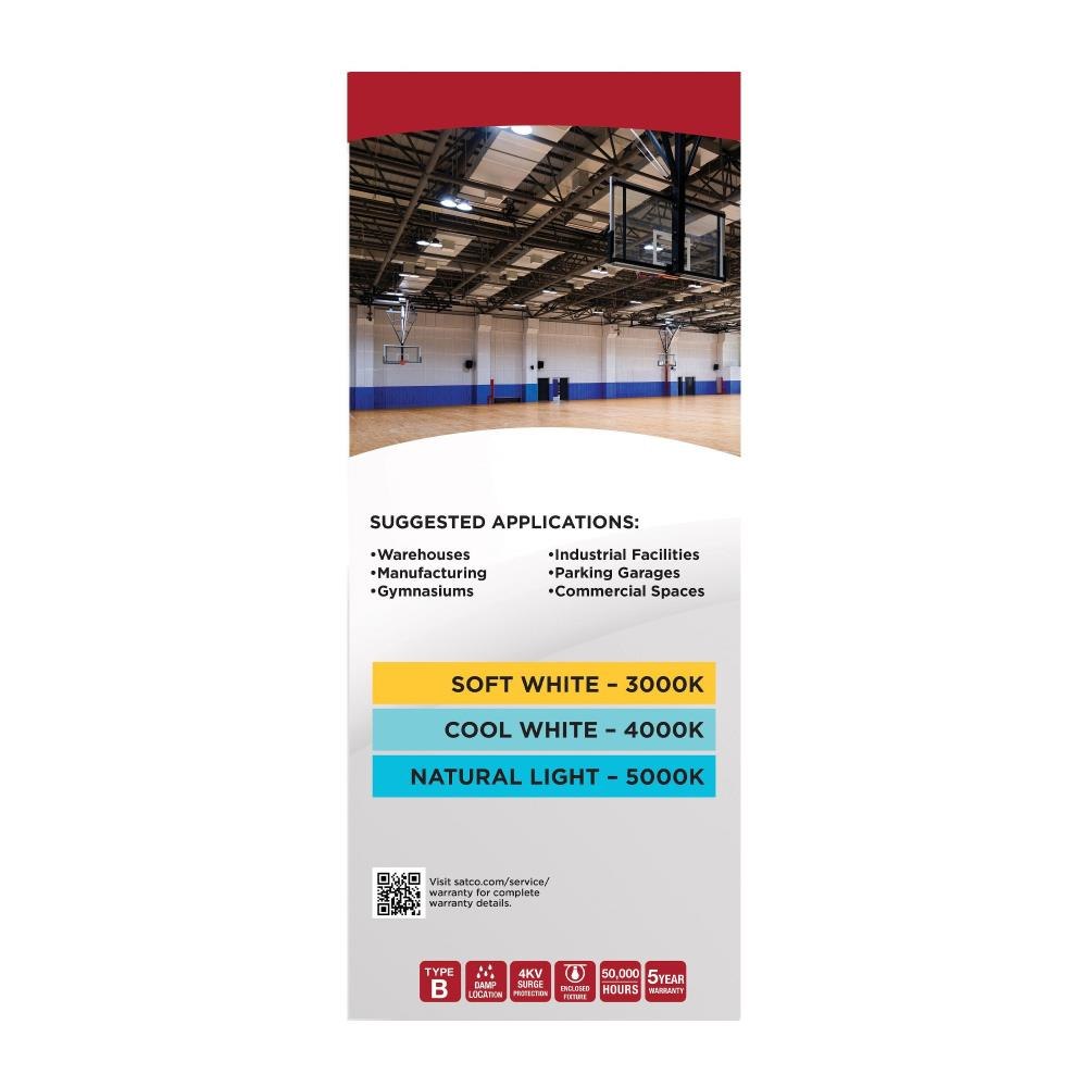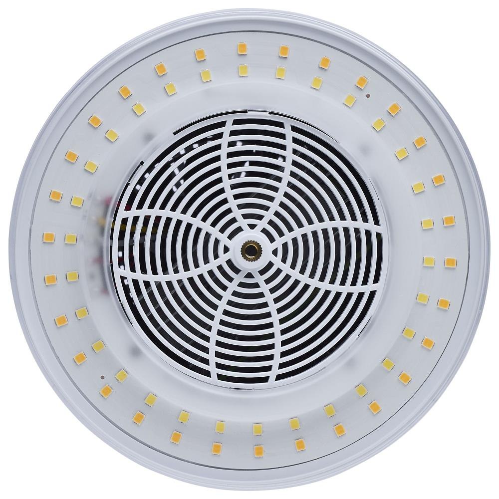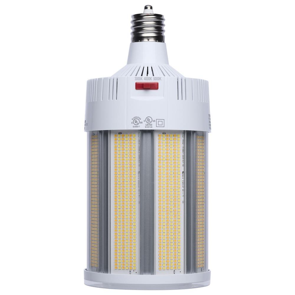 SATCO|NUVO's S23139 Hi-Lumen Hi-Pro lamp delivers a staggering 73,000+ lumens, replacing metal halide lamps up to 1000W with energy-efficient LED performance. Field-selectable wattage and CCT provide versatility, while the extended mogul EX39 base and enclosed fixture rating suit industrial and commercial spaces like warehouses and gymnasiums. A support bracket and safety cable add extra security during installation. The Type B ballast bypass design allows direct operation on 277-480V systems. A universal operating position, active cooling fan, and 4kV surge protection enhance reliability. With a 50,000-hour lifespan and a 5-year warranty, this lamp ensures long-lasting, high-lumen output.
