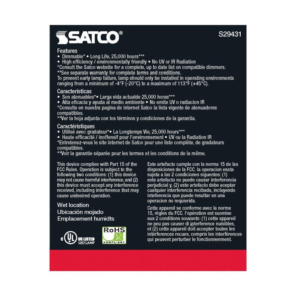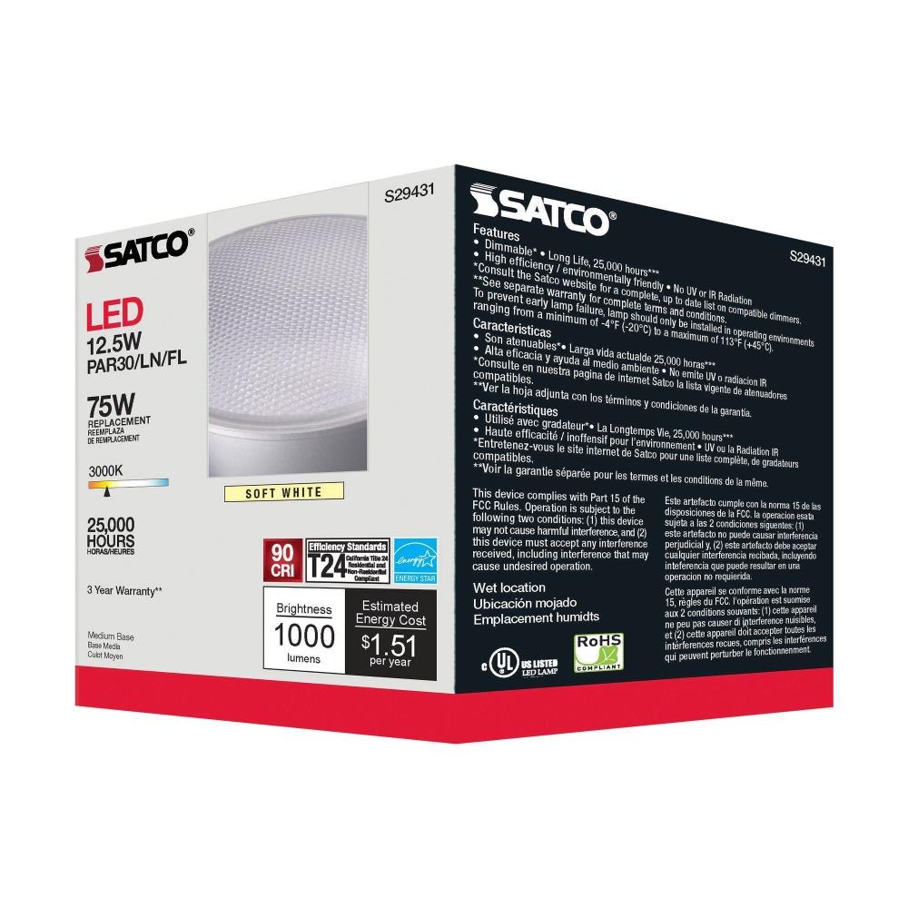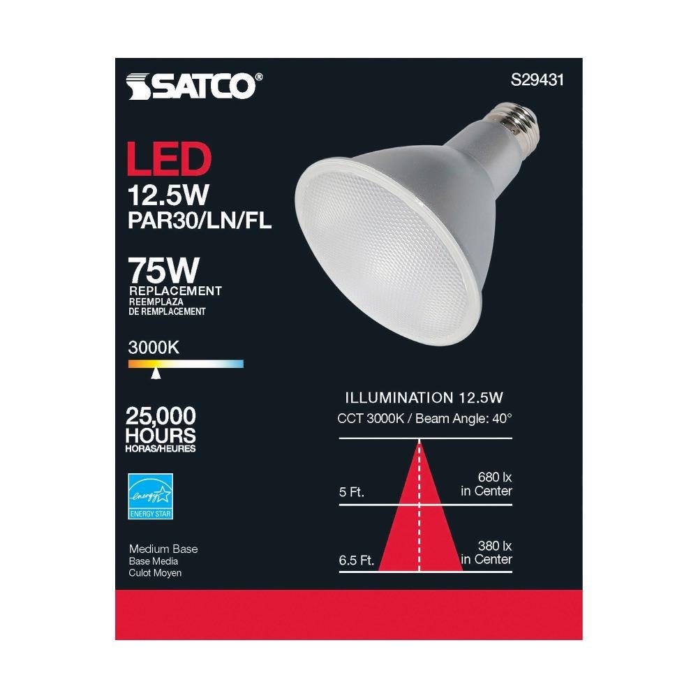 For every generation, Satco's LED flood light replacements surpass their predecessors. We offer lighting solutions for commercial, industrial, and residential consumers with a wide range of bases, wattages, and lumens. We provide a bulb for many applications and environments. The frosted finish ensures a uniform color. The sizable beam spread will perfectly illuminate your space.Satco S29431 Flood LED Par30LN medium base bulb uses 12.5 watts with 90 CRI, 3000K, and is dimmableIlluminate your home with 1000 lumens and a warm white color temperatureLED lighting provided adds up to significant savings on energy costs, and is rated for up to 25,000 hours with average useWattage is incandescent equivalent to 50 watts, and features a 40 degree beam spreadA three year limited warranty with 12 hour per day usage brings peace of mind with your purchaseRated for indoor use including damp locationsBulb for use with standard 120V fixturesSafety listed cULus and ROHS compliantWith a traditional lens and silver reflector style, Satco's LED 12.5-watt, 3000K, 40-degree beam spread PAR30LN lamp maintains the familiar look of the Halogen PAR and Gen1 LED lamps they replace - but at 90 CRI and a higher lumens per watt ratio, they deliver superior light and improved efficiency. Designed for use in track, recessed fixtures and wet locations including outdoor and landscape applications, this popular family has over 60 options available for your replacement lamp upgrades or new installations!.