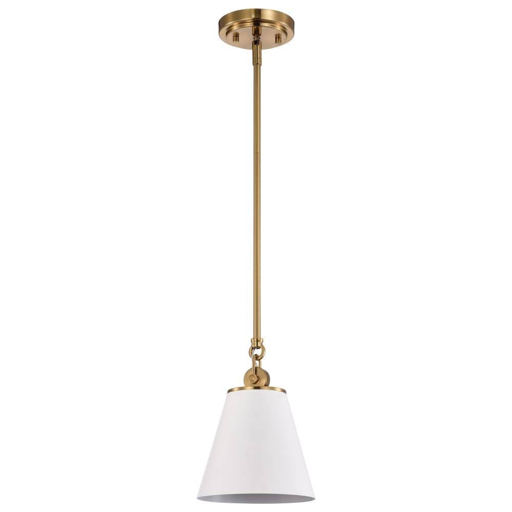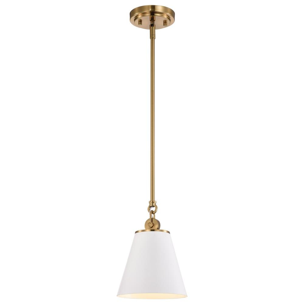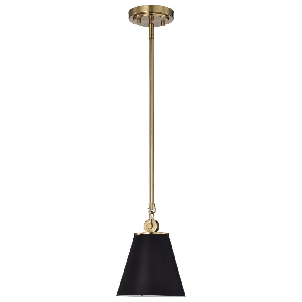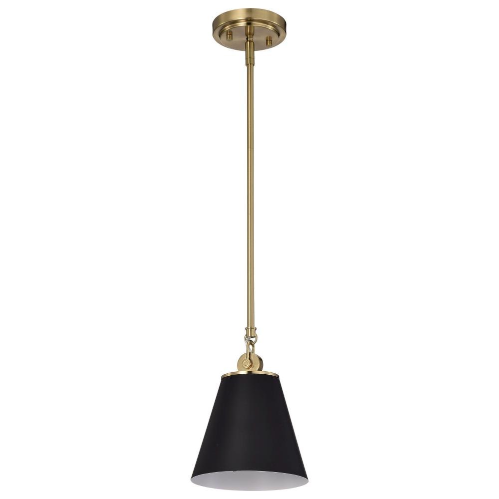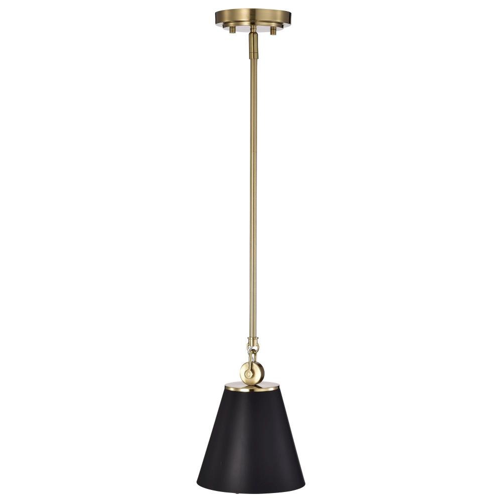 With subtle detailing, the Dover 60-7408 mini pendant is graceful yet unassuming. The simple black shade features a white lining to reflect the light, and the trim is finished in vintage brass to match the fixture's body. Place a trio of them over the kitchen island for added light or over nightstands in a bedroom as a permanent lighting solution.Uses one 60-watt incandescent medium base bulbFixture measures 7 inch diameter x 9.5 inch heightRated for indoor use in dry locationsFinished in black with vintage brass accents and matching metal shadeMounting hardware and installation instructions includedLimited one year fixture warranty.
