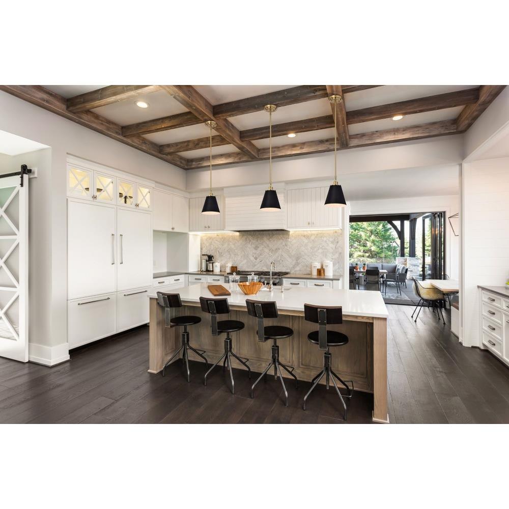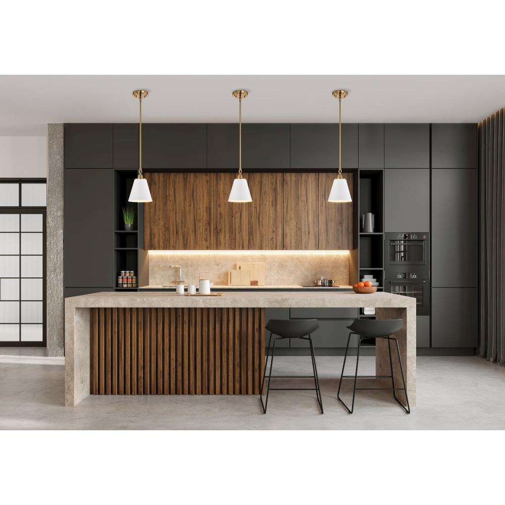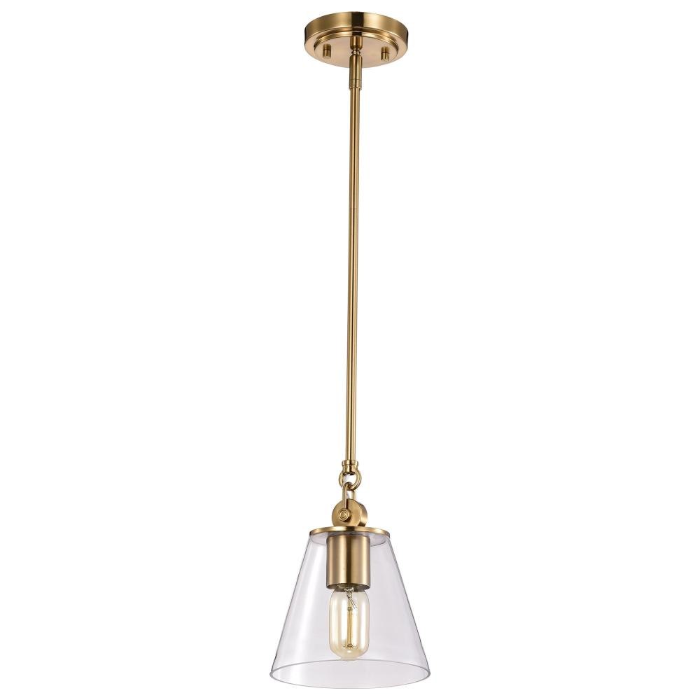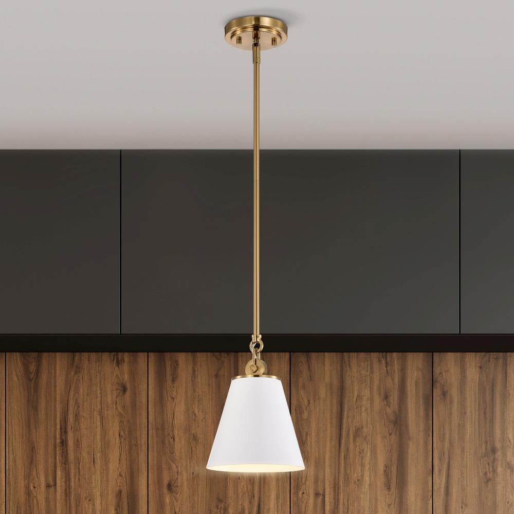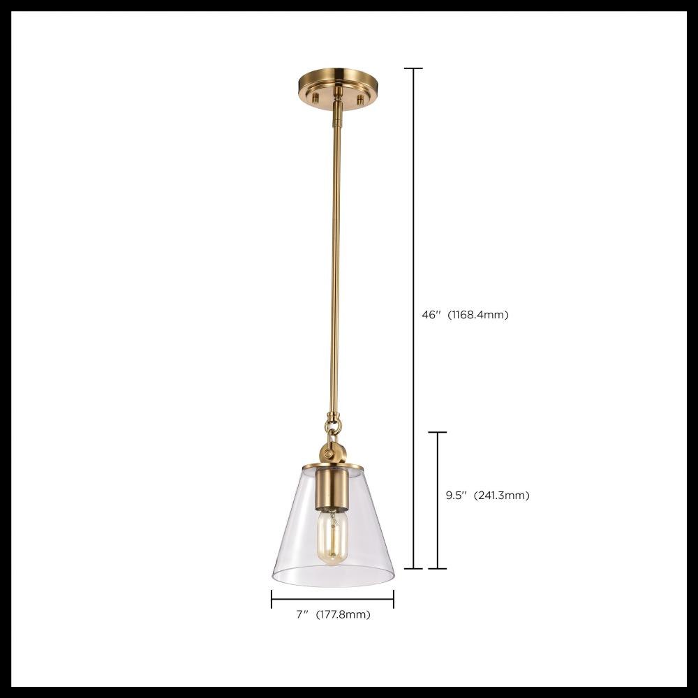 With subtle detailing, the Dover 60-7408 mini pendant is graceful yet unassuming. The simple black shade features a white lining to reflect the light, and the trim is finished in vintage brass to match the fixture's body. Place a trio of them over the kitchen island for added light or over nightstands in a bedroom as a permanent lighting solution.Uses one 60-watt incandescent medium base bulbFixture measures 7 inch diameter x 9.5 inch heightRated for indoor use in dry locationsFinished in black with vintage brass accents and matching metal shadeMounting hardware and installation instructions includedLimited one year fixture warranty.