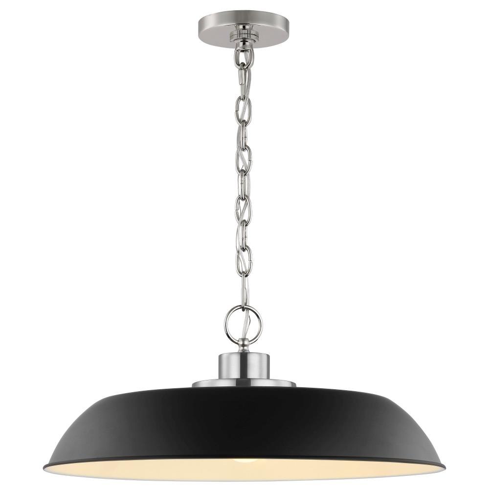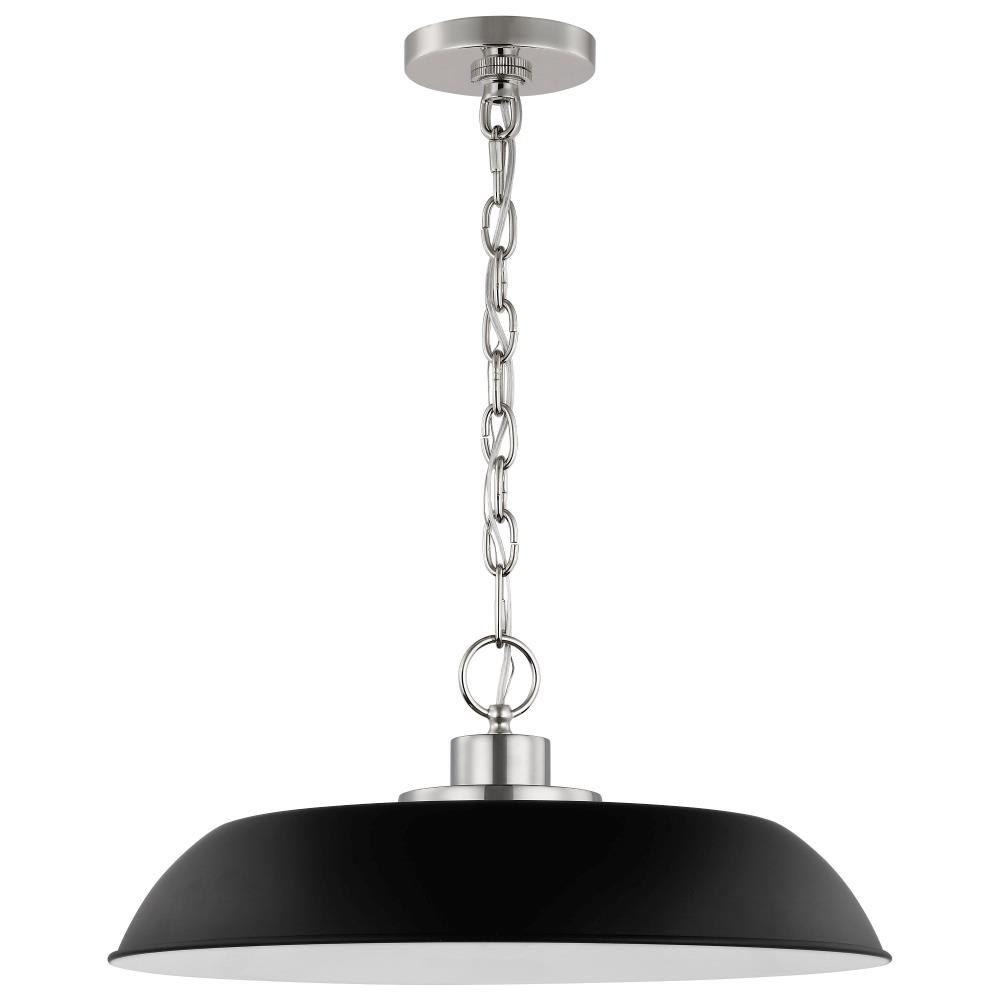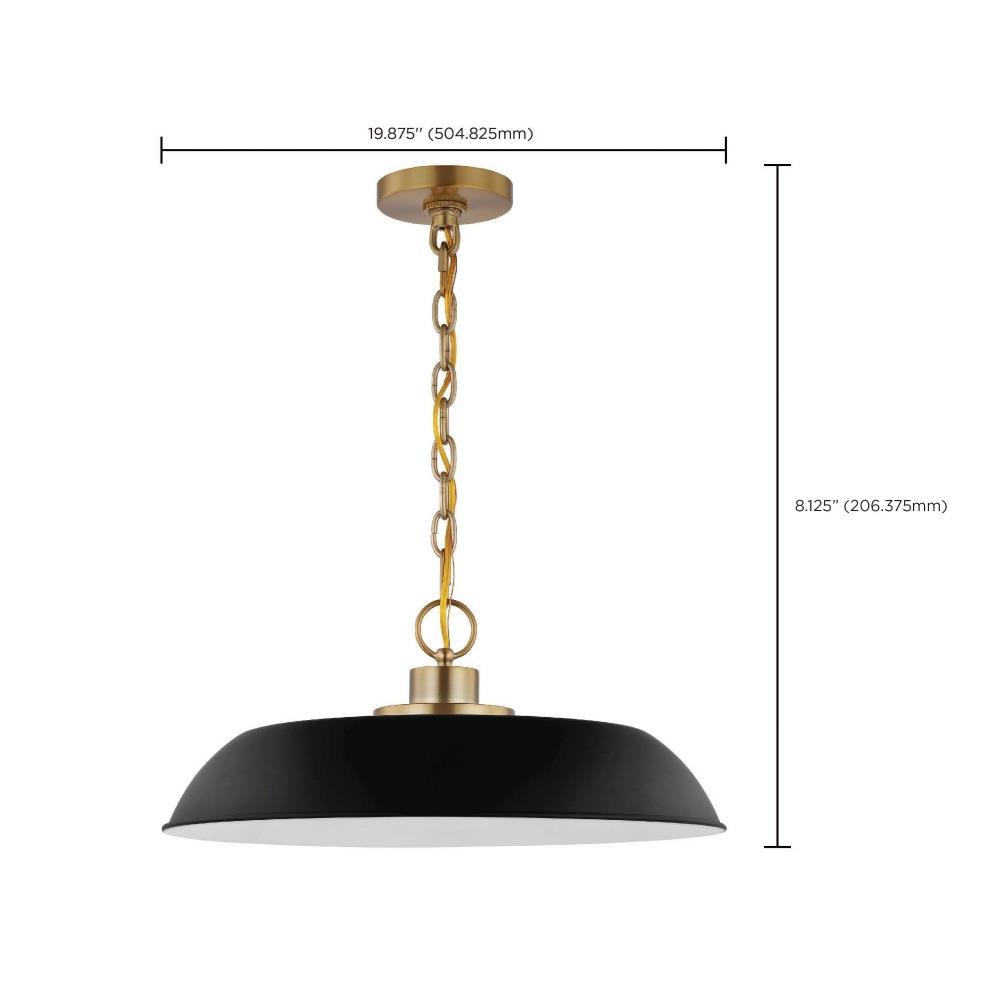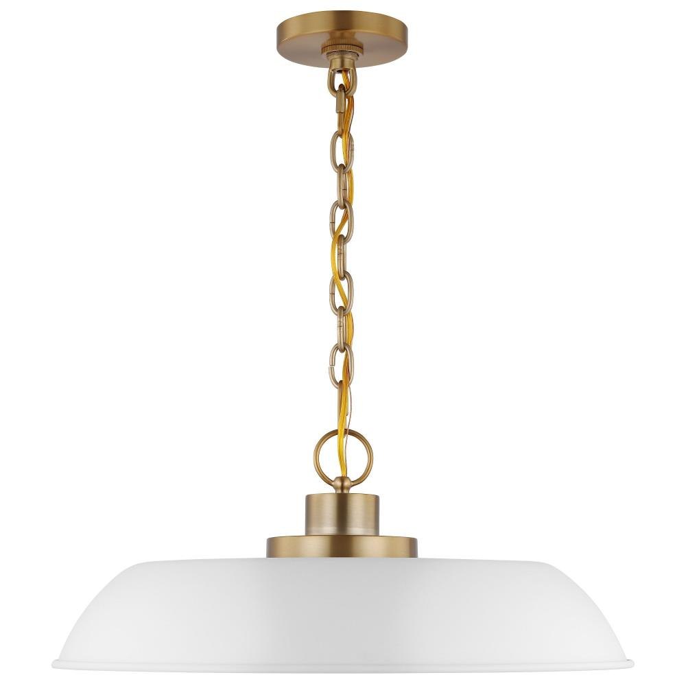Designed with neutral, clean lines, the Colony 60-7483 medium hanging pendant is ideal for an eat-in kitchen, dining room and even a bedroom. The loft-style shallow pan metal shade is finished in matte white, with a matching interior to reflect the downfacing lamp. The burnished brass finish on the base, chain, and canopy adds an elegant touch to this flexible design.Uses one 100-watt incandescent medium base bulbFixture measures 19.875 inch diameter x 8.125 inch heightRated for indoor use in dry locationsFinished in matte white with burnished brass accents and matching metal shadeAdjustable height to suit your needsLimited one year fixture warranty.