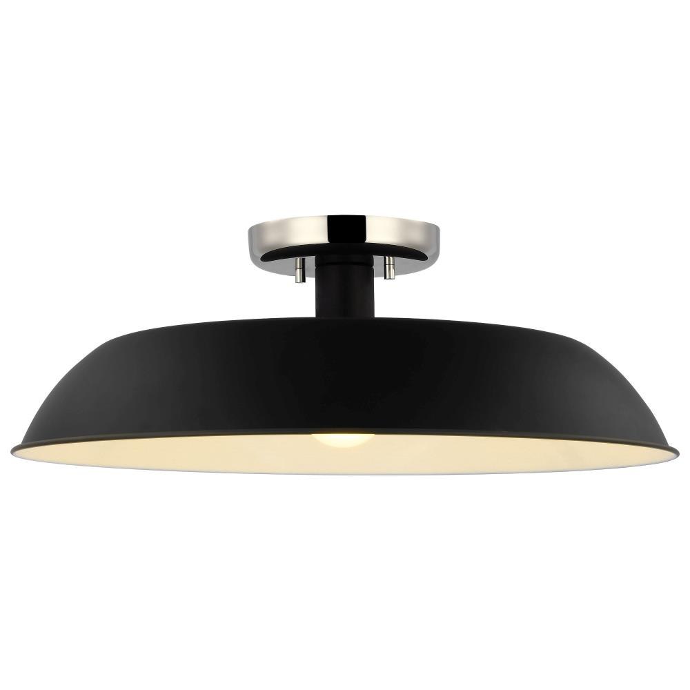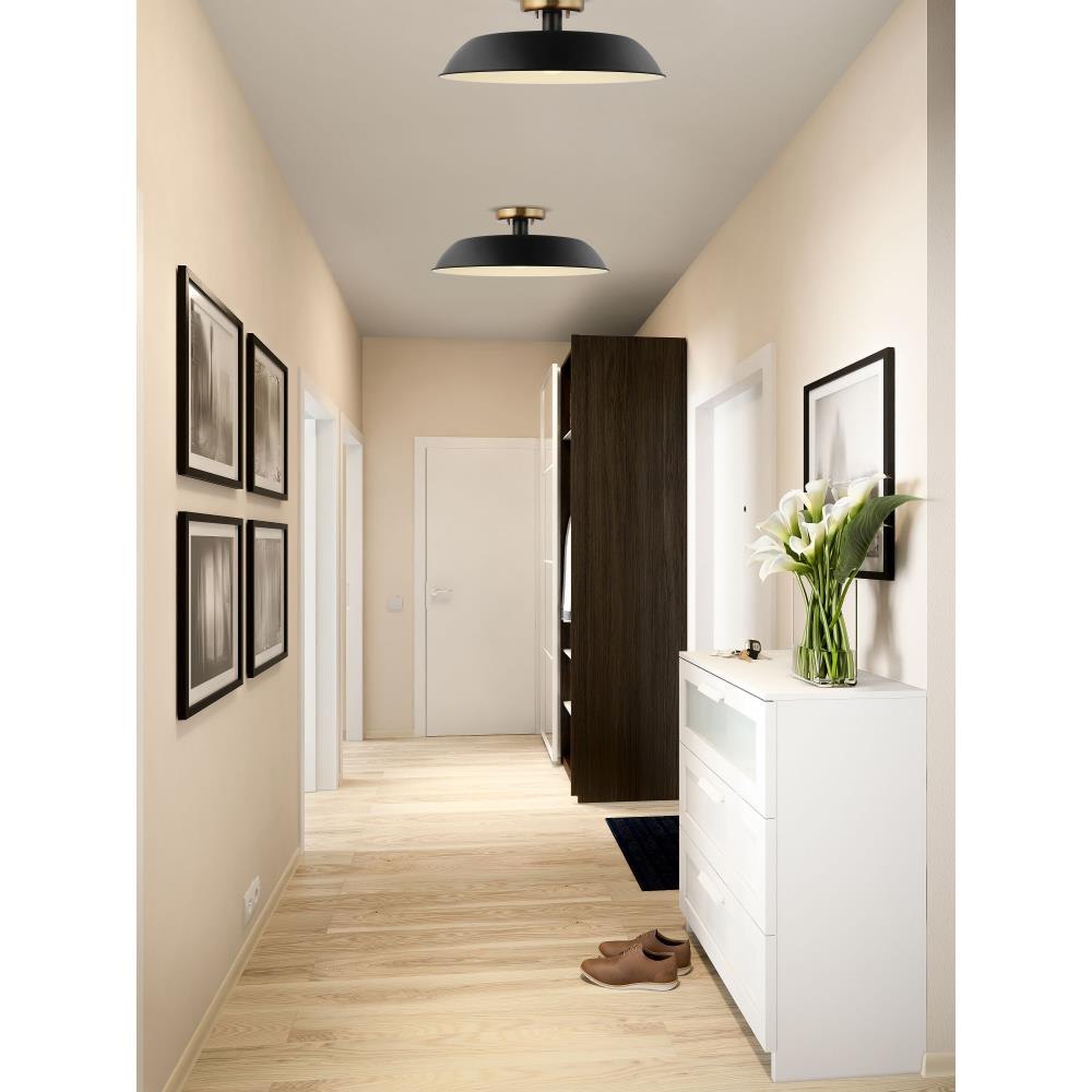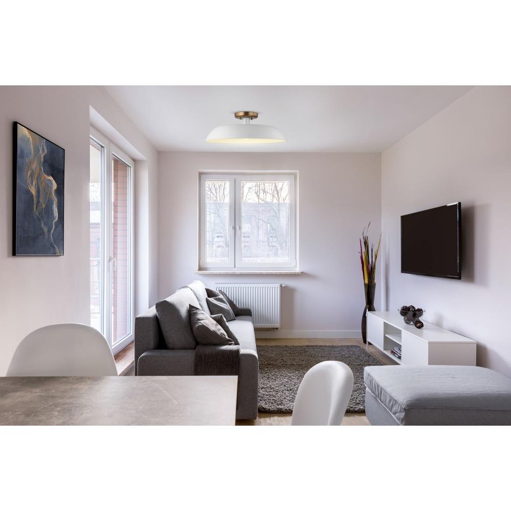 Designed with neutral, clean lines, the Colony 60-7493 medium semi-flush is ideal for an eat-in kitchen, entryway, hallway, and even a bedroom. The loft-style shallow pan metal shade is done in matte white, with a matching interior to reflect the downfacing lamp. The burnished brass finish on the canopy adds an elegant touch to this flexible design.Uses one 60-watt incandescent medium base bulbFixture measures 19.875 inch diameter x 7 inch heightRated for indoor use in dry locationsFinished in matte white with burnished brass accents and matching metal shadeMounting hardware and installation instructions includedLimited one year fixture warranty.