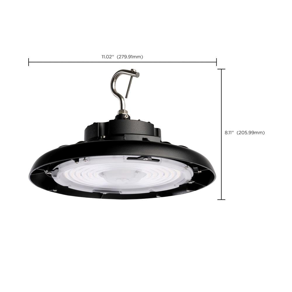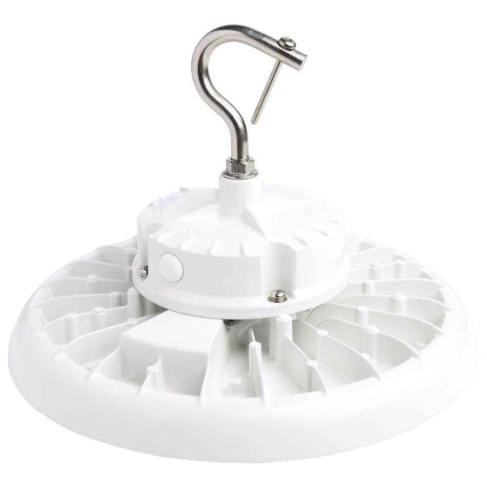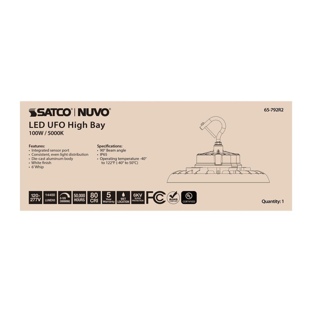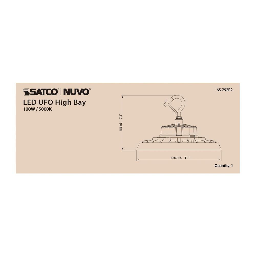 Satco's 65-781R2 100-watt, 4000K, black UFO LED High Bay offers superior value and meets the needs of numerous applications. A few add-ons that are available for purchase for this item include a pendant adapter, emergency battery back-up, protective wire guard, and a microwave sensor. This product also features dimming capabilities, 6KV surge protection, is wet location rated, and is also DLC Premium 5.1 listed.