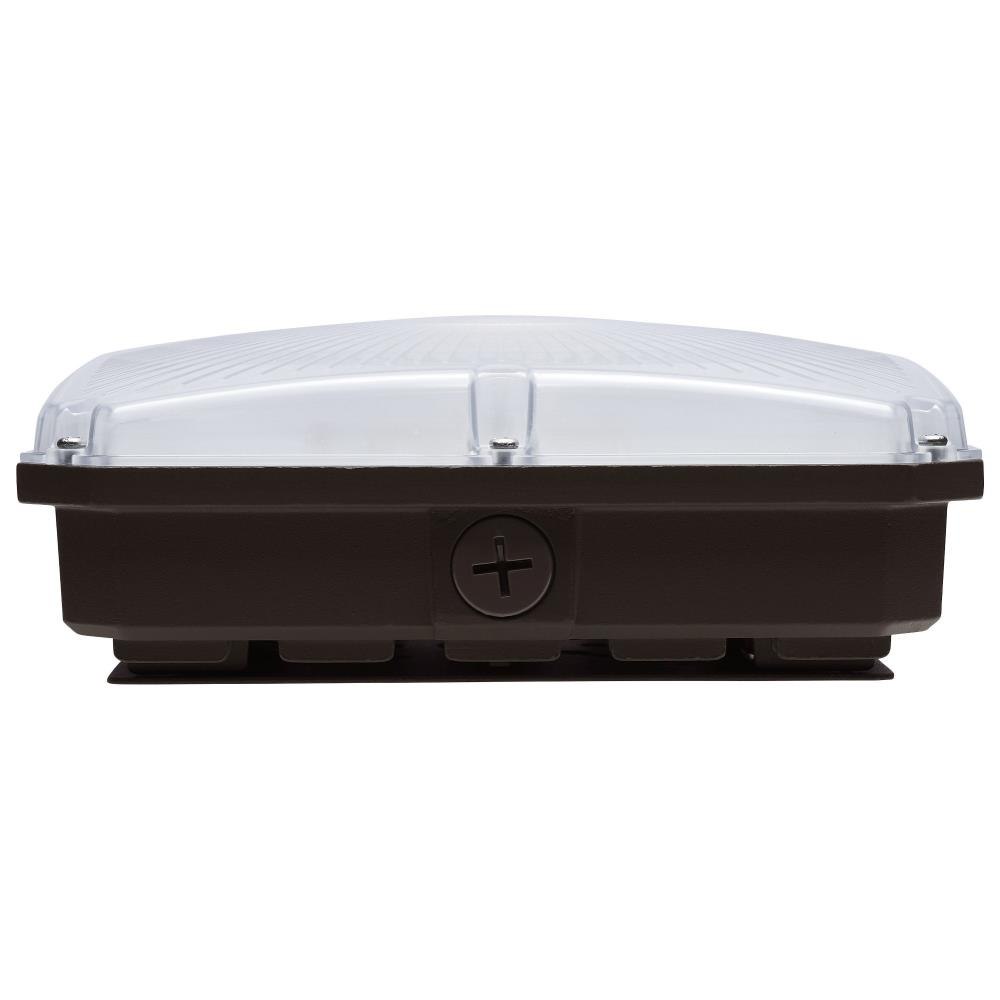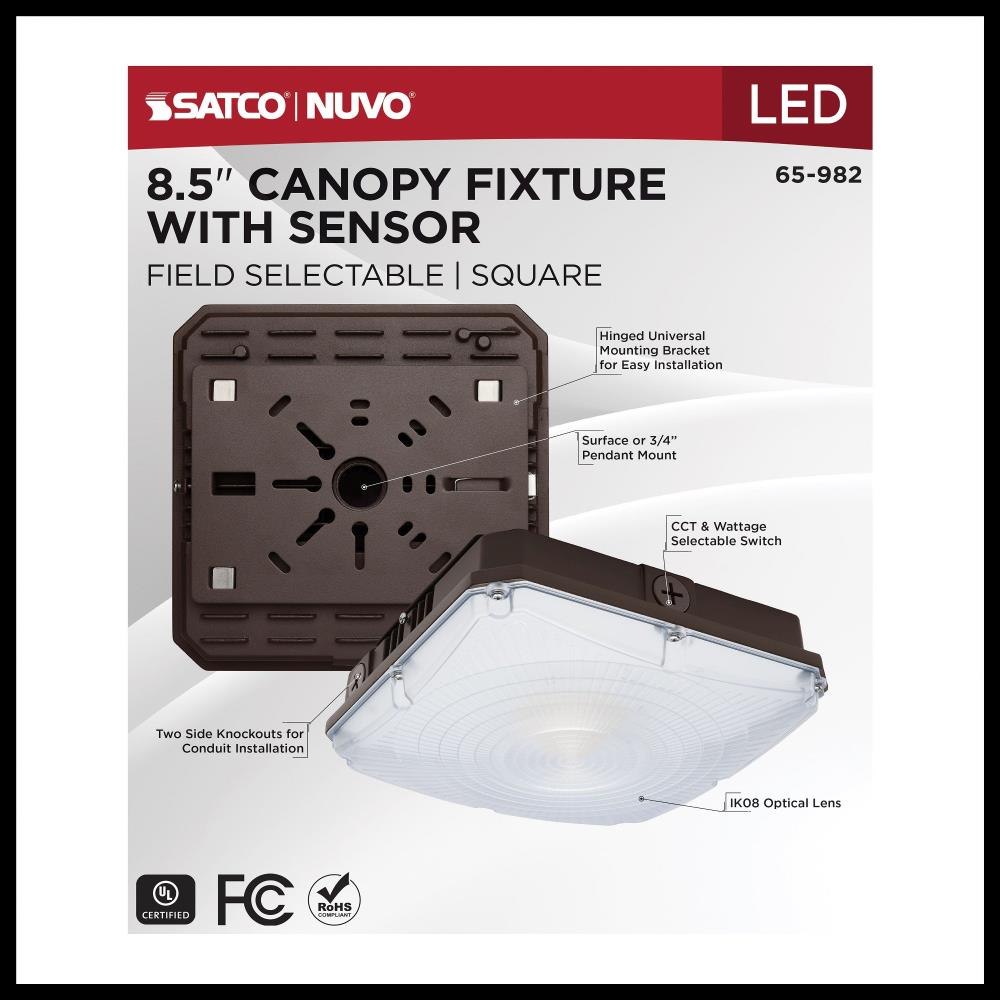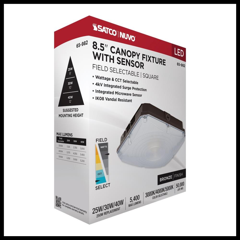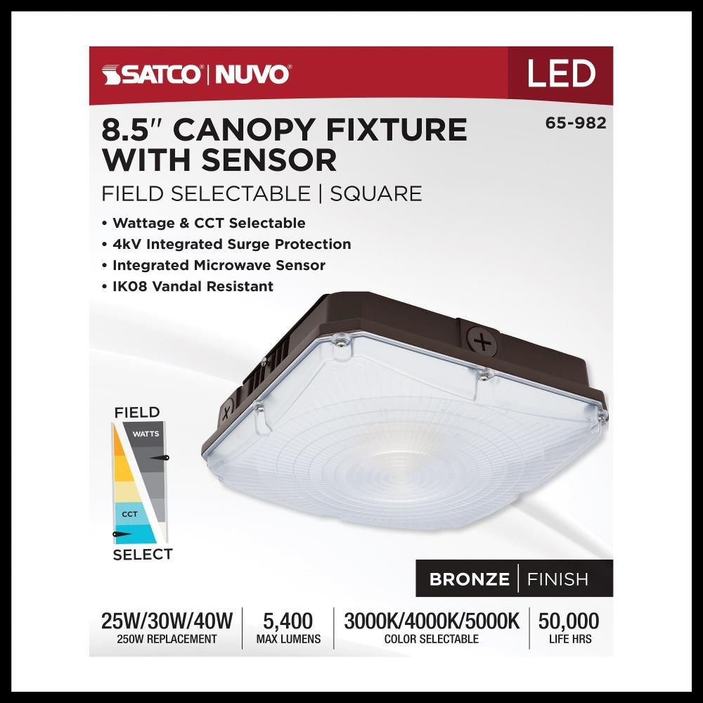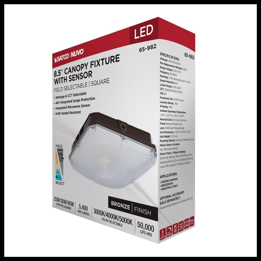 SATCO|NUVO's 65-982 Field Selectable 8.5-inch square canopy fixture is an ideal choice for multiple applications. This fixture gives users the flexibility to choose from three wattage and three CCT options during installation. It also features an integrated microwave sensor, enhancing energy efficiency and providing added functionality. With a choice of surface mounting using the hinged universal bracket or 3/4-inch pendant mounting, installation of this luminary is a breeze. The two side knockouts allow for wiring access to be fast and efficient. The sleek bronze die-cast aluminum housing, the IK08 impact-rated vandal-resistant polycarbonate lens, and the IP65 wet location rating ensure reliable illumination even in the most adverse weather conditions.