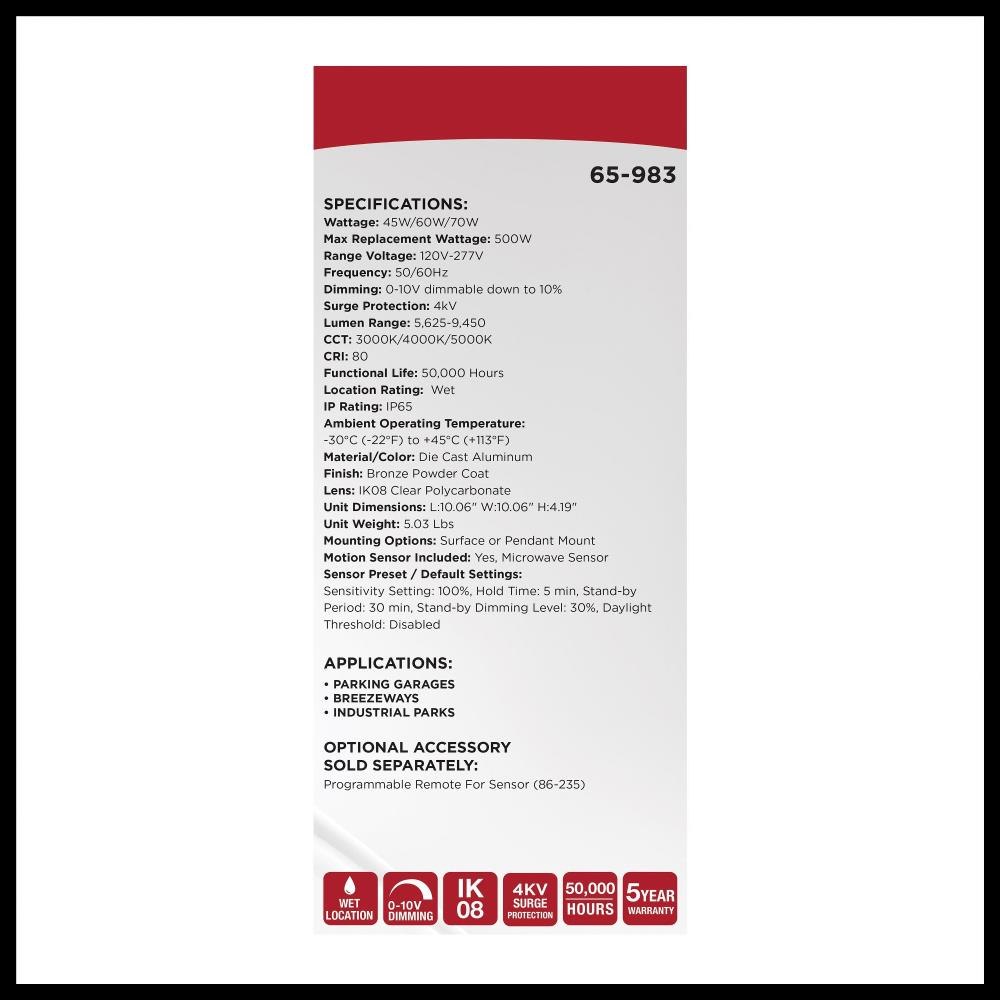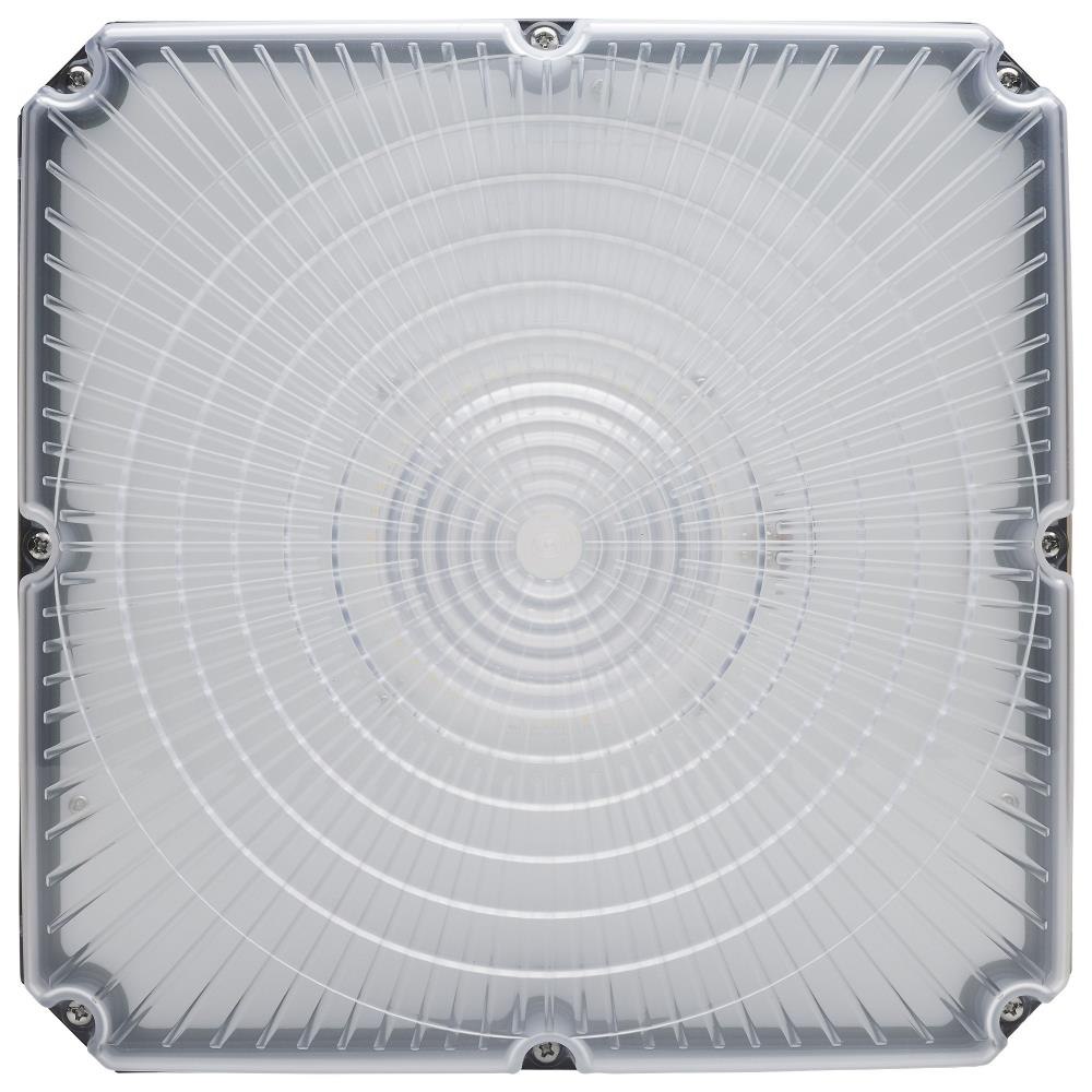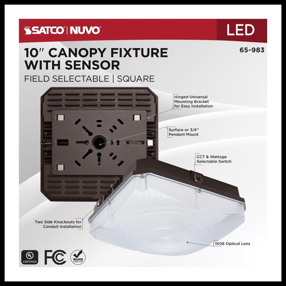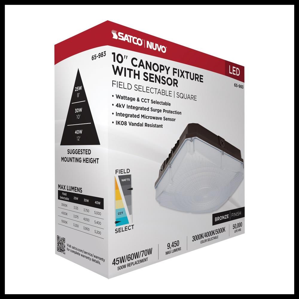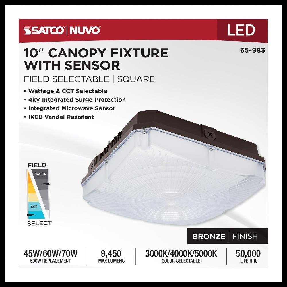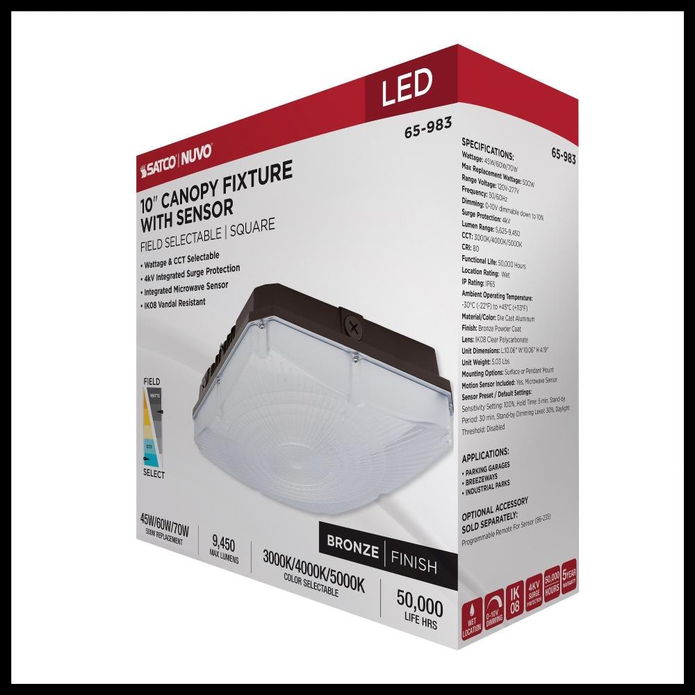 SATCO|NUVO's 65-983 Field Selectable 10 inch square canopy fixture is an ideal choice for multiple applications. This fixture gives users the flexibility to choose from three wattage and three CCT options during installation. It also features an integrated microwave sensor, enhancing energy efficiency and providing added functionality. With a choice of surface mounting using the hinged universal bracket or 3/4-inch pendant mounting, installation of this luminary is a breeze. The two side knockouts allow for wiring access to be fast and efficient. The sleek bronze die-cast aluminum housing, the IK08 impact-rated vandal-resistant polycarbonate lens, and the IP65 wet location rating ensure reliable illumination even in the most adverse weather conditions.